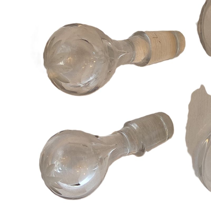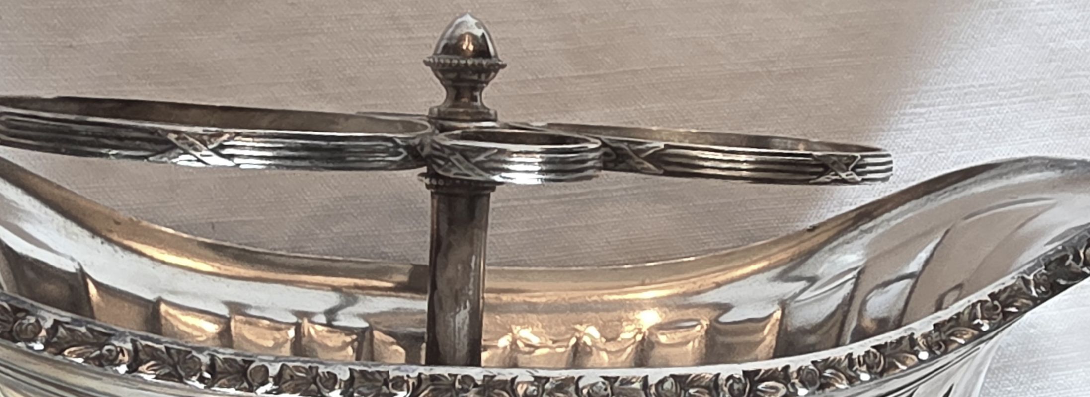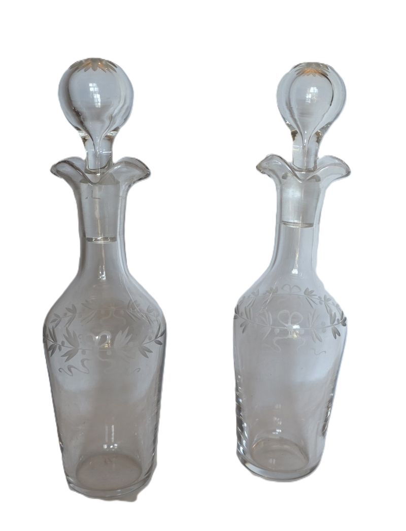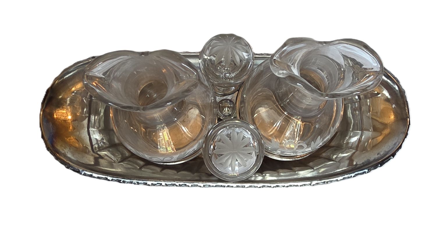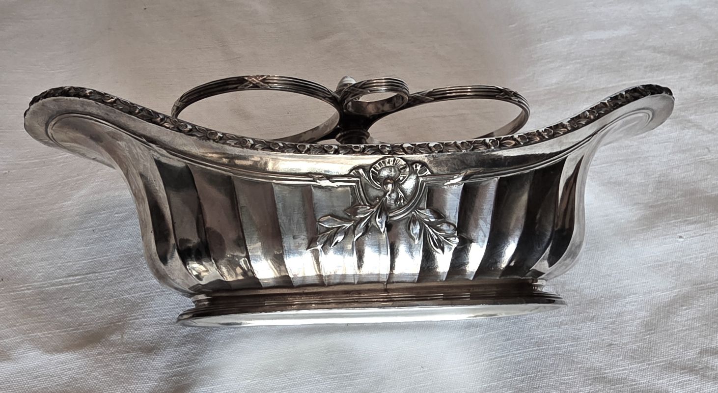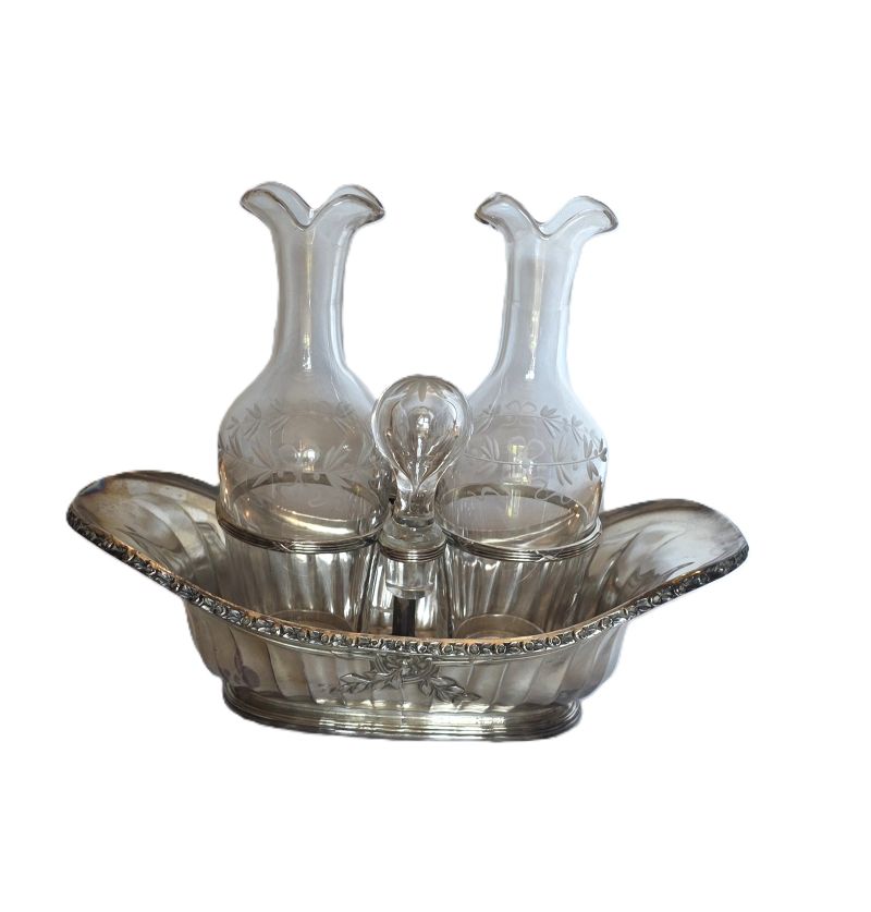 Bel ensemble , cruet (huilier et vinaigrier) comprend 2 burettes en cristal gravé à décor de guirlandes nouées et d’étoiles sur le haut des bouchons. Support en métal argenté orné de frises de roses, feuilles de laurier nouees de rubans. Etat impeccable ! Très belle qualité signée de l’orfèvre GALLIA France sous la base . Début XXème