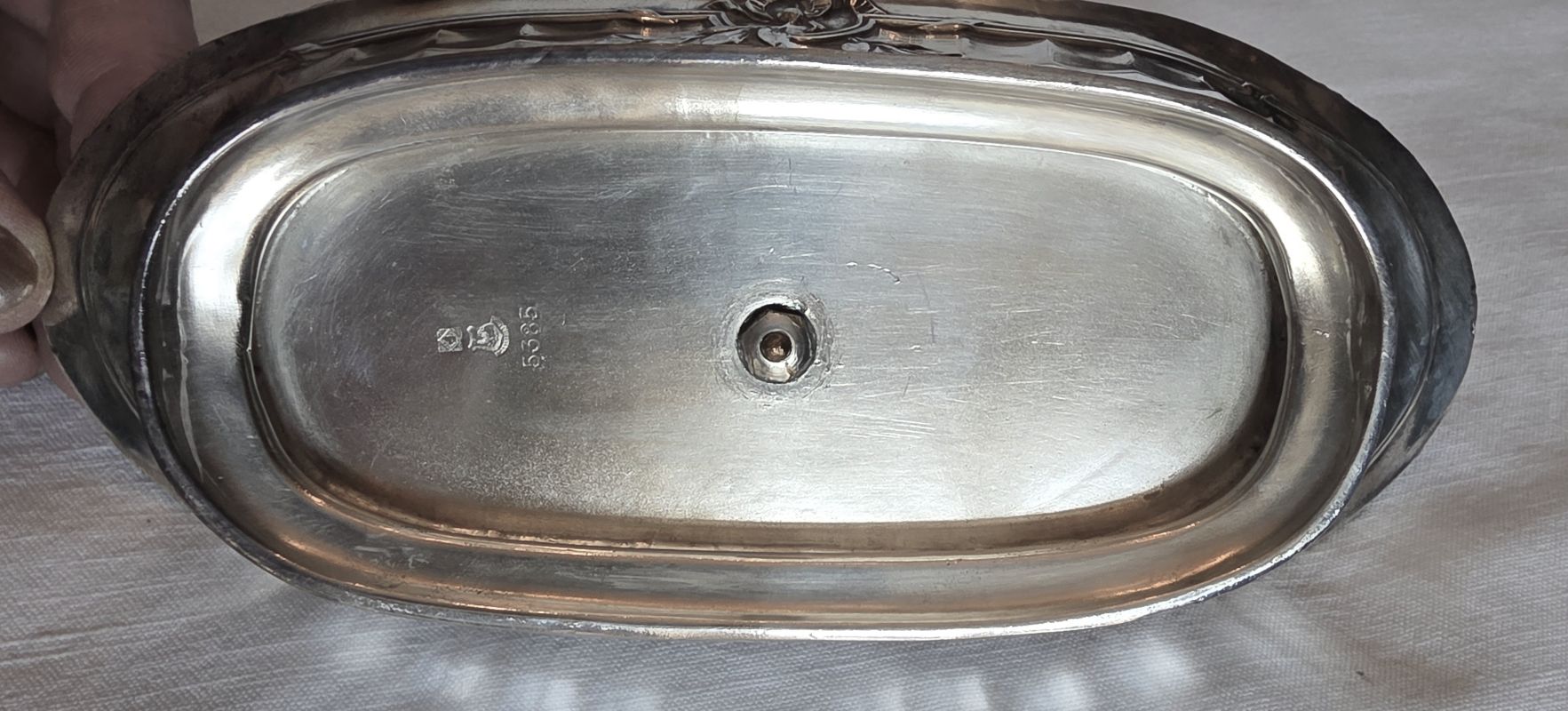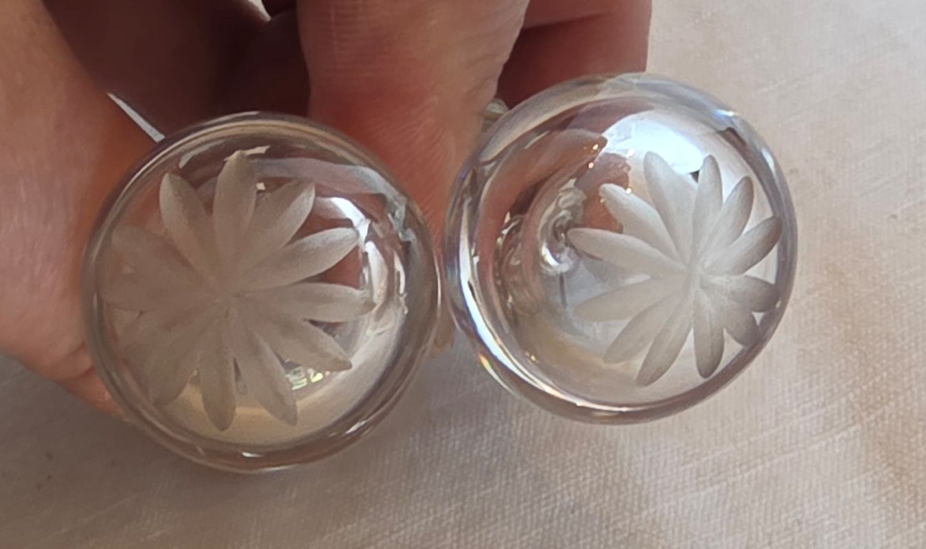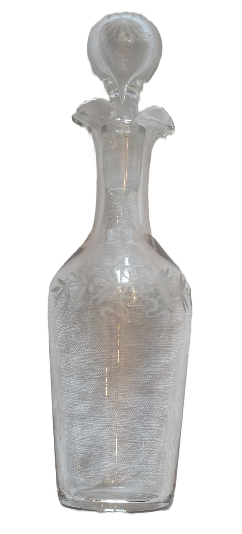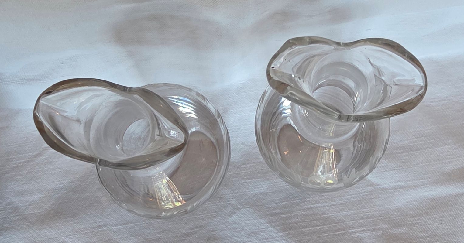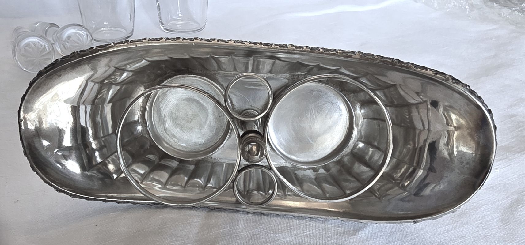 Bel ensemble , cruet (huilier et vinaigrier) comprend 2 burettes en cristal gravé à décor de guirlandes nouées et d’étoiles sur le haut des bouchons. Support en métal argenté orné de frises de roses, feuilles de laurier nouees de rubans. Etat impeccable ! Très belle qualité signée de l’orfèvre GALLIA France sous la base . Début XXème