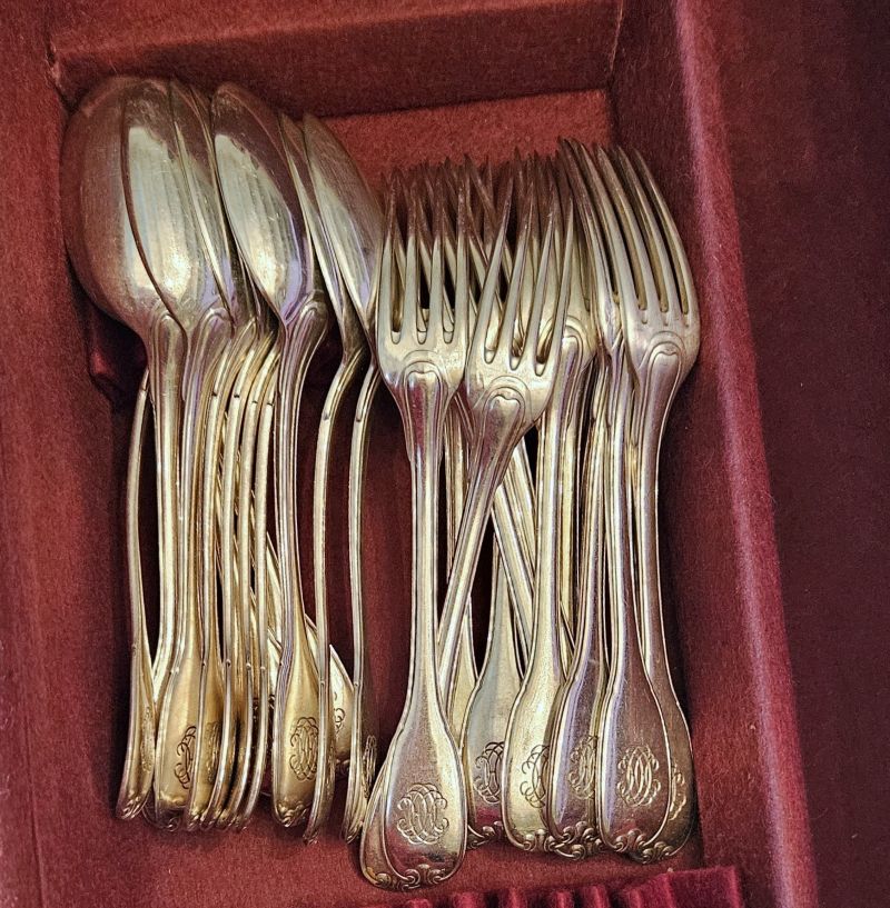Coffret a 2 tiroirs contenant une partie de ménagère en argent massif poinçon Minerve, et en poinçon de maître E P séparé par un canif pour EmilePuiforçat. Tiroir en partie basse comprenant 12 cuillères a potage et 12 fourchettes de table, le tiroir en partie basse comprend 12 fourchettes a dessert et 12 cuillères a entremet ainsi qu’un coffret amovible renfermant 12 fourchettes et 12 couteaux à poisson. Toutes les pièces sont poinçonnées et frappées d’un monogramme au dos. Modèle très sobre et discret de très bonne facture. Poids total sans le coffret : 4,438kg