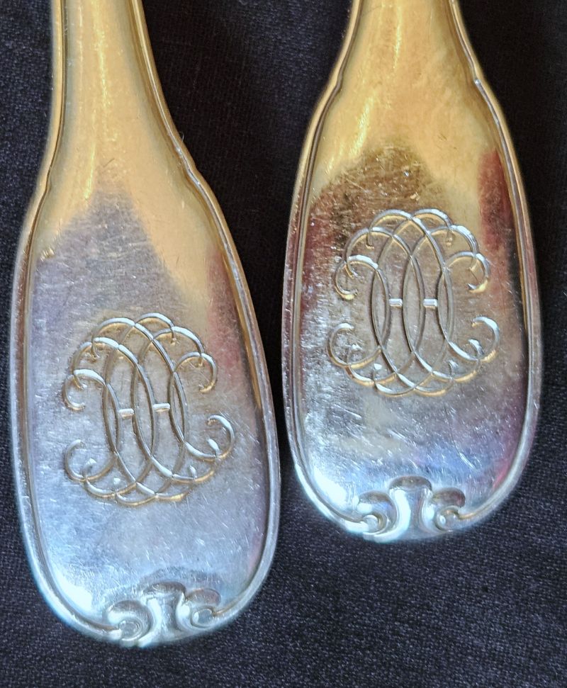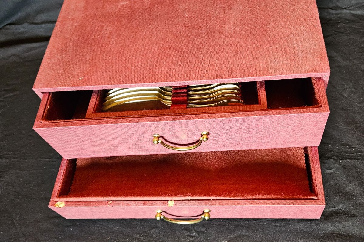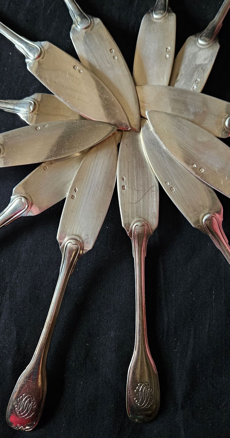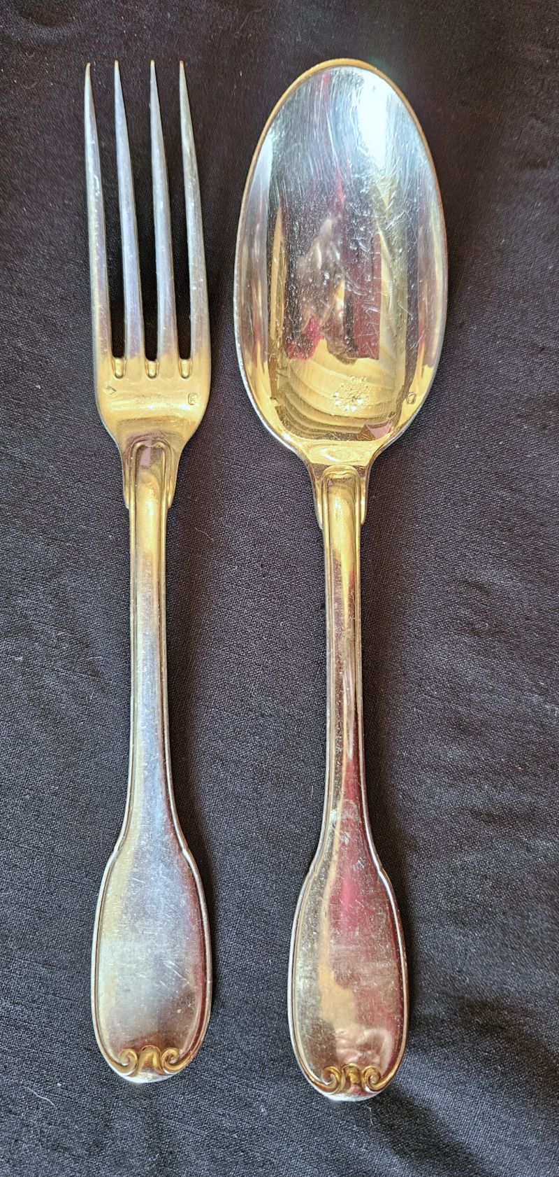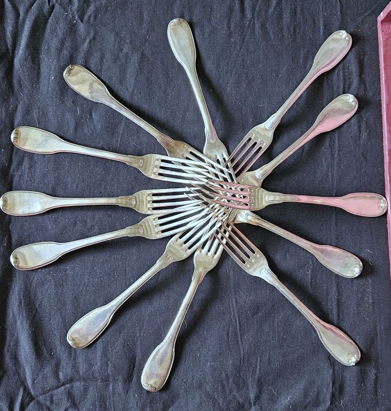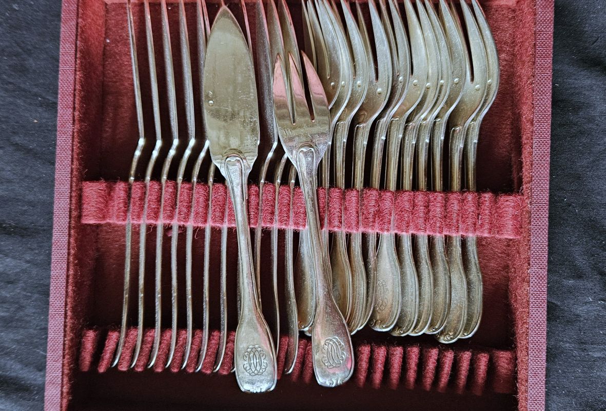 Coffret a 2 tiroirs contenant une partie de ménagère en argent massif poinçon Minerve, et en poinçon de maître E P séparé par un canif pour EmilePuiforçat. Tiroir en partie basse comprenant 12 cuillères a potage et 12 fourchettes de table, le tiroir en partie basse comprend 12 fourchettes a dessert et 12 cuillères a entremet ainsi qu’un coffret amovible renfermant 12 fourchettes et 12 couteaux à poisson. Toutes les pièces sont poinçonnées et frappées d’un monogramme au dos. Modèle très sobre et discret de très bonne facture. Poids total sans le coffret : 4,438kg