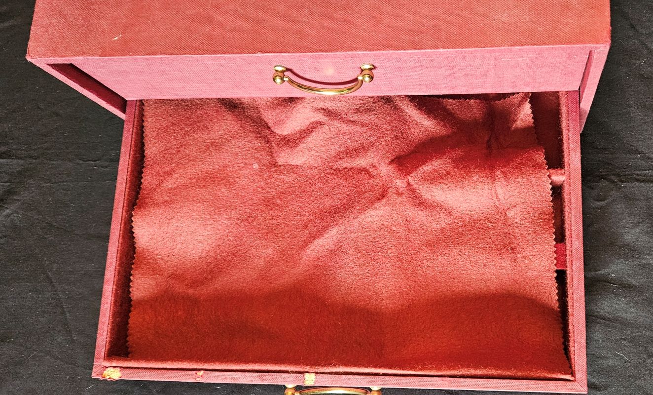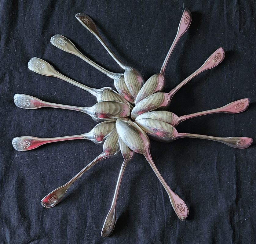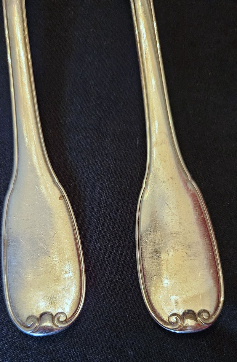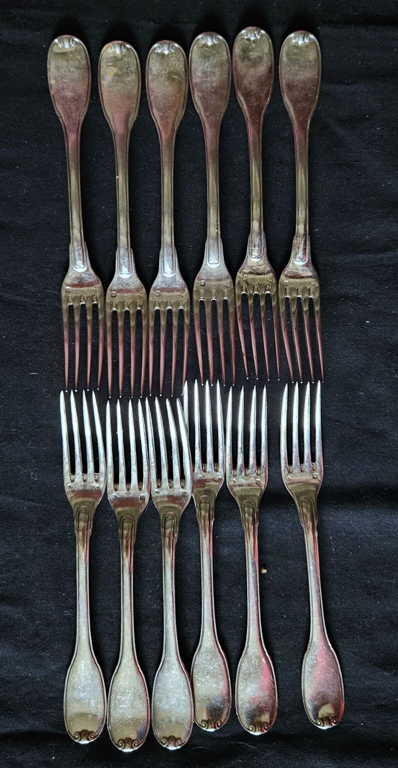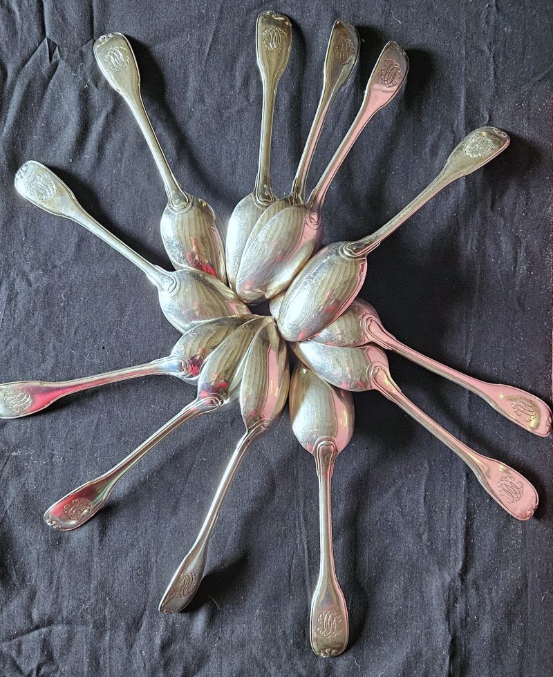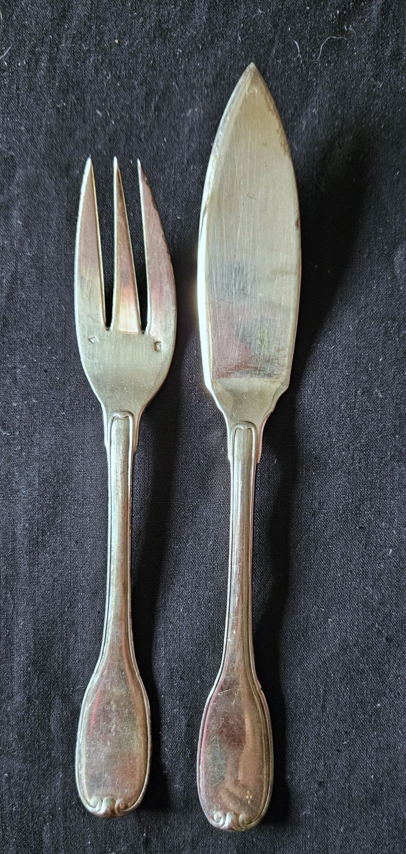 Coffret a 2 tiroirs contenant une partie de ménagère en argent massif poinçon Minerve, et en poinçon de maître E P séparé par un canif pour EmilePuiforçat. Tiroir en partie basse comprenant 12 cuillères a potage et 12 fourchettes de table, le tiroir en partie basse comprend 12 fourchettes a dessert et 12 cuillères a entremet ainsi qu’un coffret amovible renfermant 12 fourchettes et 12 couteaux à poisson. Toutes les pièces sont poinçonnées et frappées d’un monogramme au dos. Modèle très sobre et discret de très bonne facture. Poids total sans le coffret : 4,438kg