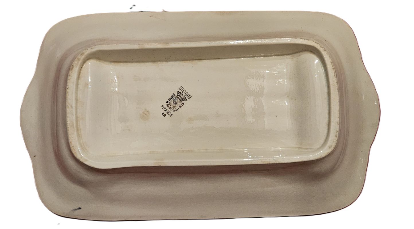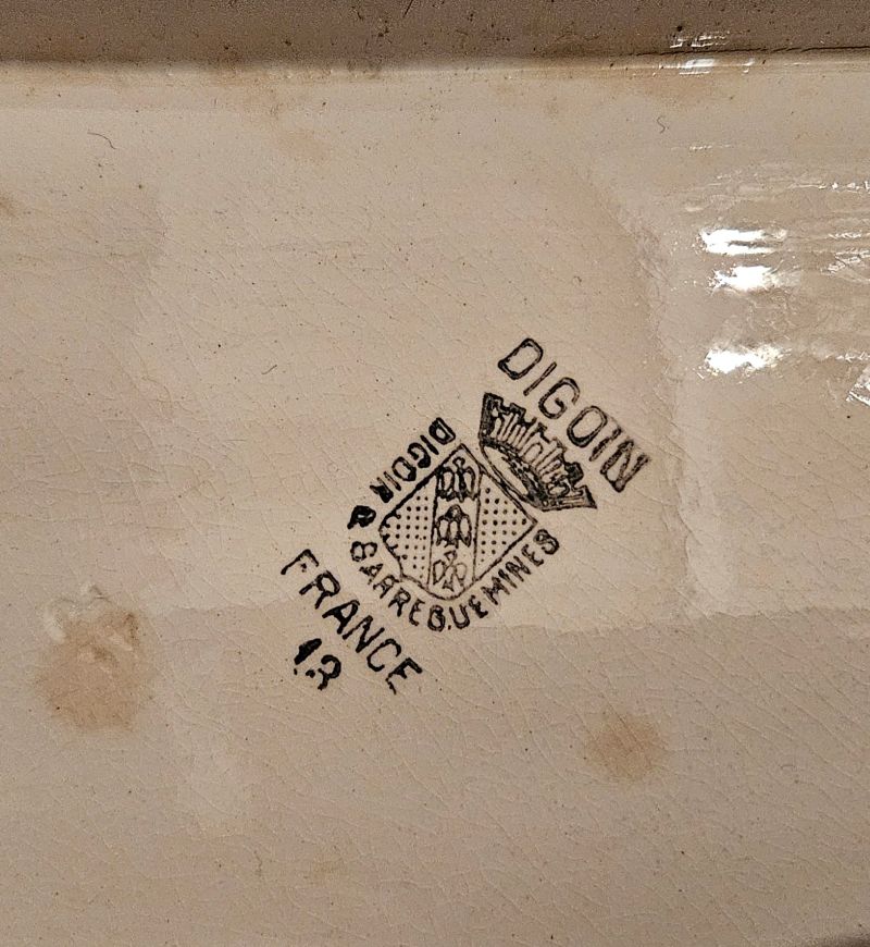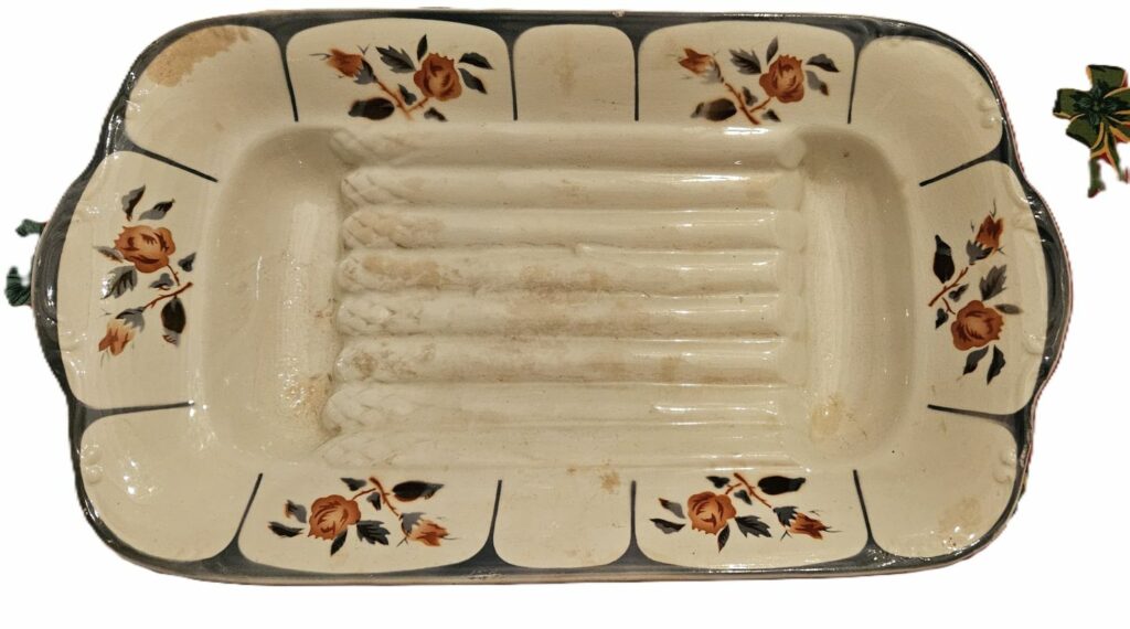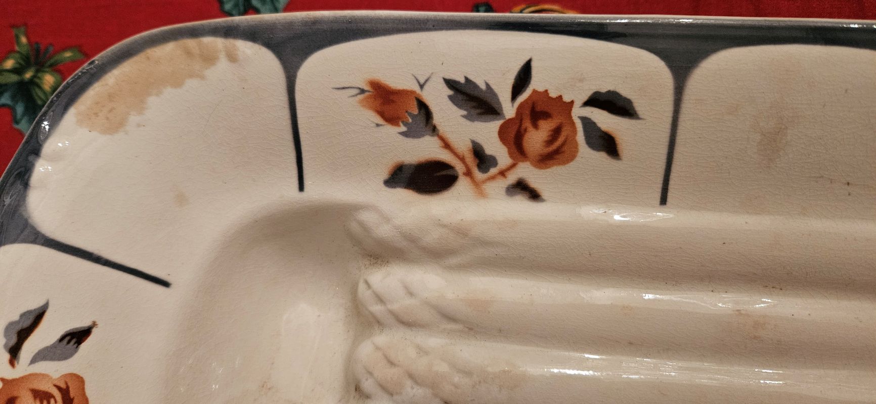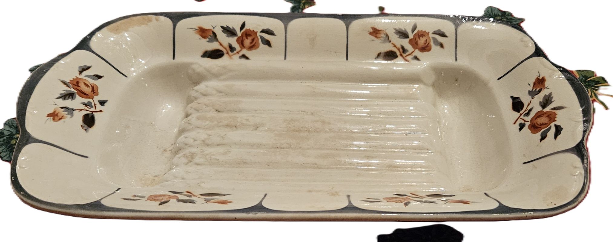 Ancien plat à asperges en barbotine faïence de Sarreguemines. Bon état avec des taches mais pas de fèle ni éclat.