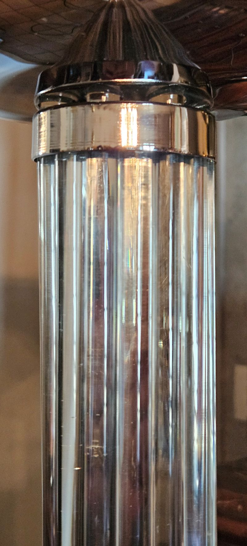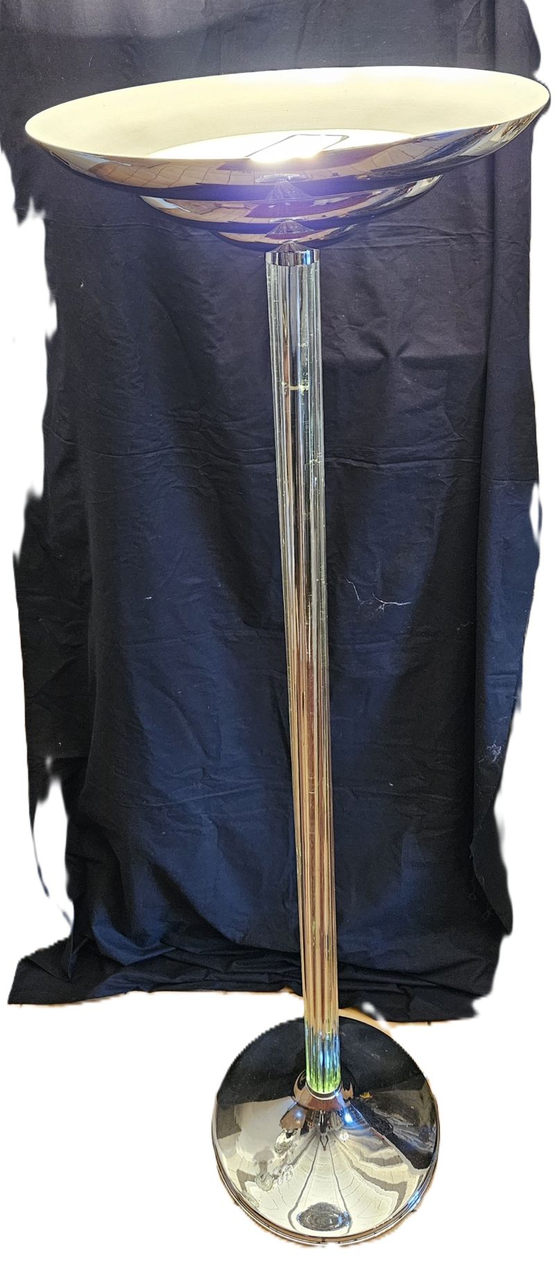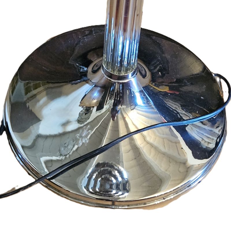 Original et superbe, lorsqu’il est allumé, les tubes de verre s’illuminent et crééent une douce ambiance. Magnifique lampadaire halogène au design de G. FRATTINI pour RELCO Italie. Large coupole chromée reposant sur un pied circulaire garni de tiges de verre, et se terminant par un large pied chromé lesté. Il s’allume grâce à un variateur à pied estampillé de la marque RELCO. Fonctionne parfaitement. Quelques petits éclats sur certaines tiges non visibles car dissimulés dans la base du pied.
