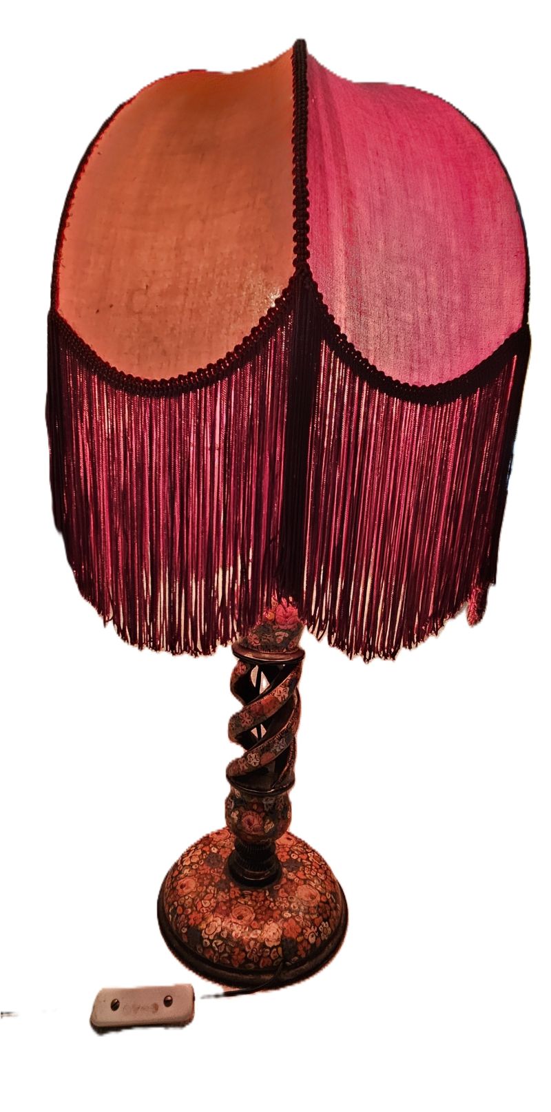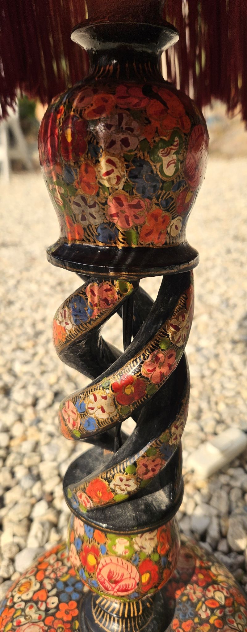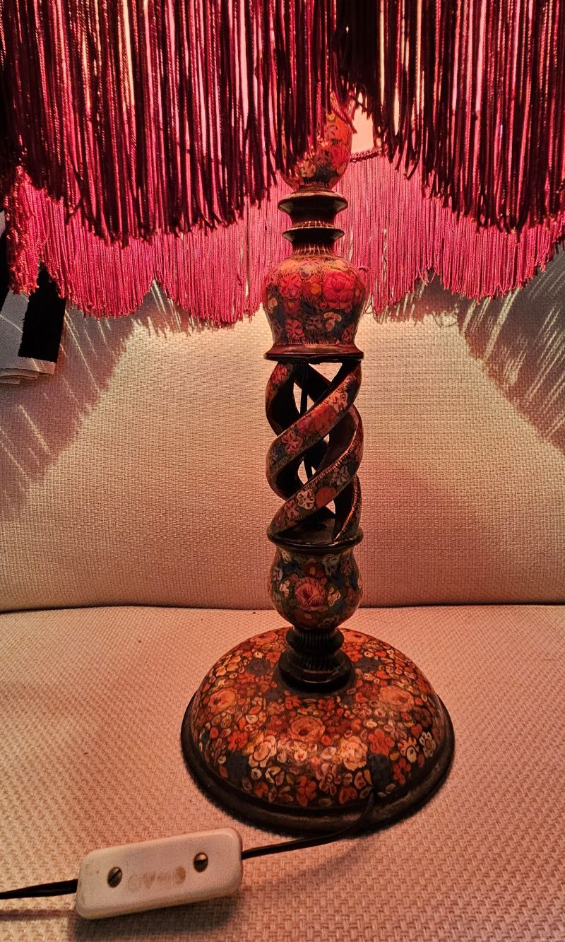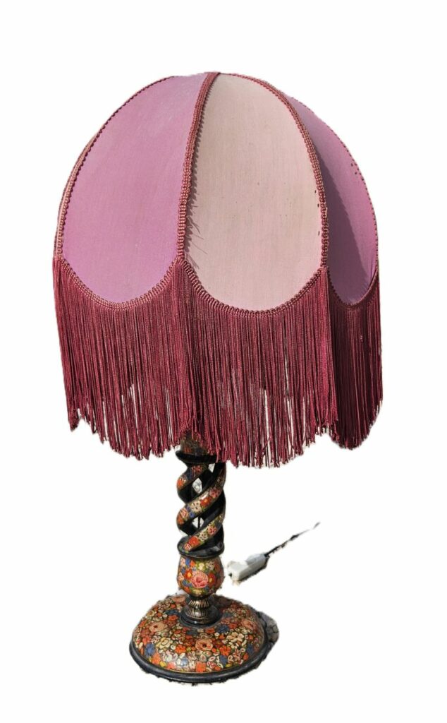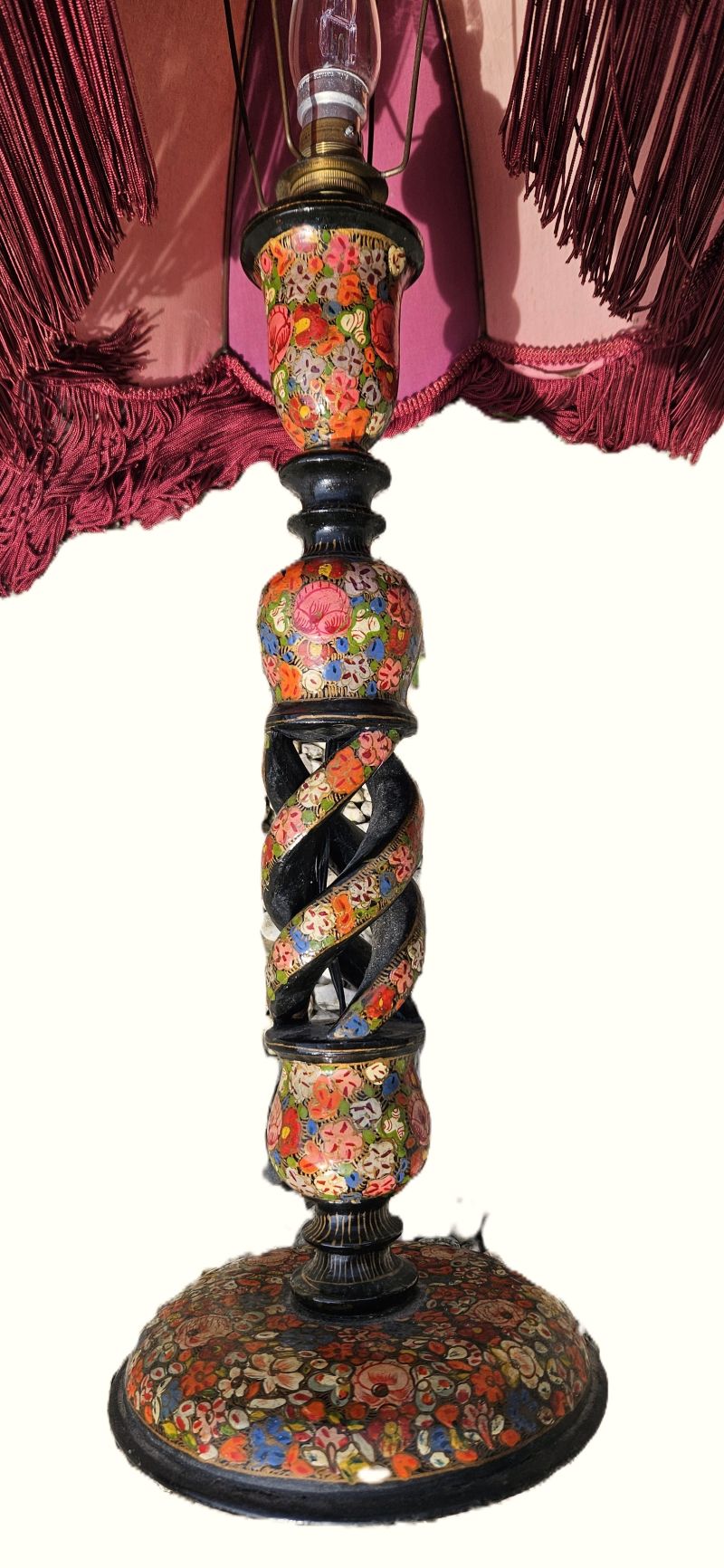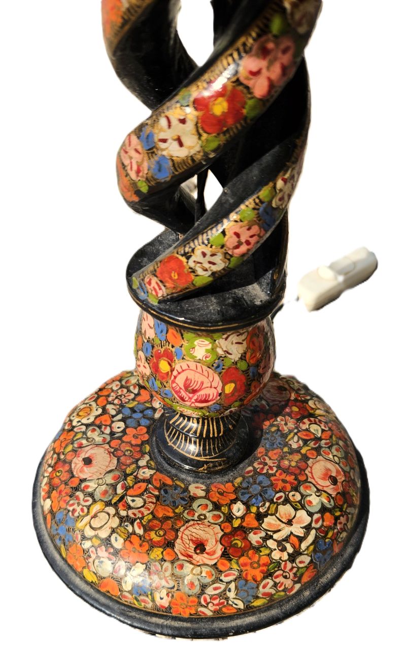 Originale lampe Kashmiri – Inde- en bois torsadé et papier maché. En bois très léger finement sculpté et ajouré , le pied est délicatement peint à la main de motifs floraux. A noter un fêle sur une des trois torsades. L’abat-jour est dans son jus avec de petits trous. Cependant, lorsque la lampe est allumée, il se dégage une douce lumière tamisée, très apaisante. Bon état. Vers 1890