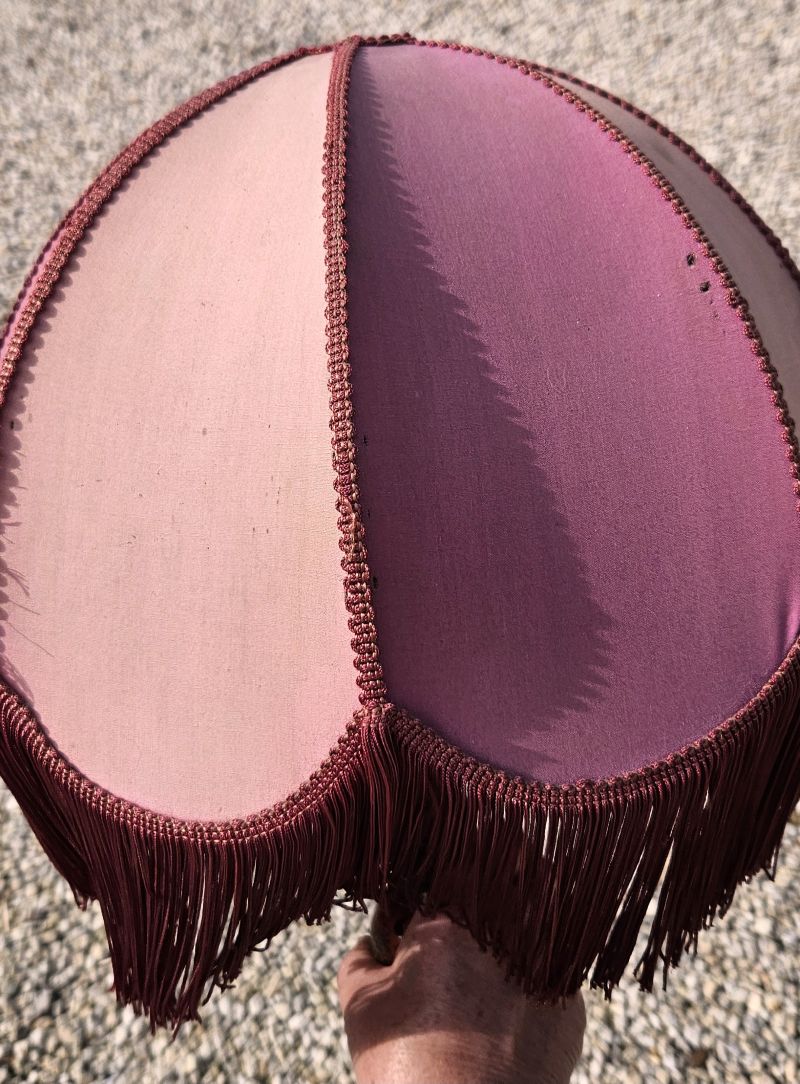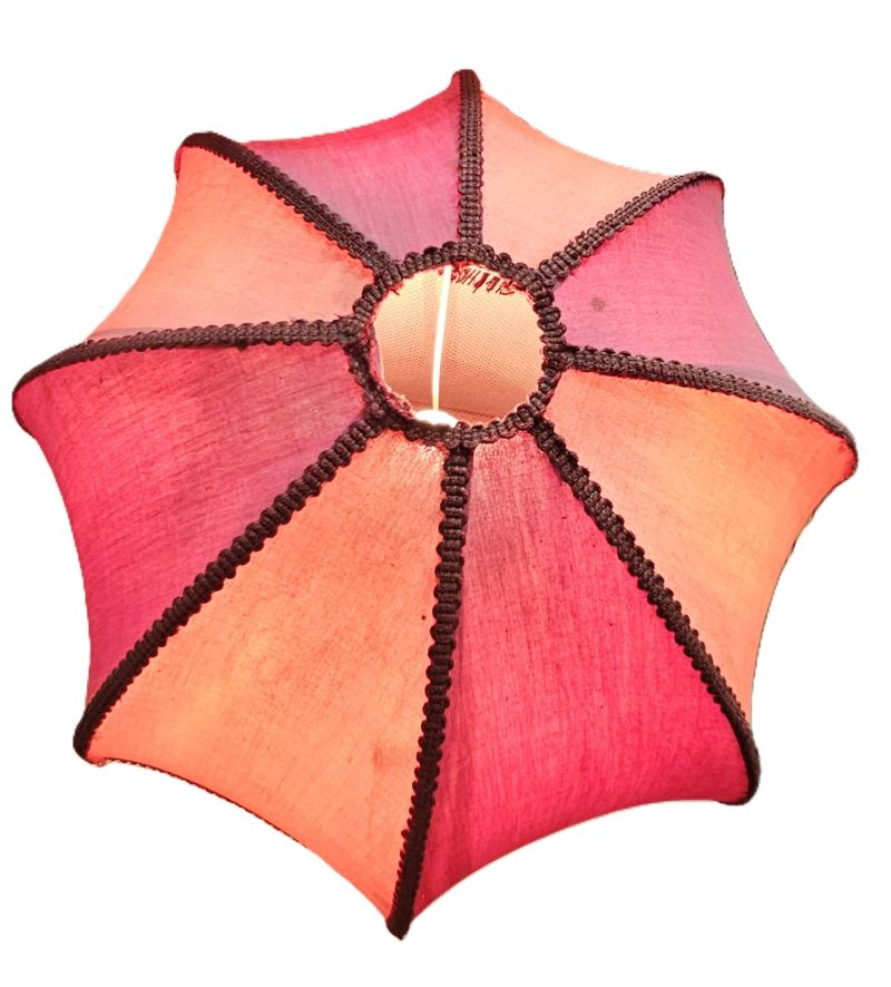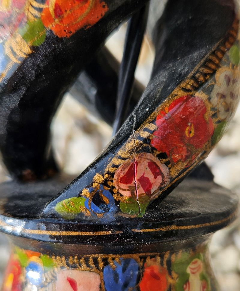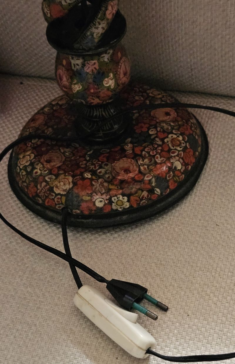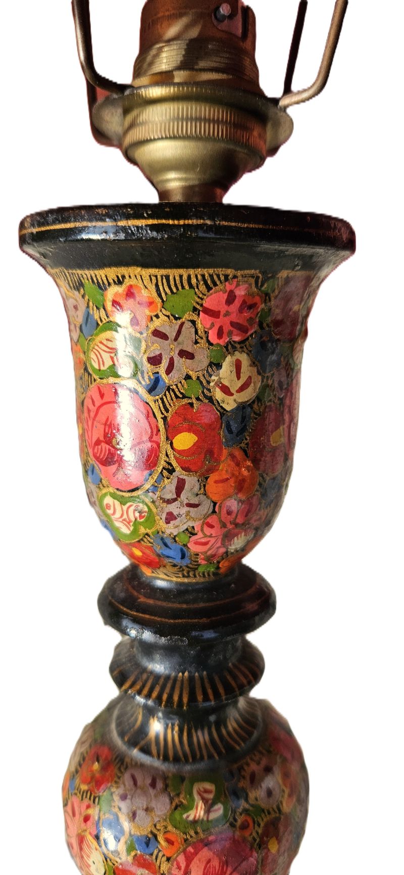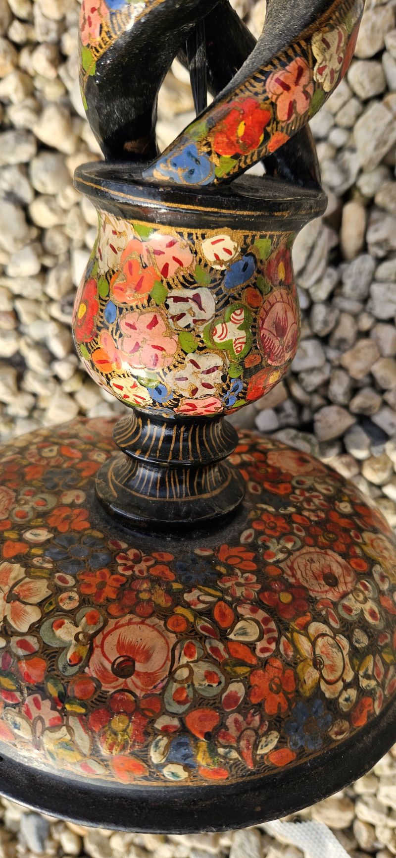 Originale lampe Kashmiri – Inde- en bois torsadé et papier maché. En bois très léger finement sculpté et ajouré , le pied est délicatement peint à la main de motifs floraux. A noter un fêle sur une des trois torsades. L’abat-jour est dans son jus avec de petits trous. Cependant, lorsque la lampe est allumée, il se dégage une douce lumière tamisée, très apaisante. Bon état. Vers 1890