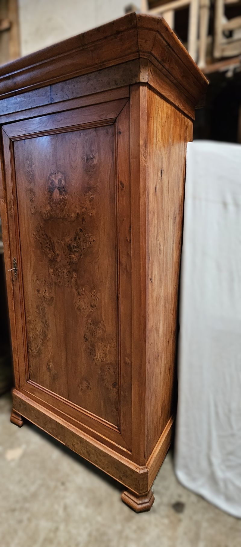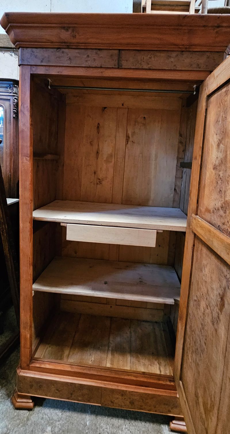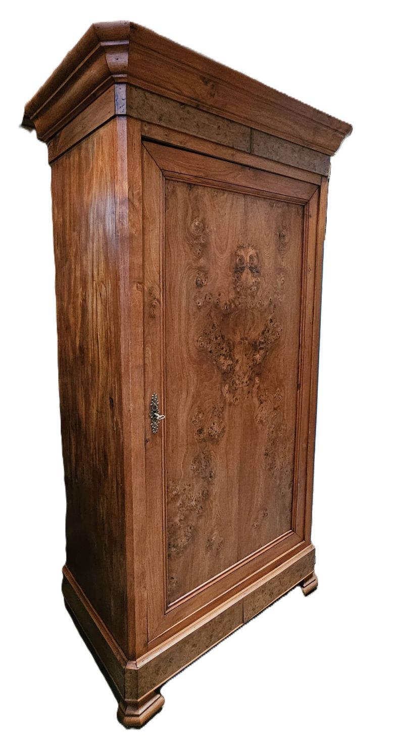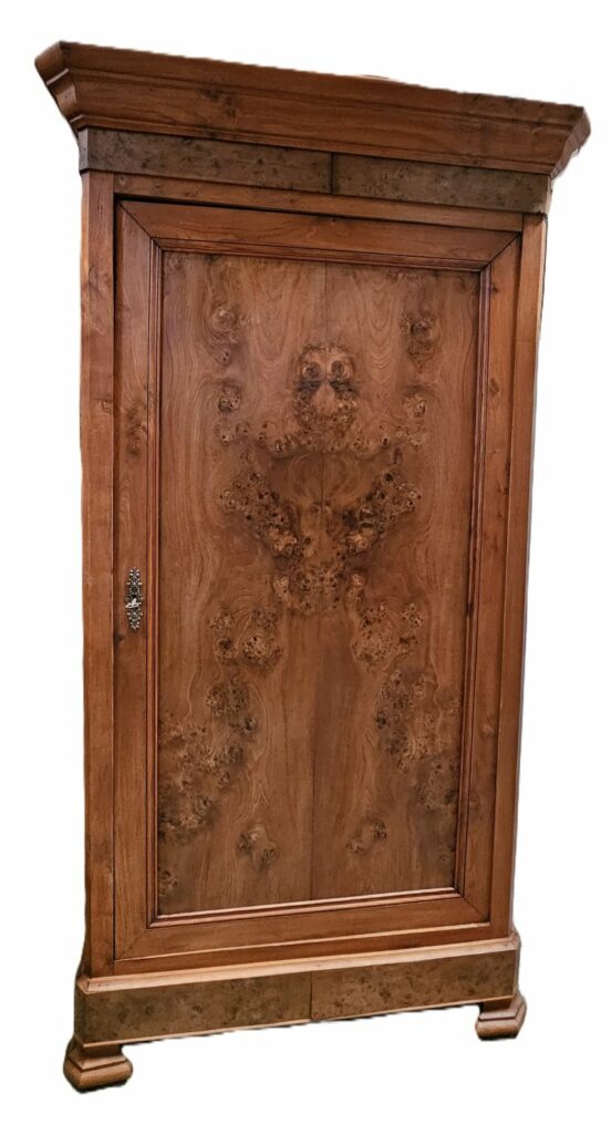Très jolie patine ancienne aux couleurs chaudes pour cette bonnetière Louis Philippe en ronce de noyer. Surprenant dessin dans le centre de la porte. Pieds sabots en parfait état. Corniche à pans coupés. Intérieur garni de 2 étagères dont 1 avec un tiroir mais également d’une tringle pour la transformer en penderie. Son avantage, ses petites dimensions qui lui permettent de se placer facilement ! elle est XIXème