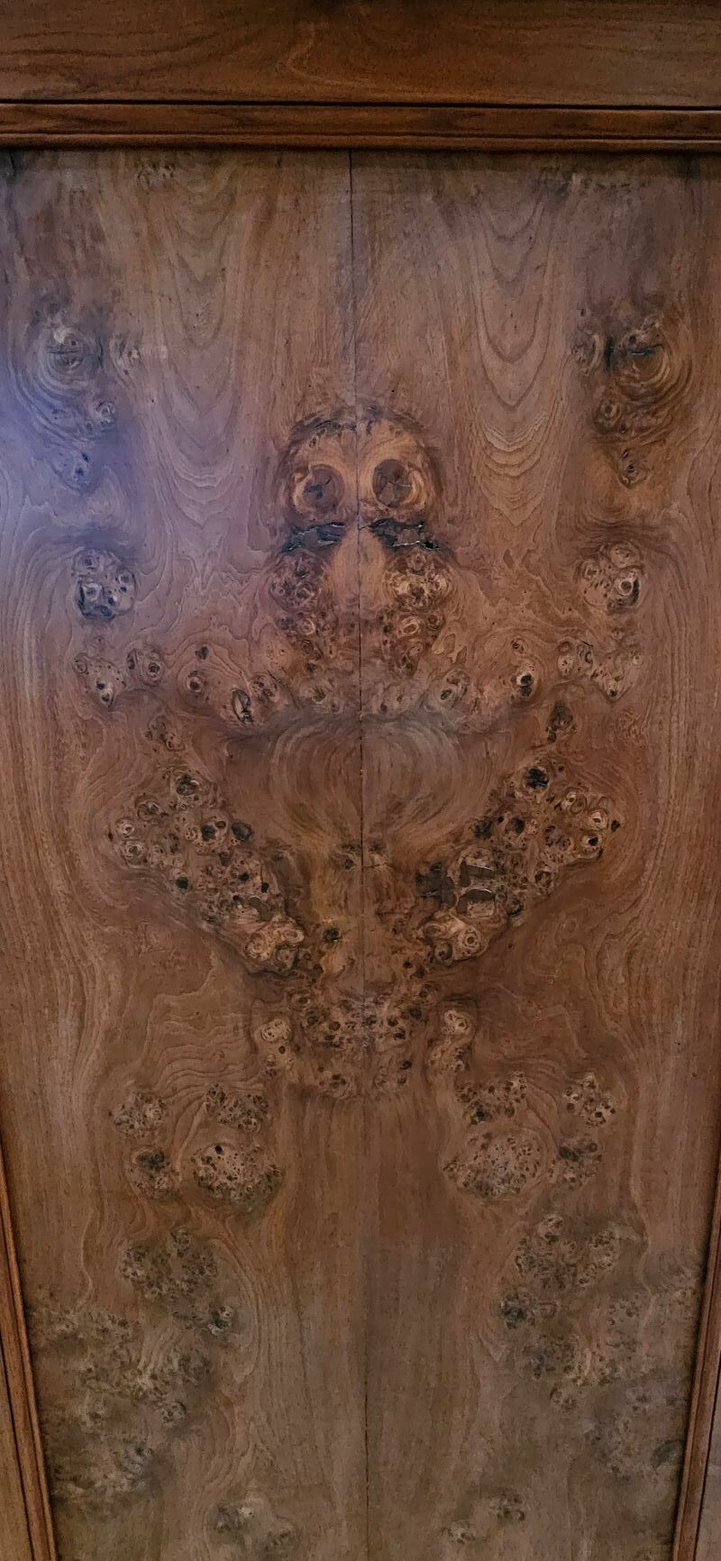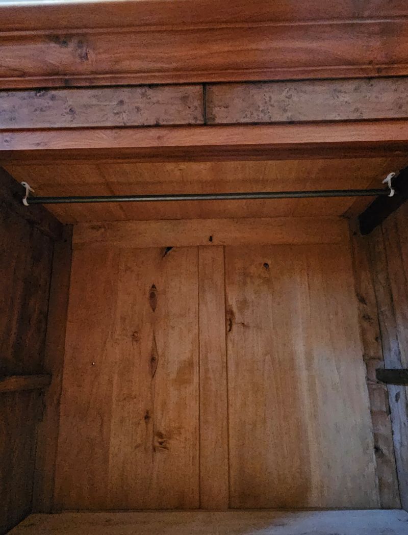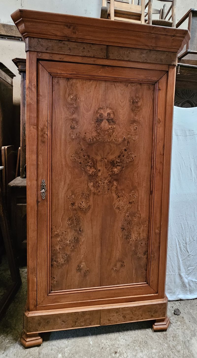 Très jolie patine ancienne aux couleurs chaudes pour cette bonnetière Louis Philippe en ronce de noyer. Surprenant dessin dans le centre de la porte. Pieds sabots en parfait état. Corniche à pans coupés. Intérieur garni de 2 étagères dont 1 avec un tiroir mais également d’une tringle pour la transformer en penderie. Son avantage, ses petites dimensions qui lui permettent de se placer facilement ! elle est XIXème