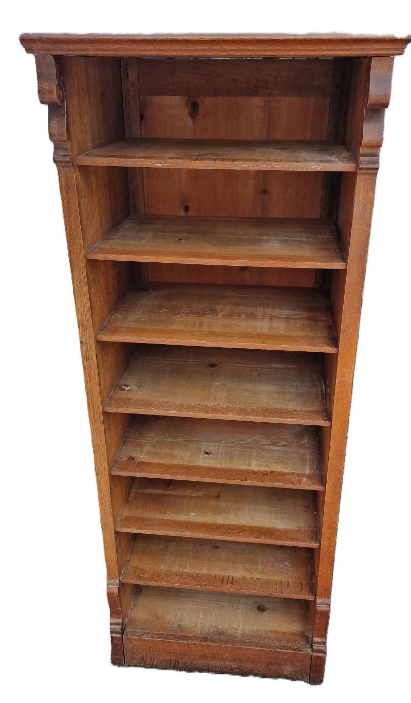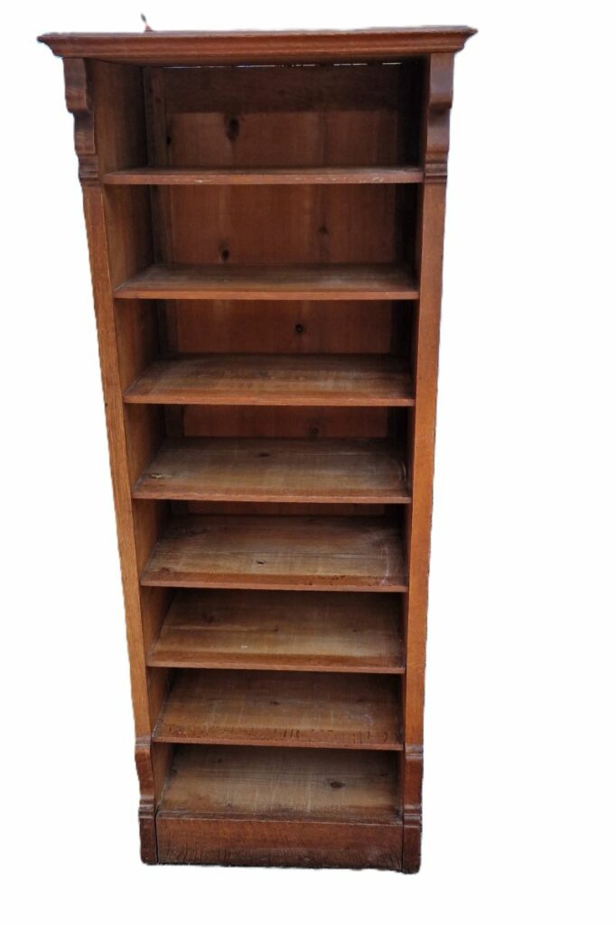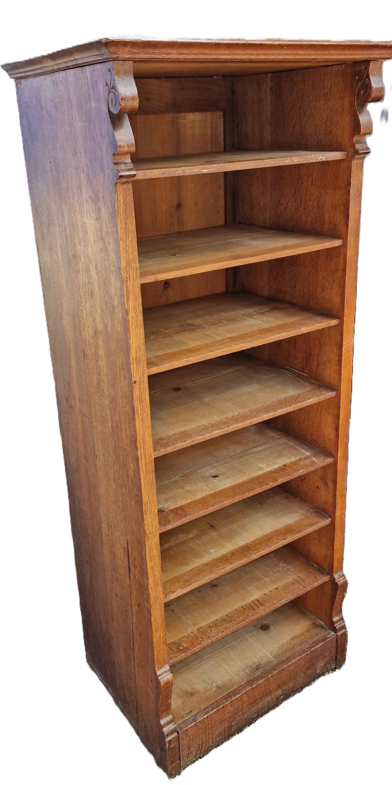 Etagère bibliothèque ou cartonnier en chêne clair a 7 étagères. La façade en partie haute et basse est mouvementée. Meuble très sobre et de petite largeur donc facilement logeable ! vers 1900