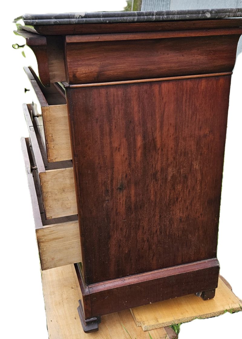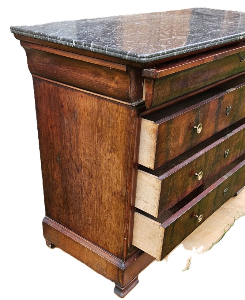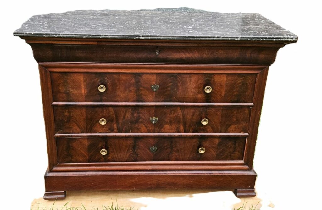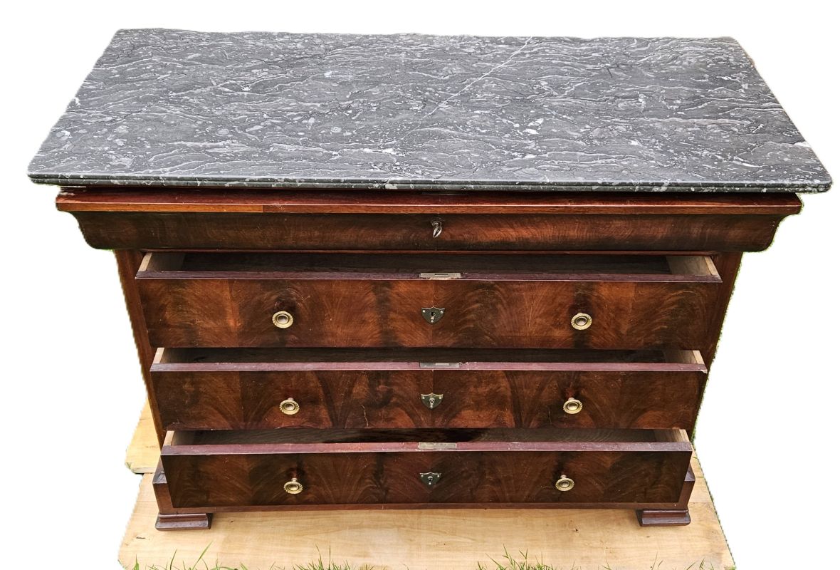 Commode de style Louis Philippe en acajou massif et placage acajou flammé ouvrant par 4 tiroirs. Les entrées de serrures sont ornées d’un blason en laiton et ouvrent par 2 poignées rondes en bronze doré. Plateau coiffé d’un marbre noir veiné a bec de corbin.Pieds sabots. Très joli veinage du bois aux teintes chaudes. Bon état. Fin XIXème.