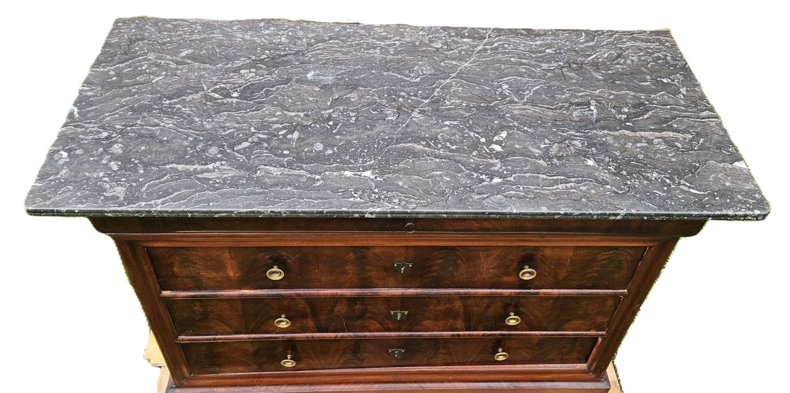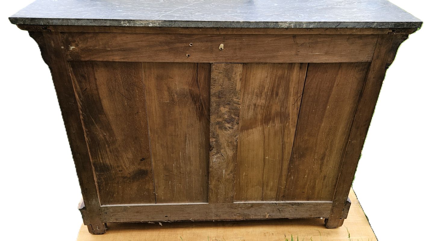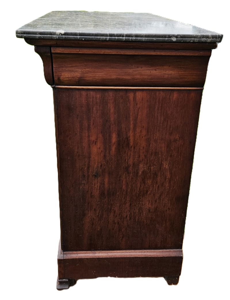 Commode de style Louis Philippe en acajou massif et placage acajou flammé ouvrant par 4 tiroirs. Les entrées de serrures sont ornées d’un blason en laiton et ouvrent par 2 poignées rondes en bronze doré. Plateau coiffé d’un marbre noir veiné a bec de corbin.Pieds sabots. Très joli veinage du bois aux teintes chaudes. Bon état. Fin XIXème.