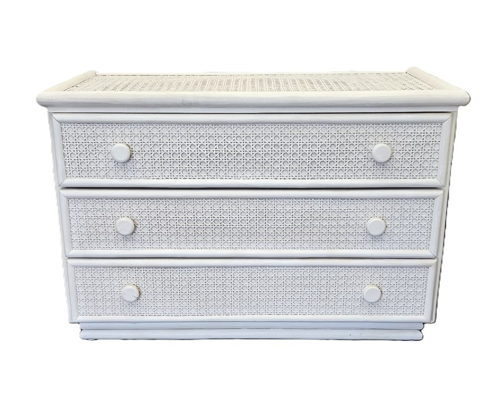 Jolie commode en rotin blanc ouvrant par 3 tiroirs vintage des années 1970/80. Elle est couverte de cannage sur les 2 côtés et sur le plateau. Le dos est en bois peint également en blanc. Très belle qualité !