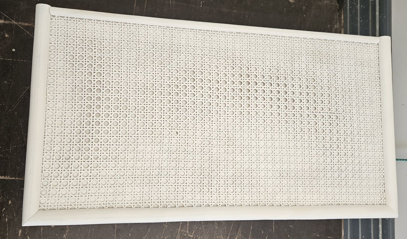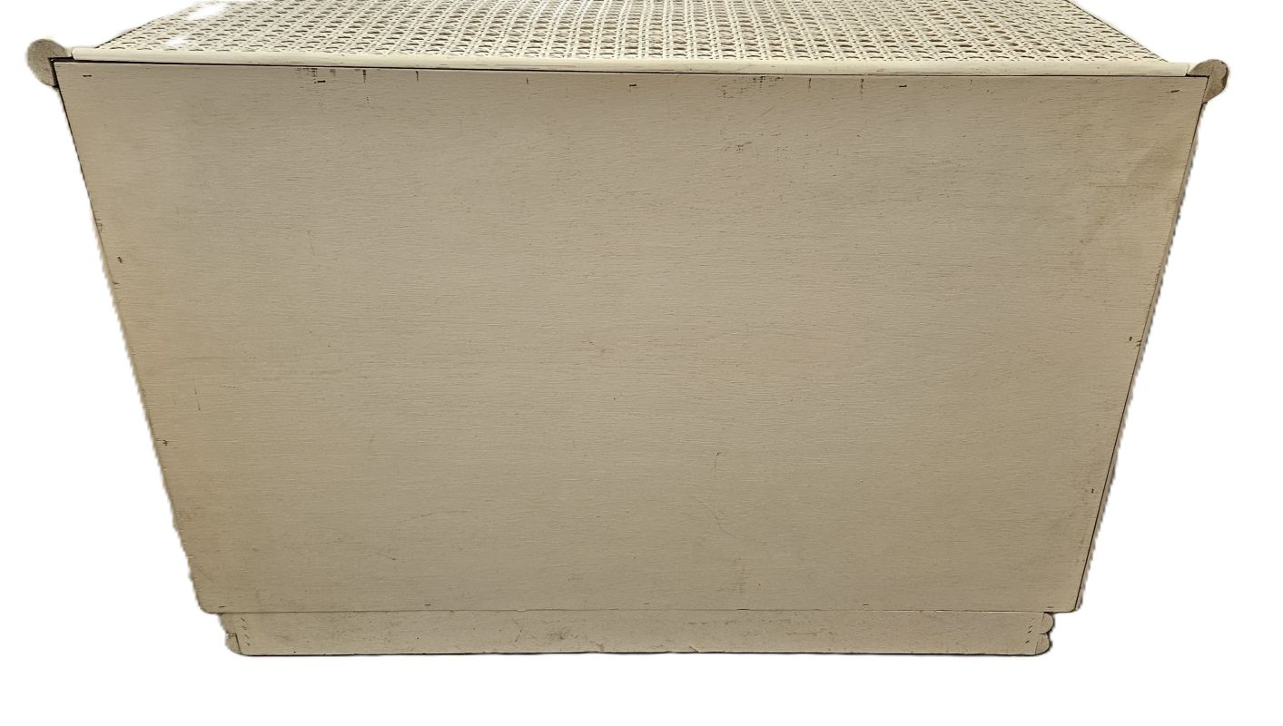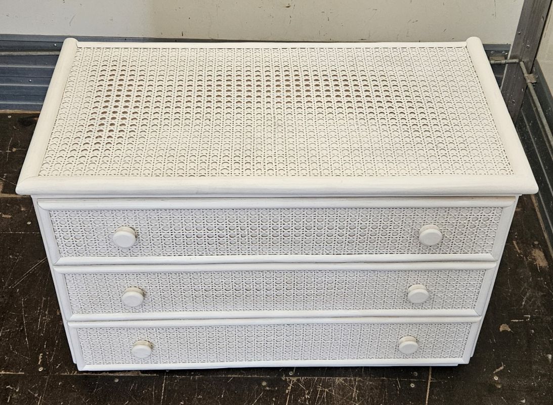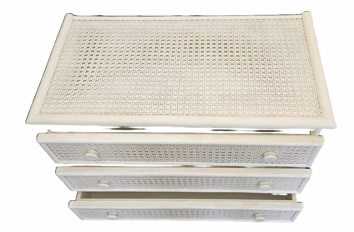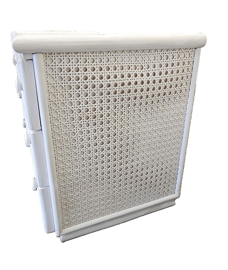 Jolie commode en rotin blanc ouvrant par 3 tiroirs vintage des années 1970/80. Elle est couverte de cannage sur les 2 côtés et sur le plateau. Le dos est en bois peint également en blanc. Très belle qualité !