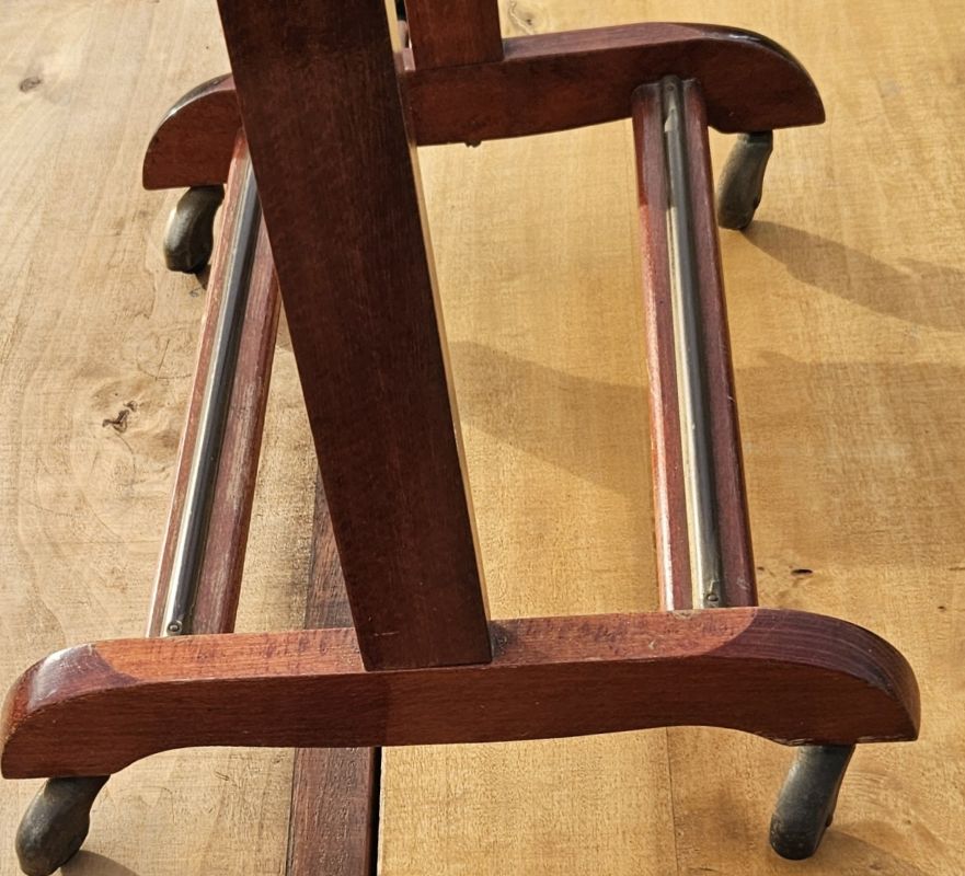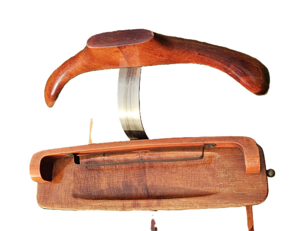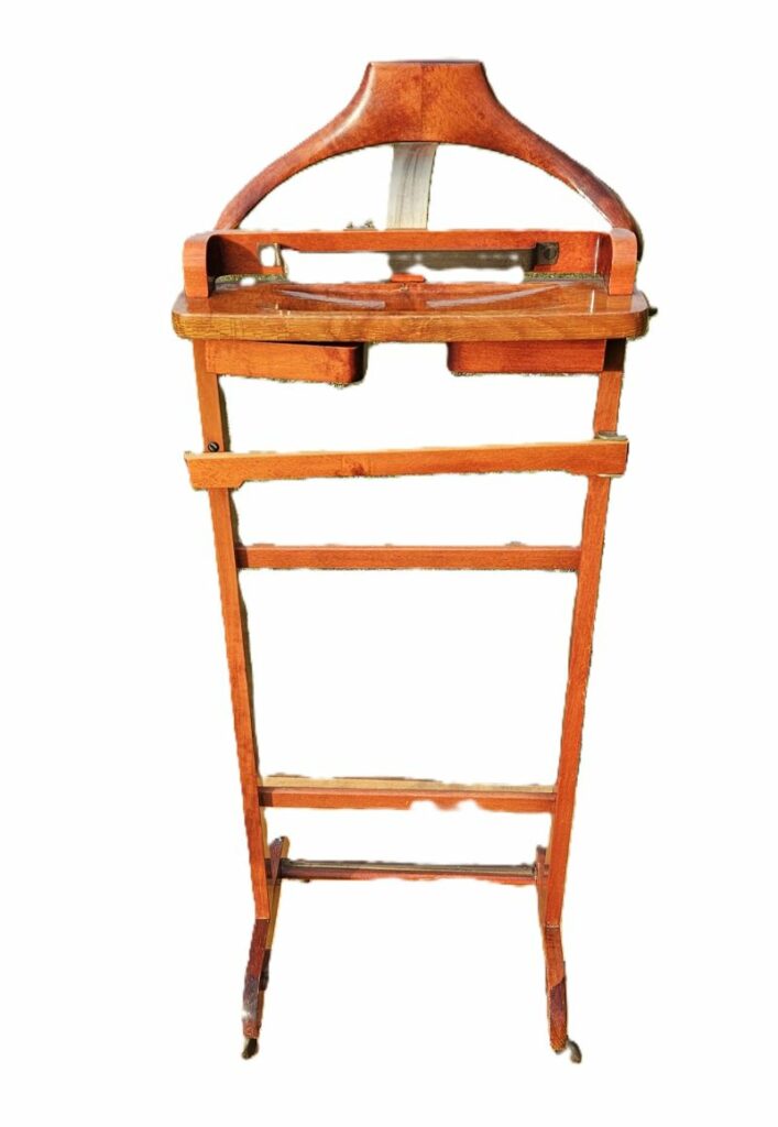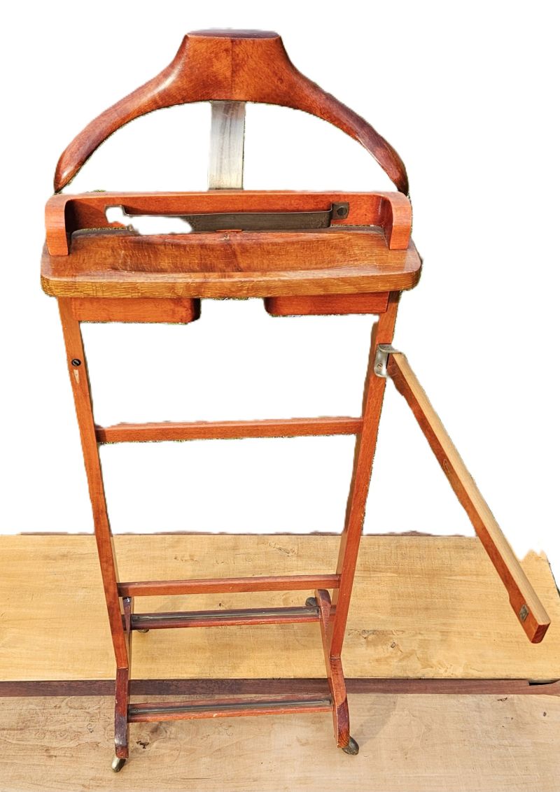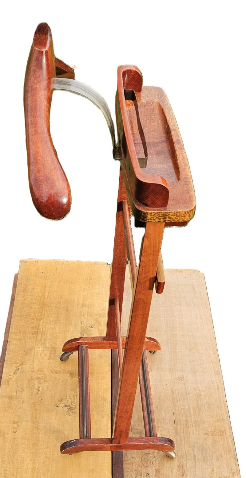 Ce valet de chambre italien a été conçu par Fratelli Reguitti dans les années 1950. Composé d’un cadre/penderie , astucieux ! 2 petites tablettes pivotantes sont dissimulées sous ce cadre pour recevoir la monnaie, bouton de manchette ou bijoux. Une double étagère en bas pour reposer les chaussures . Il repose sur quatre roues pivotantes pour une mobilité aisée. La barre supérieure est destinée à suspendre des écharpes, des cravates ou des pantalons) . L’acajou est en très bon état et le laiton ne présente qu’une usure mineure et un léger ternissement.