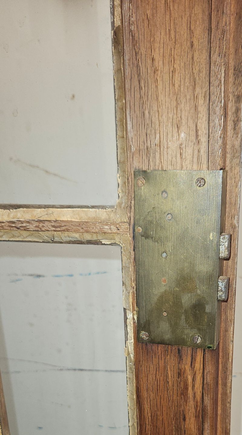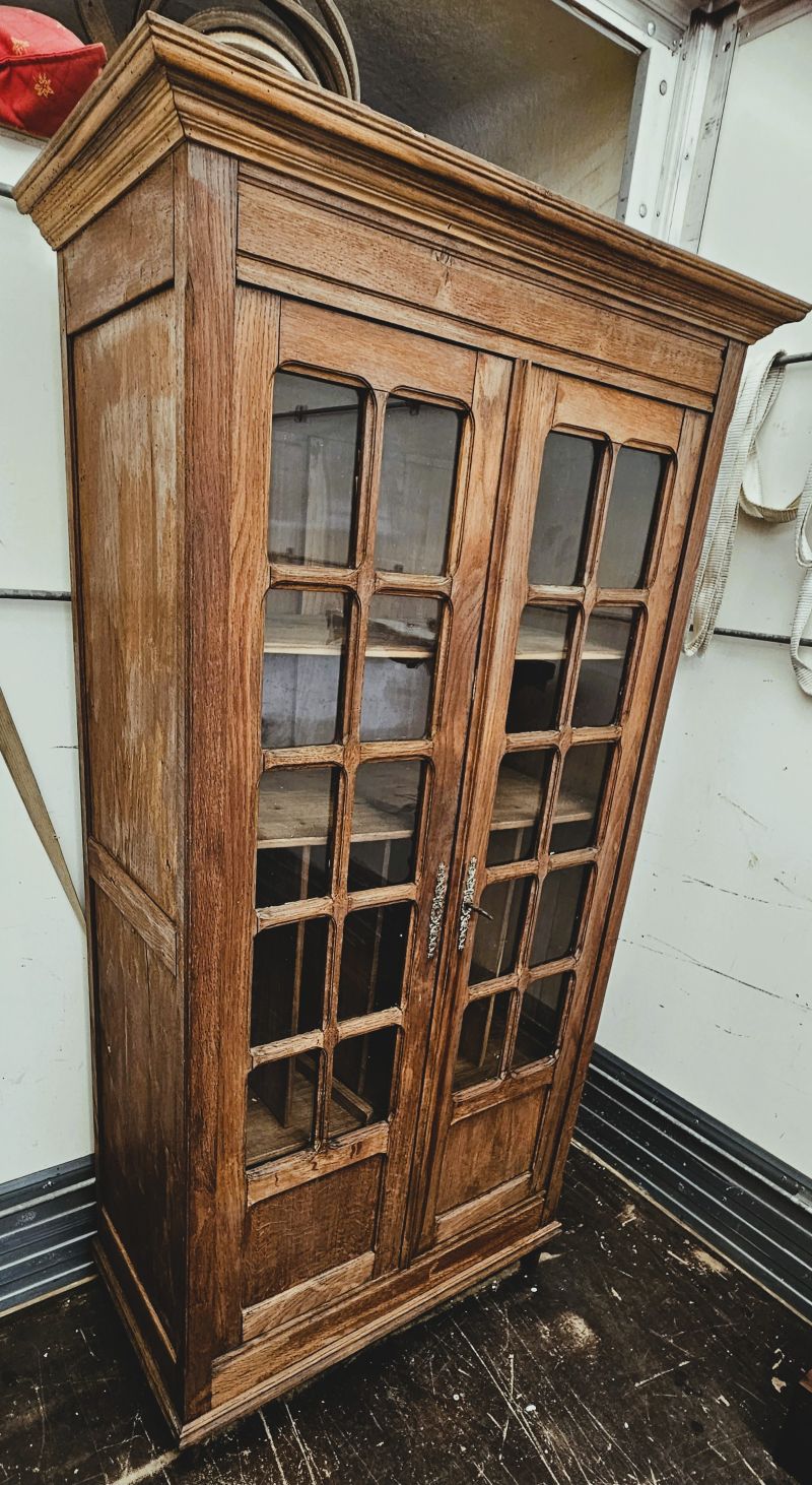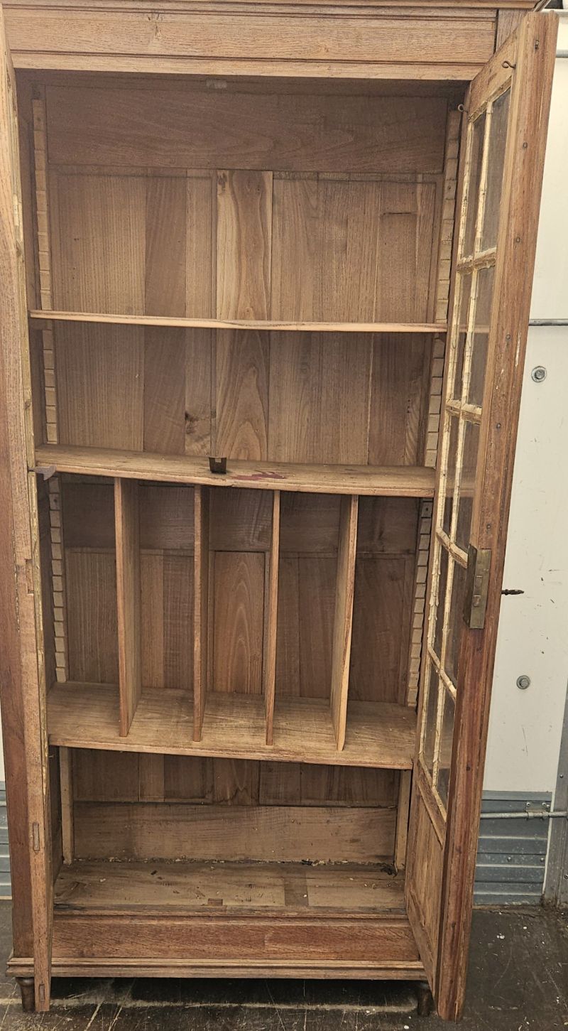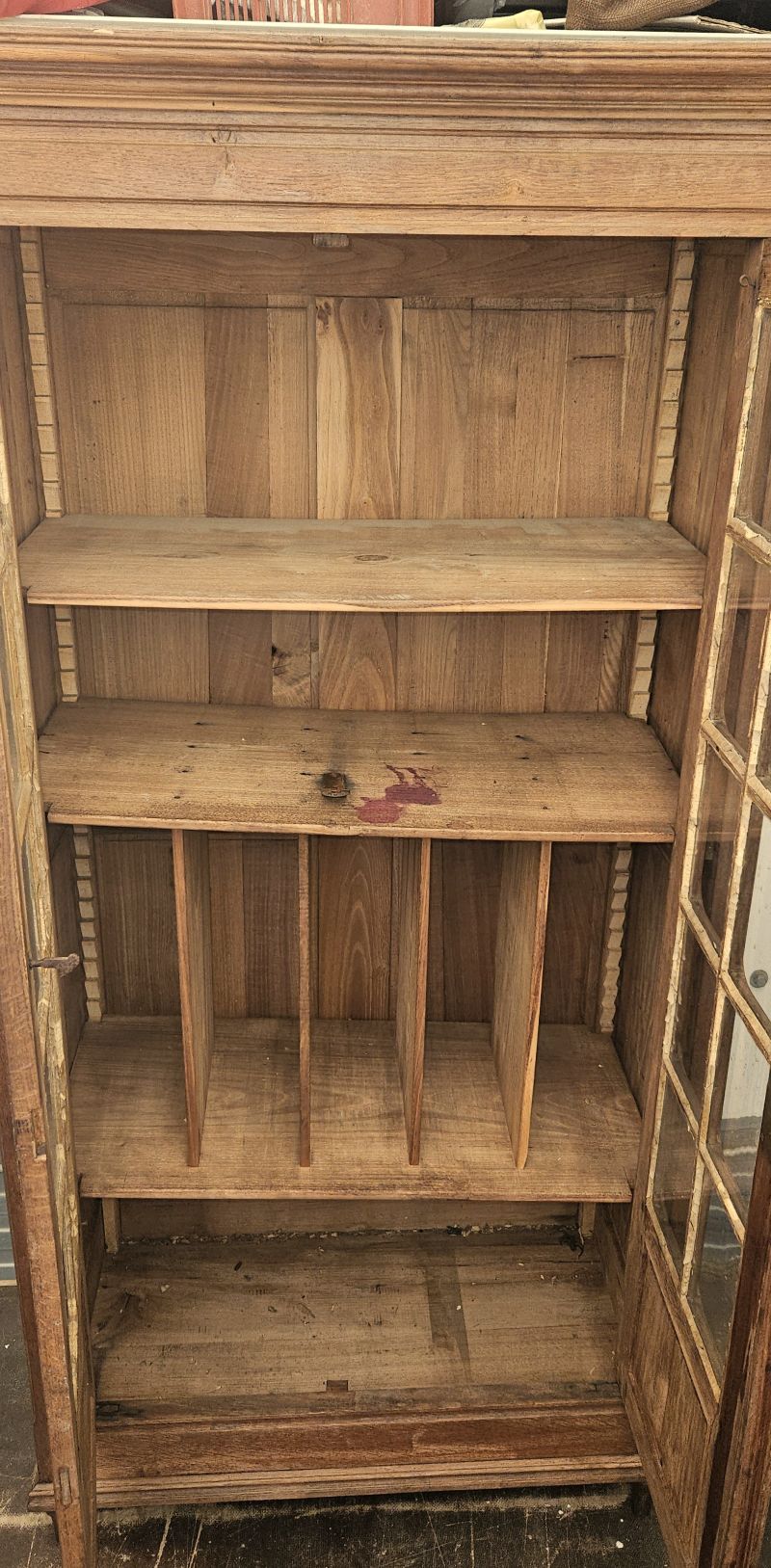 Petite armoire vitrine en bois naturel juste cirée ouvrant par 2 portes a petits carreaux en verre ancien. Intérieur aménagé avec 3 étagères dont celle centrale possède des cloisons verticales pour le rangement de livres ou partitions ou disques. Petits pieds avant en forme de toupie. Bon état. Petites dimensions donc elle est facilement logeable. Juste cirée, elle peut alors être vernie, peinte… A vous de lui trouver son style !