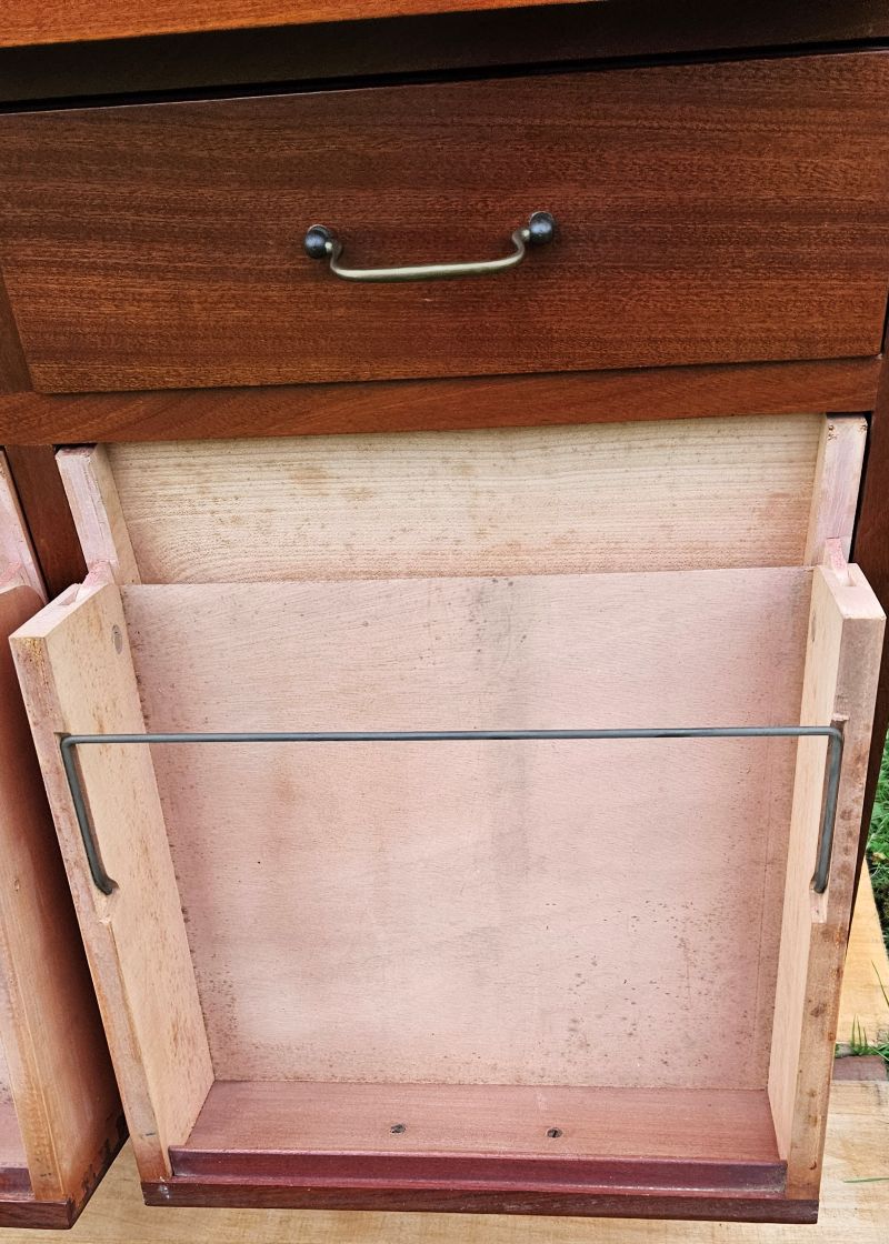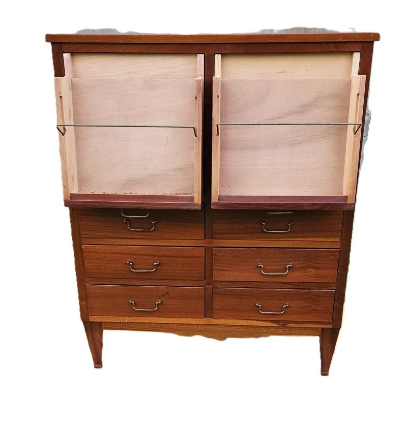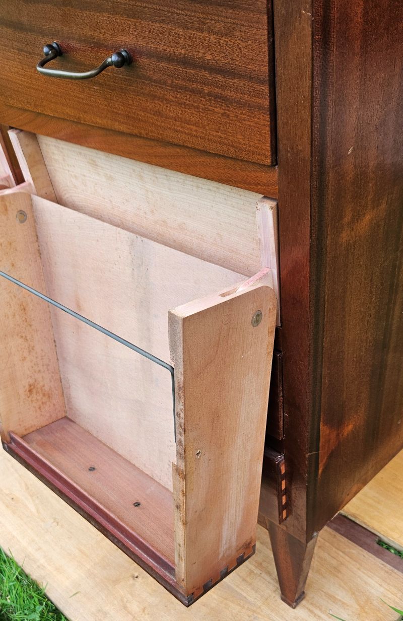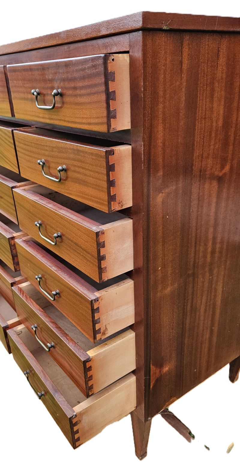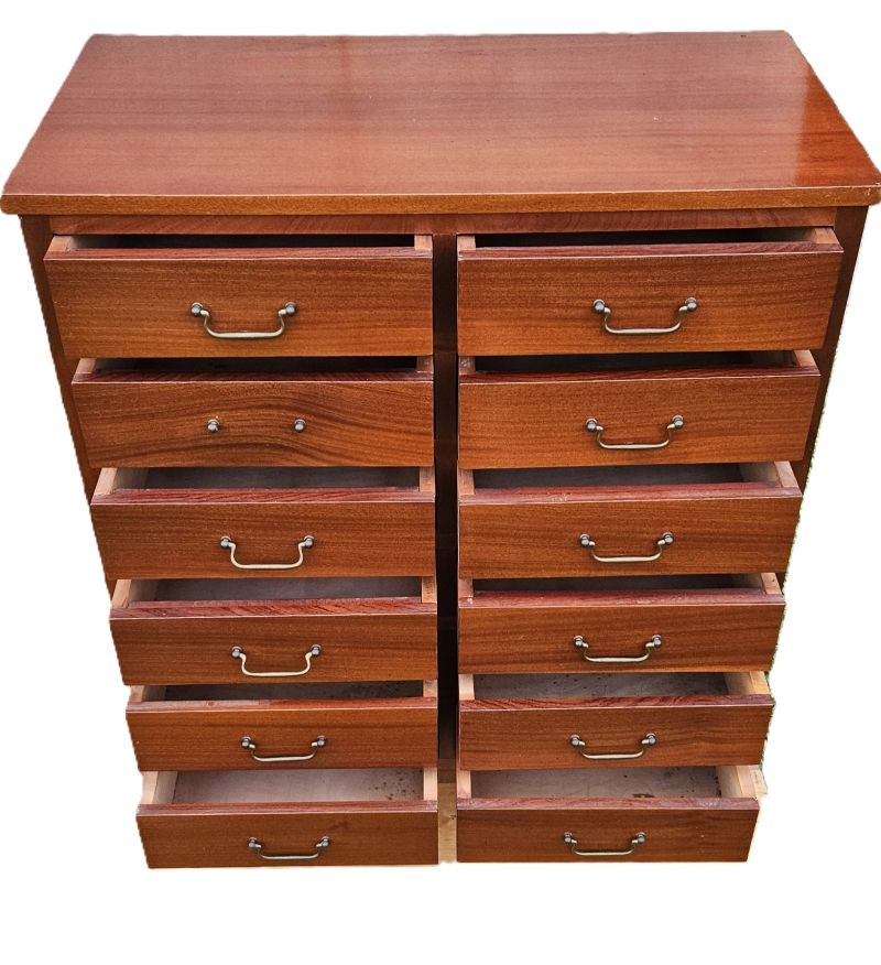 Magnifique et original meuble anglais d’archivage a 12 tiroirs en acajou. Les 8 tiroirs de la partie haute se tirent complètement pour les positionner à la verticale afin de pouvoir consulter les dossiers. Dans cette position, les archives sont maintenues à la verticale et retenues avec une petite barre de fer. Il repose sur 4 petits pieds compas. Très belle patine ancienne aux notes chaleureuses de l’acajou. Meuble en très bon état mais il faut noter un éclat dans le bois en partie haute côté dos.
