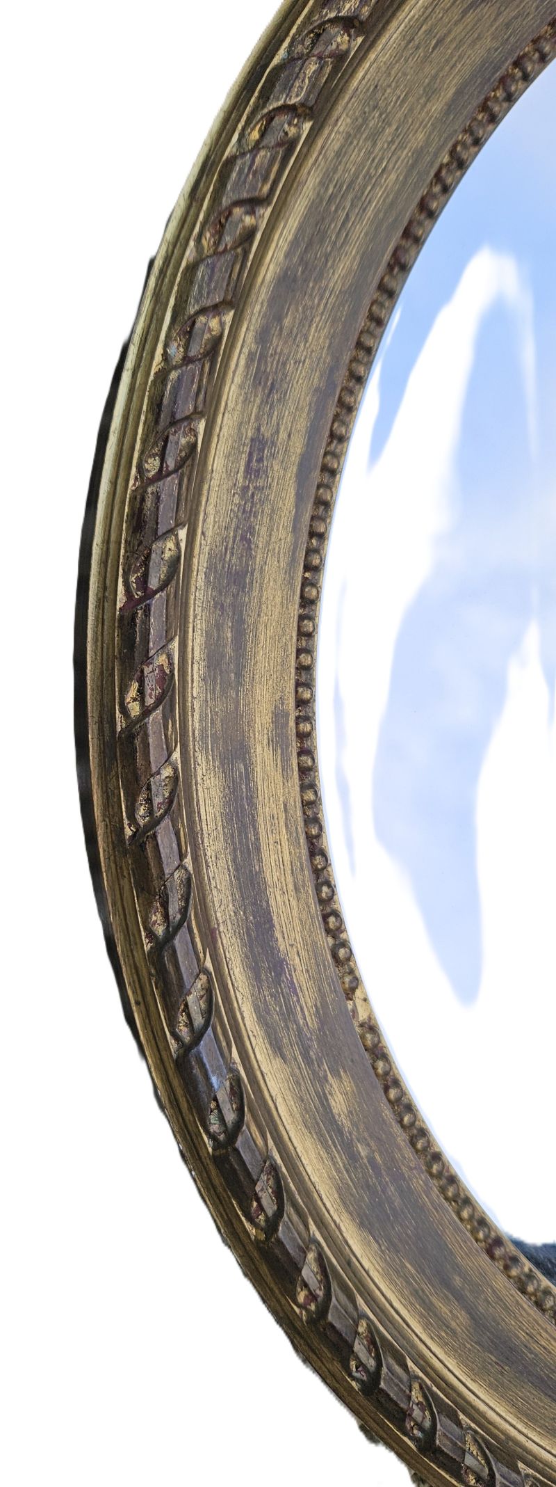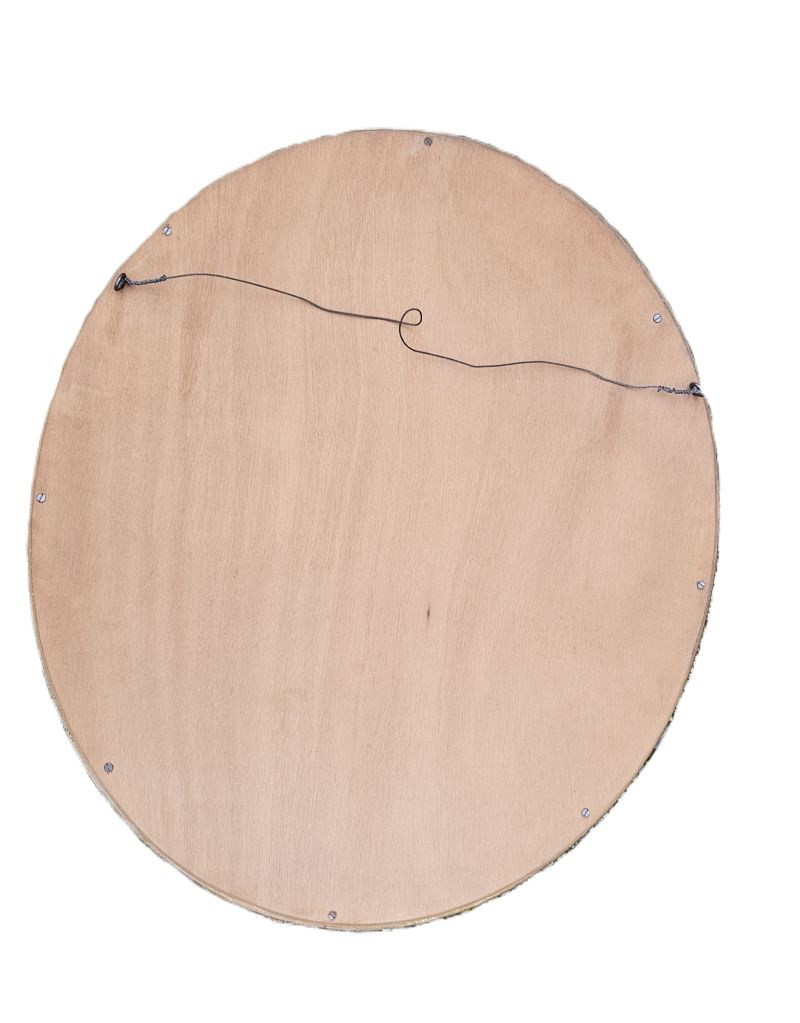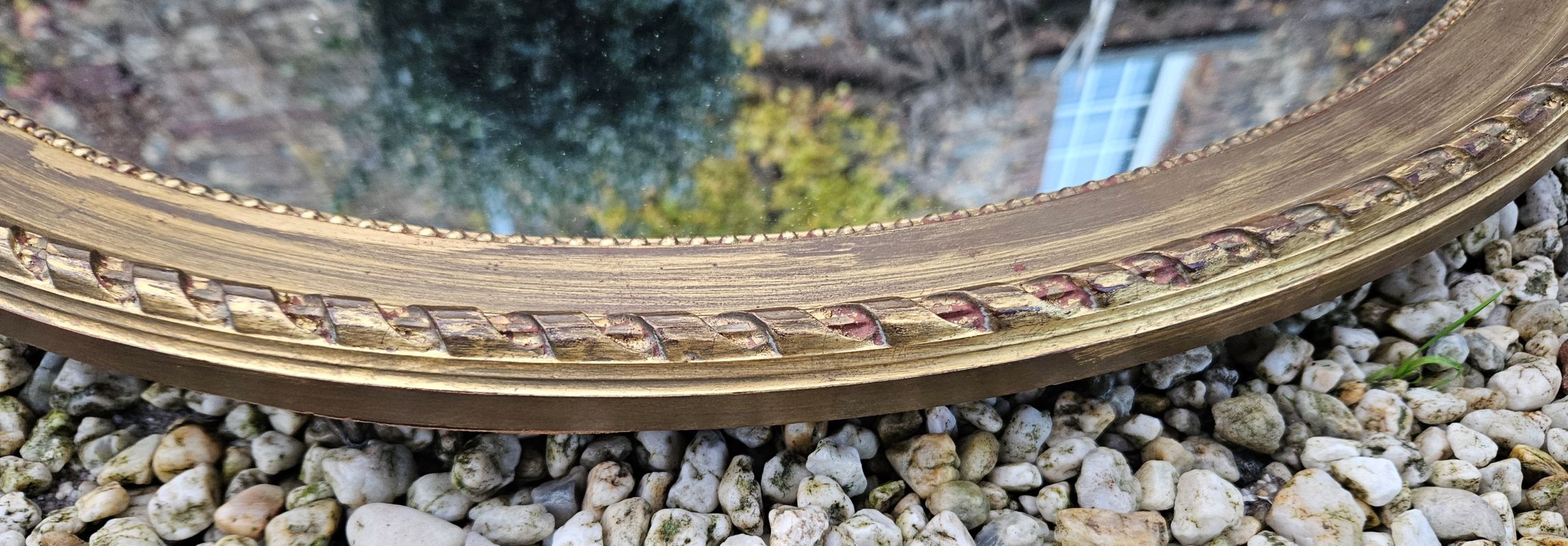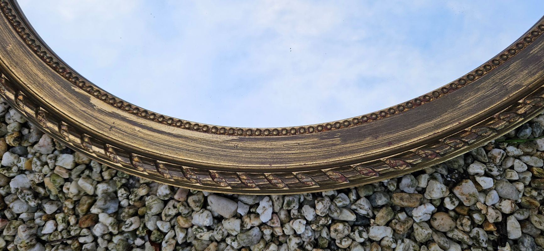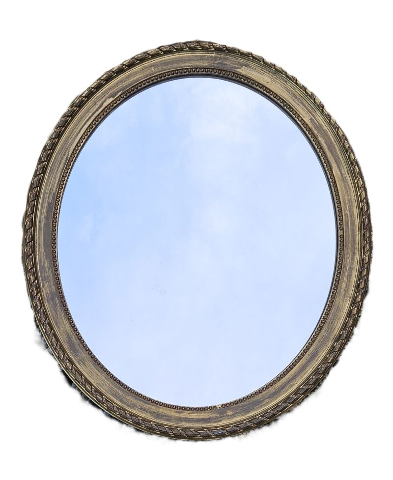 Joli grand miroir de forme ovale en bois doré patiné. La glace est en bon état. Il manque juste une petite perle dans la rangée du bas, à peine visible. Le dos est protégé d’une planche de bois.
