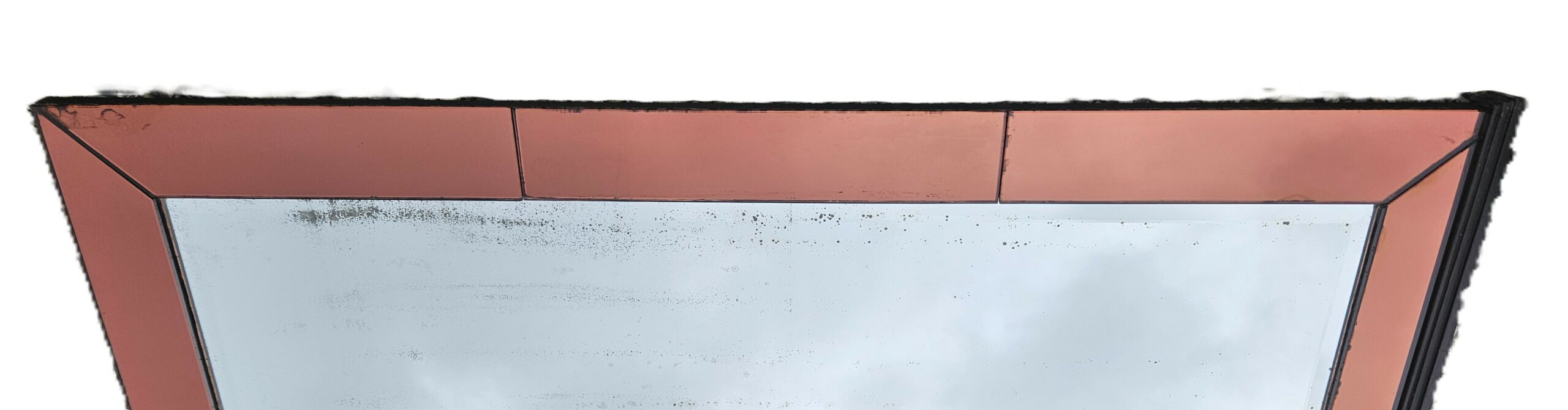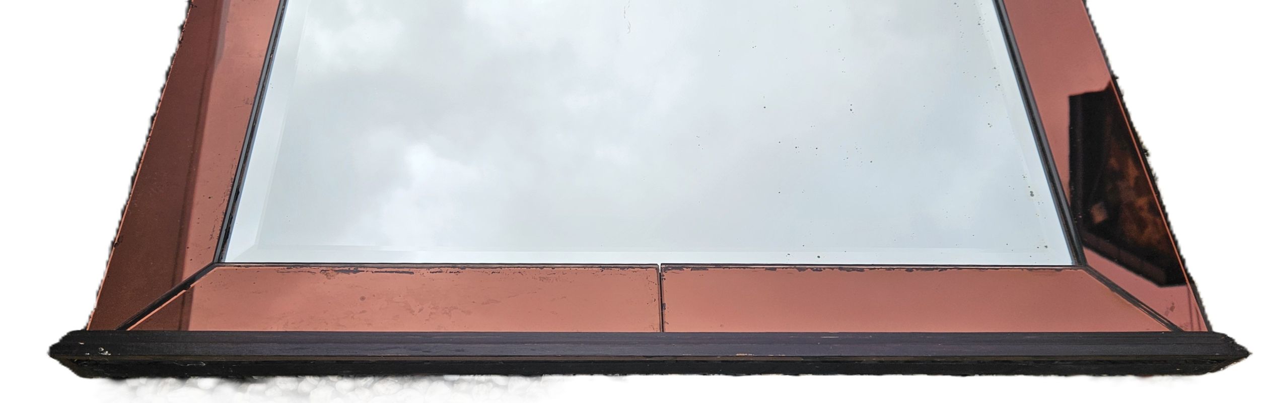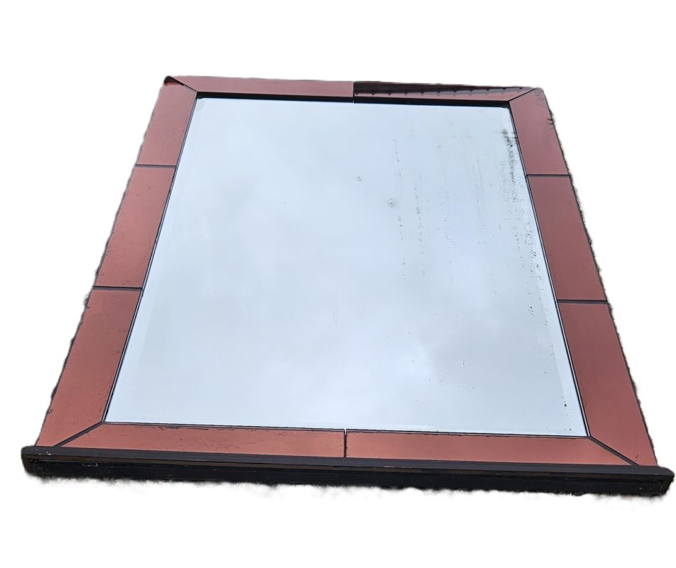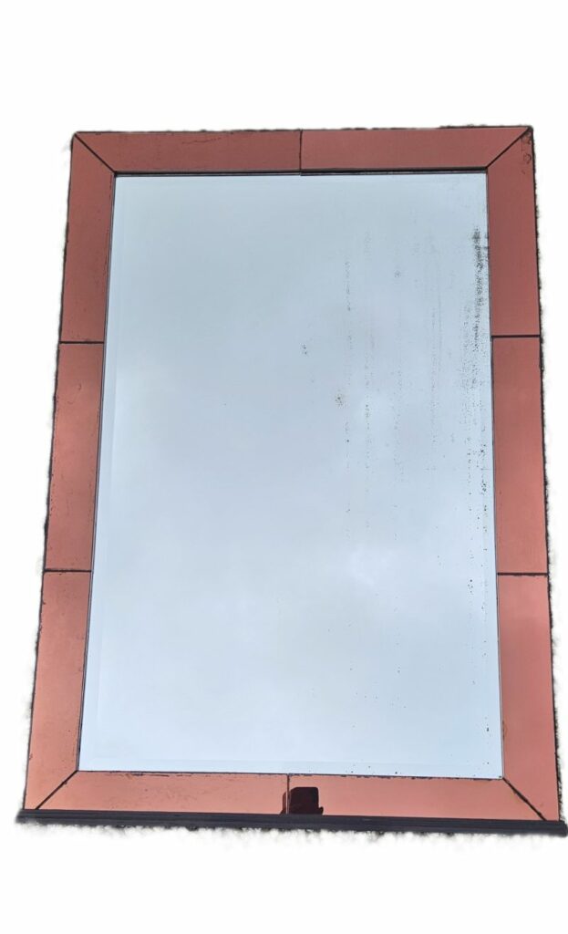 Original miroir en verre a pare-closes de couleur ambre dans le goût de Jacque Adnet. La glace est biseautée et présente des traces d’humidité – manque de tain. Le dos présente également des traces d’humidité sur le bois. Forme et design très sobre ! il date des années 50.