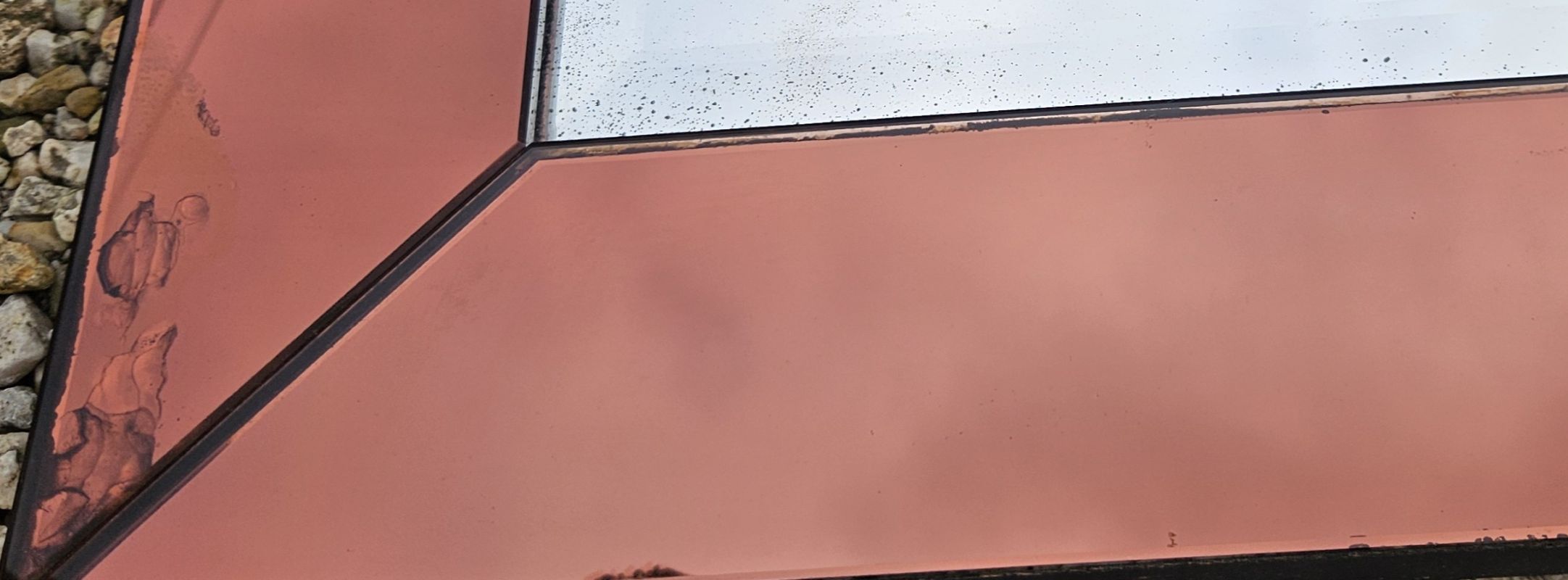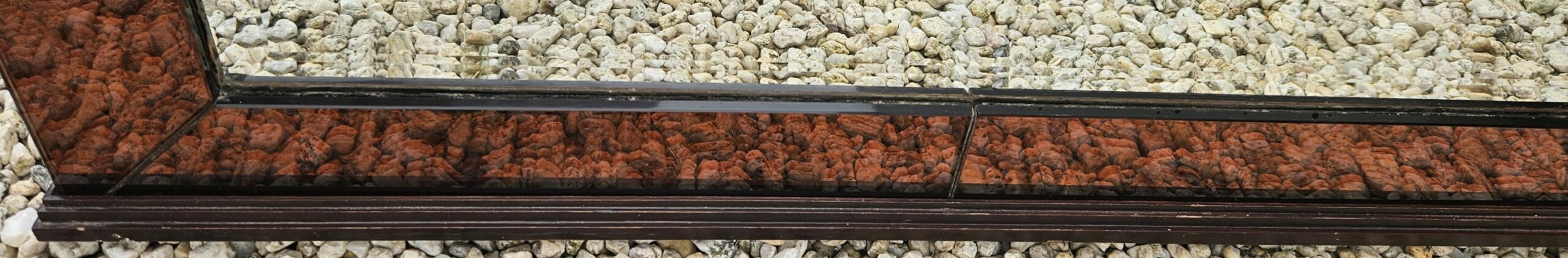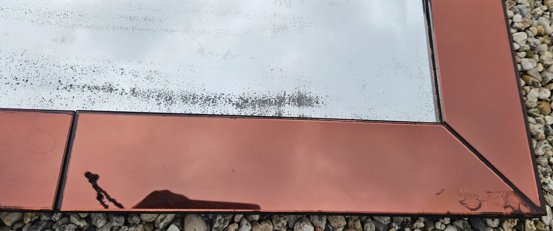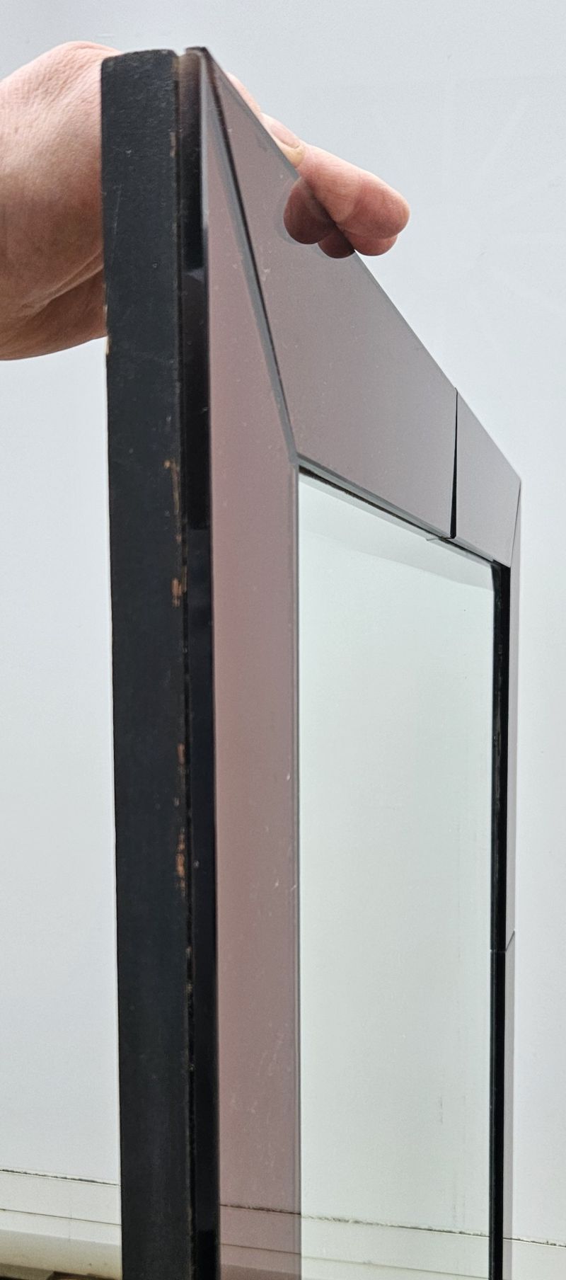 Original miroir en verre a pare-closes de couleur ambre dans le goût de Jacque Adnet. La glace est biseautée et présente des traces d’humidité – manque de tain. Le dos présente également des traces d’humidité sur le bois. Forme et design très sobre ! il date des années 50.
