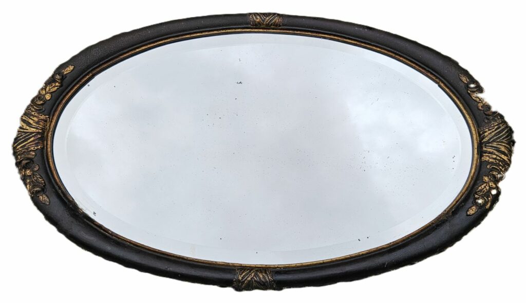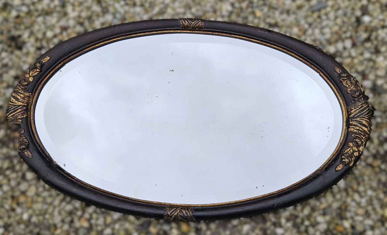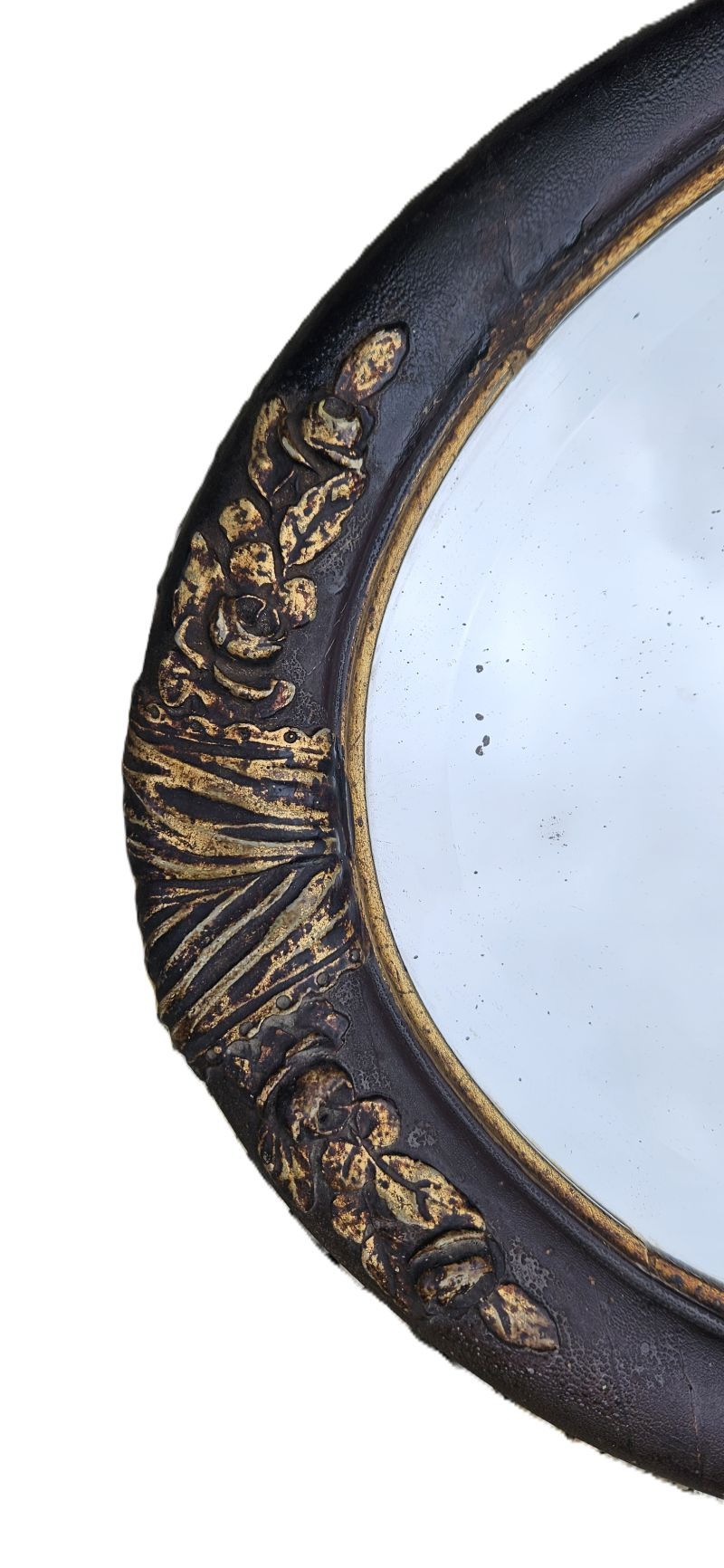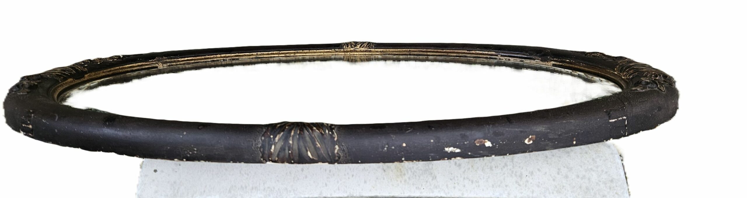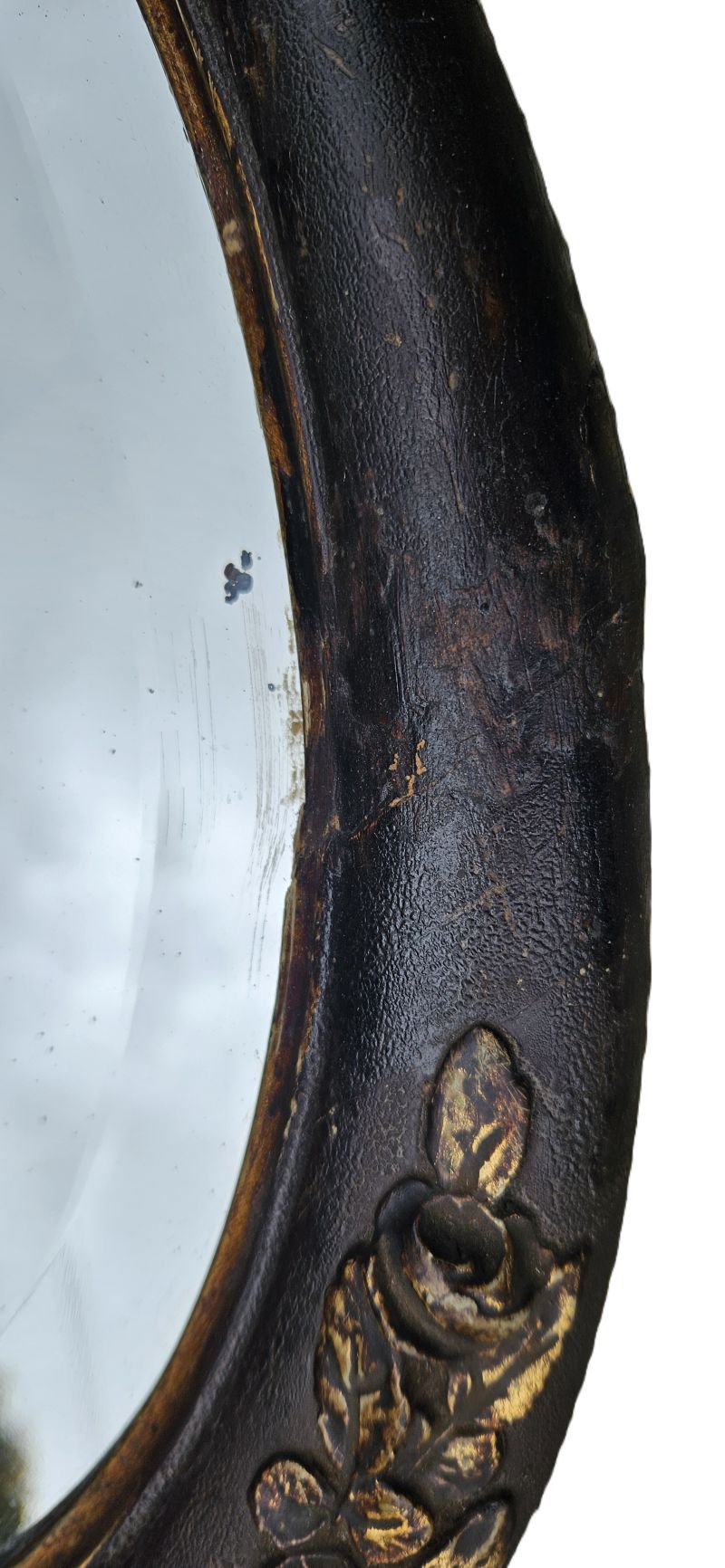 Forme typique de l’époque Art Déco ! large miroir ovale en stuc peint marron orné de chaque côté en relief, de fleurs dorées ainsi , qu’en parties centrales, de draperies dorées. Miroir biseauté avec quelques taches. Petite restauration du struc sur un côté a peine visible. Dos en cartonnage épais qui a conservé son étiquette d’origine, partiellement effacée.