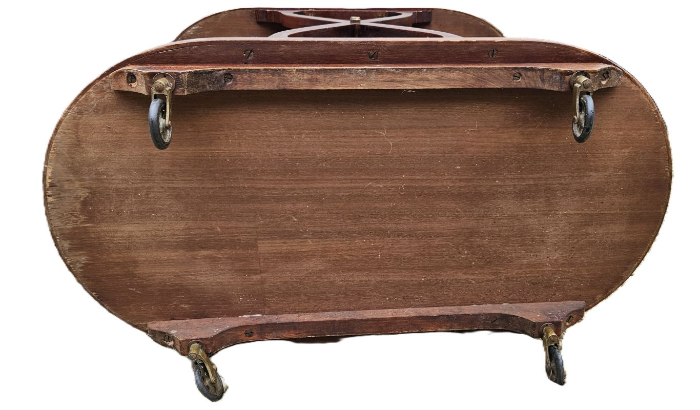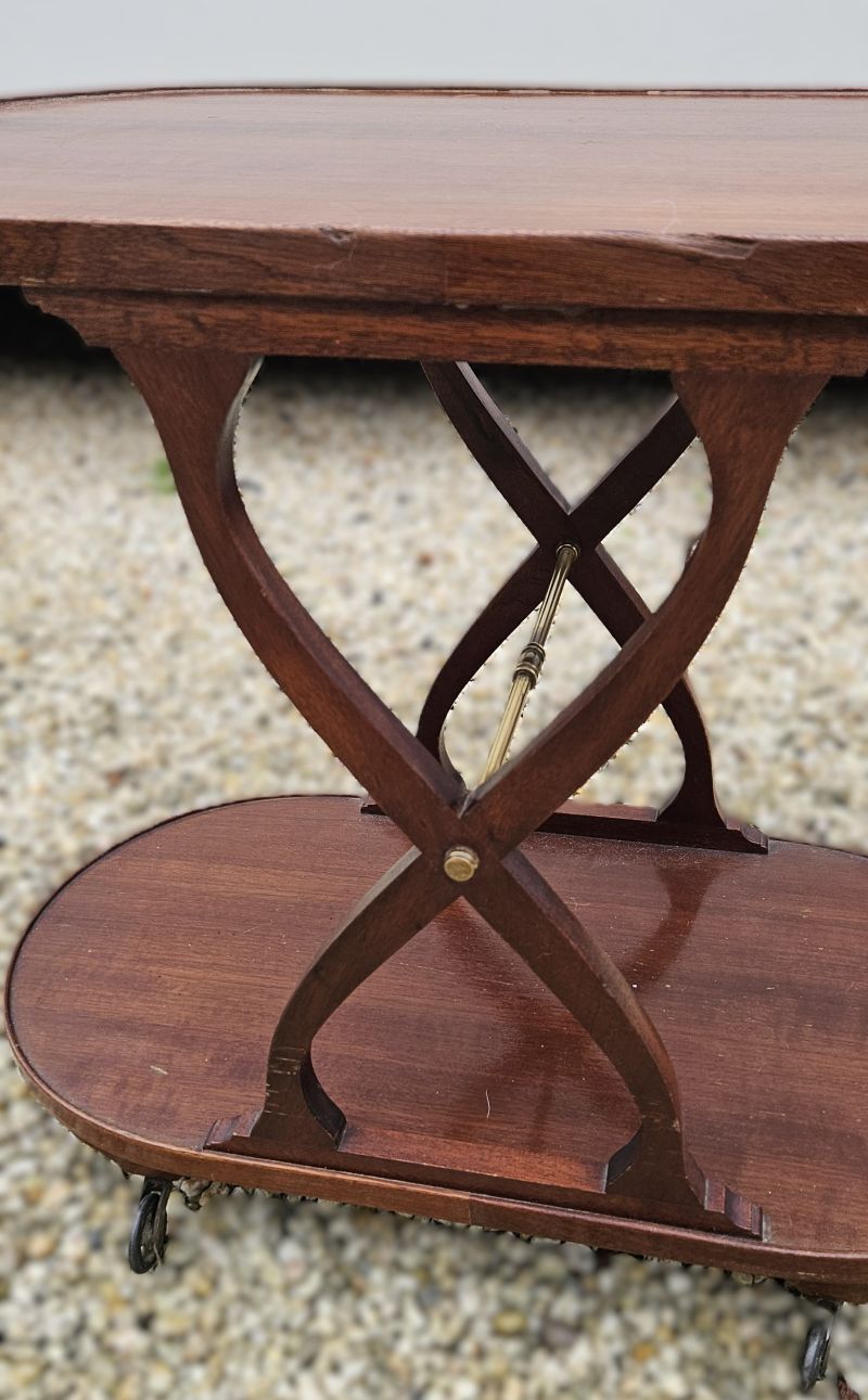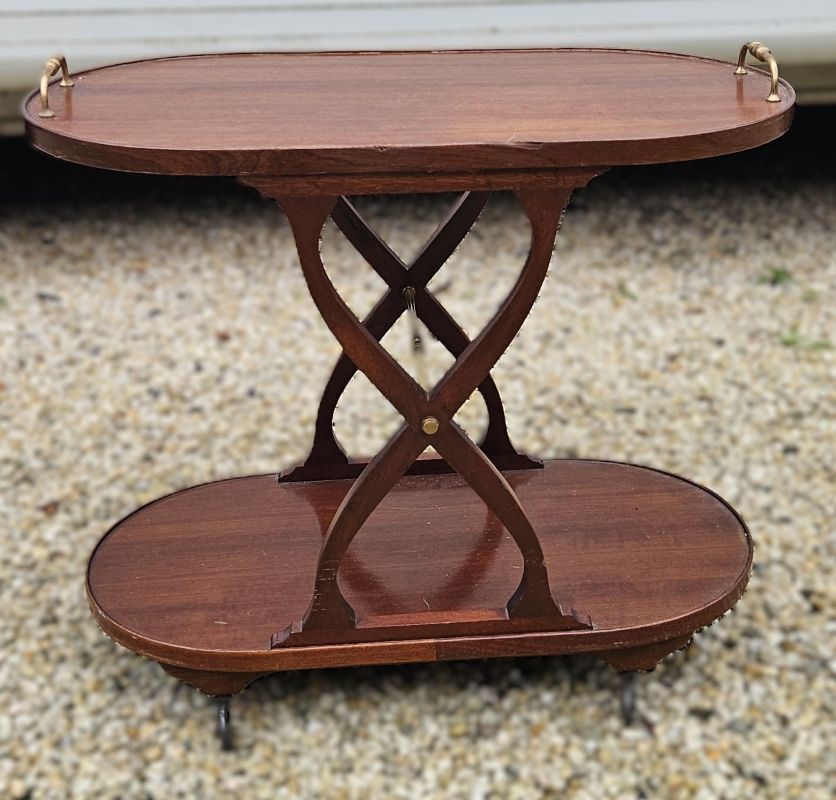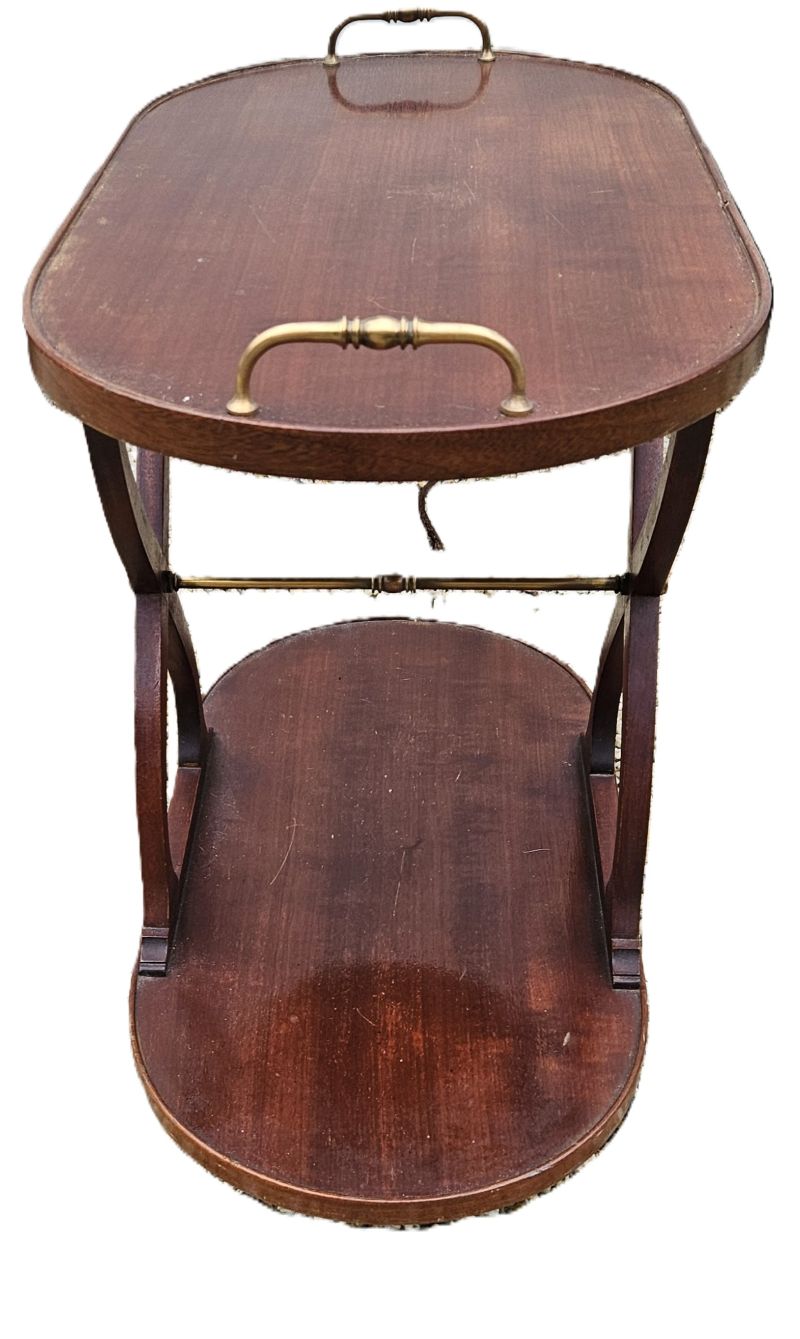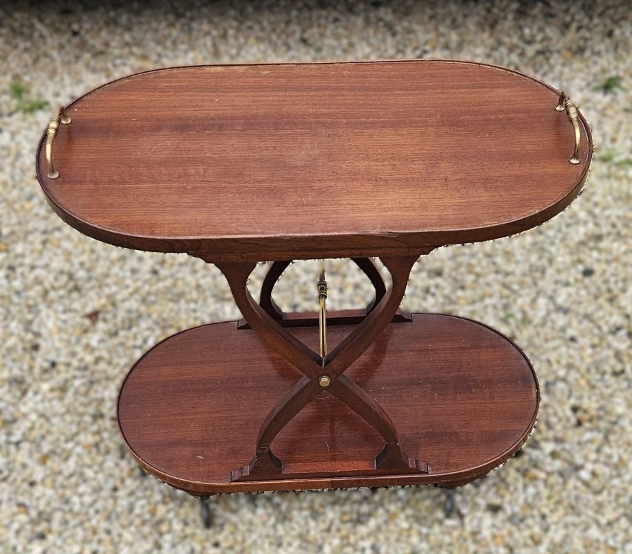 Ravissante desserte sur roulettes ou serviteur de salon vintage des années 60. Elle se compose de 2 plateaux en acajou reliés par 2 montants moulurés en X. Elle repose sur 4 roulettes. Les poignées sont en laiton. Belle patine ancienne avec de très fines rayures d’usage. Bien stable elle trouvera sa place dans votre salon !