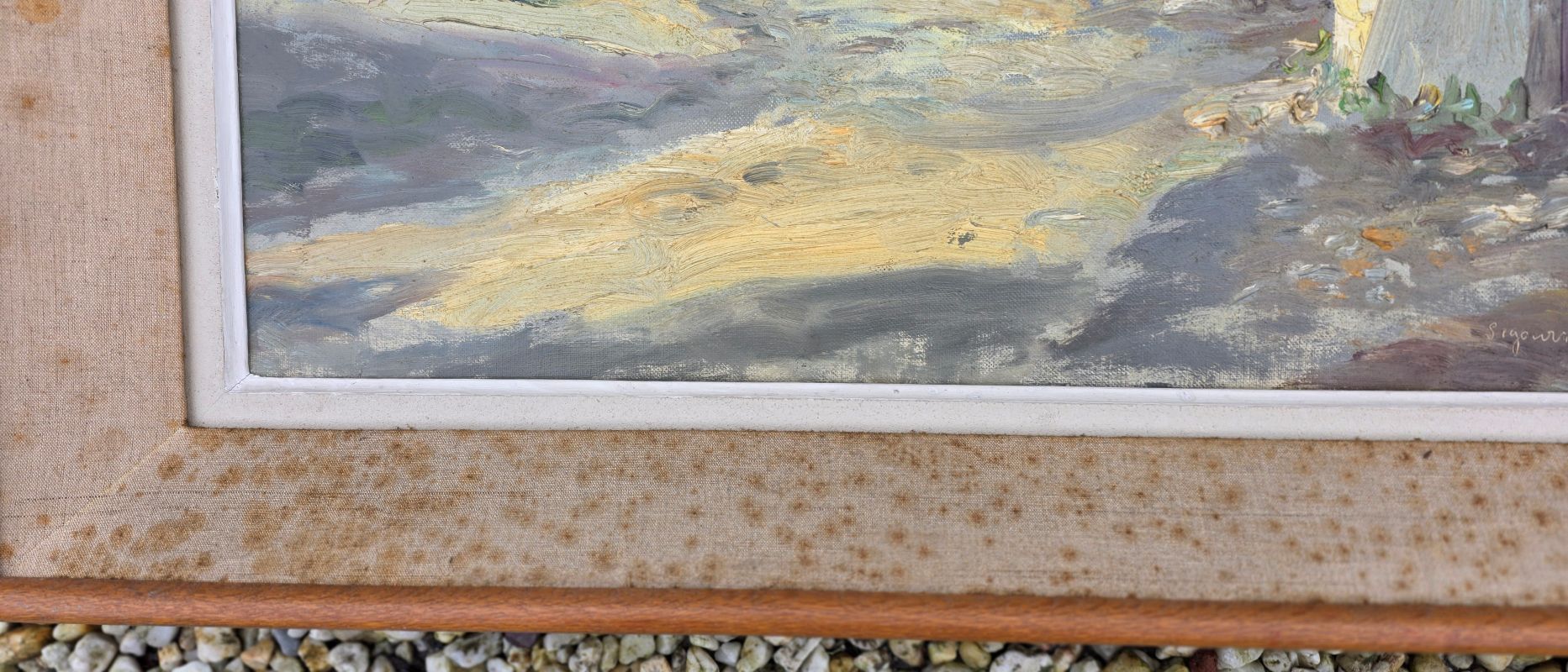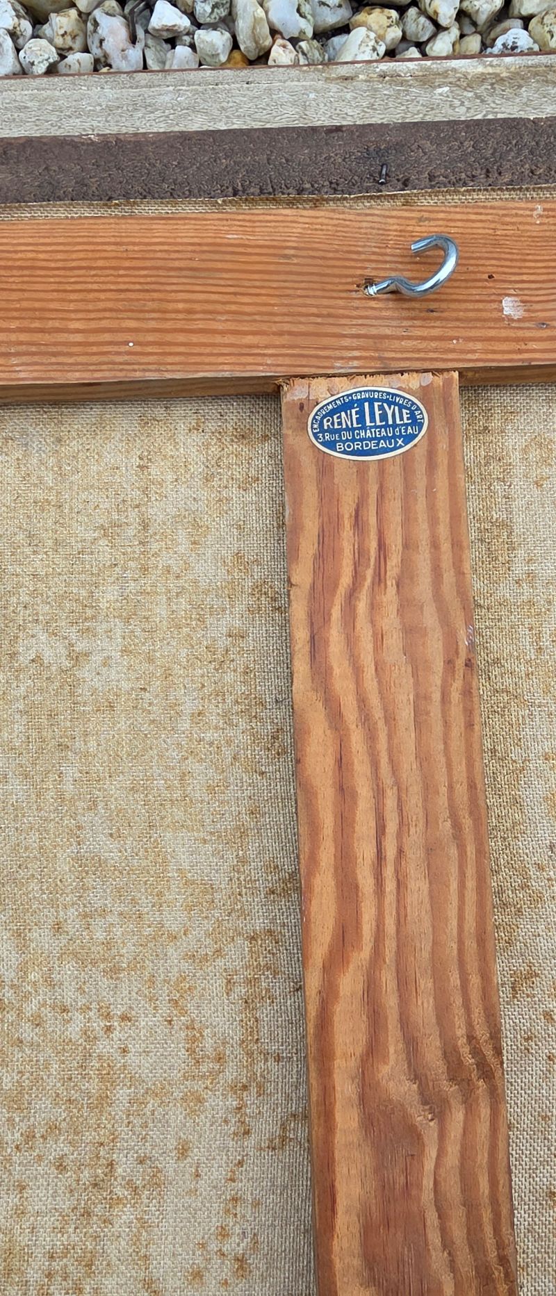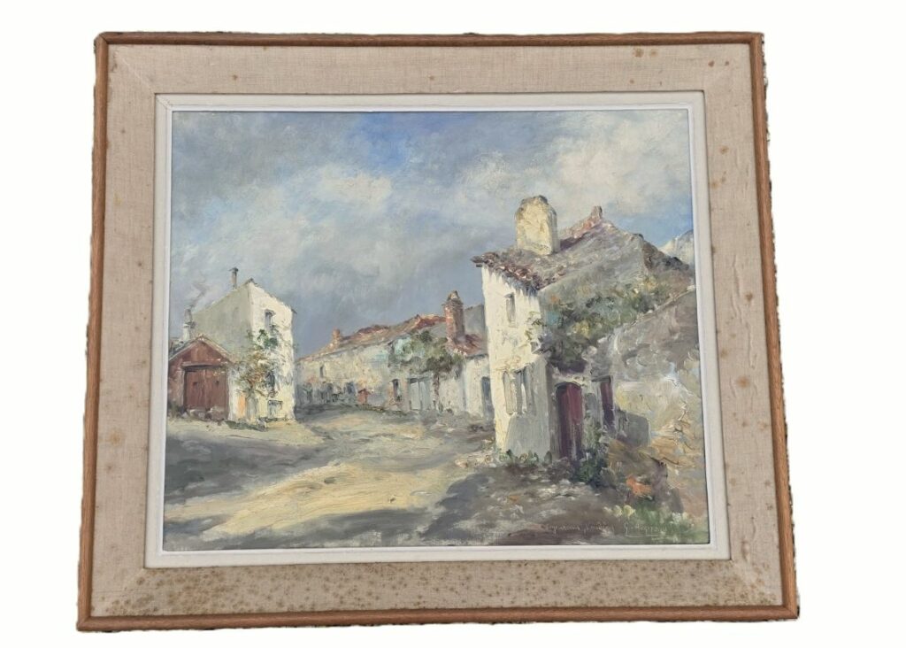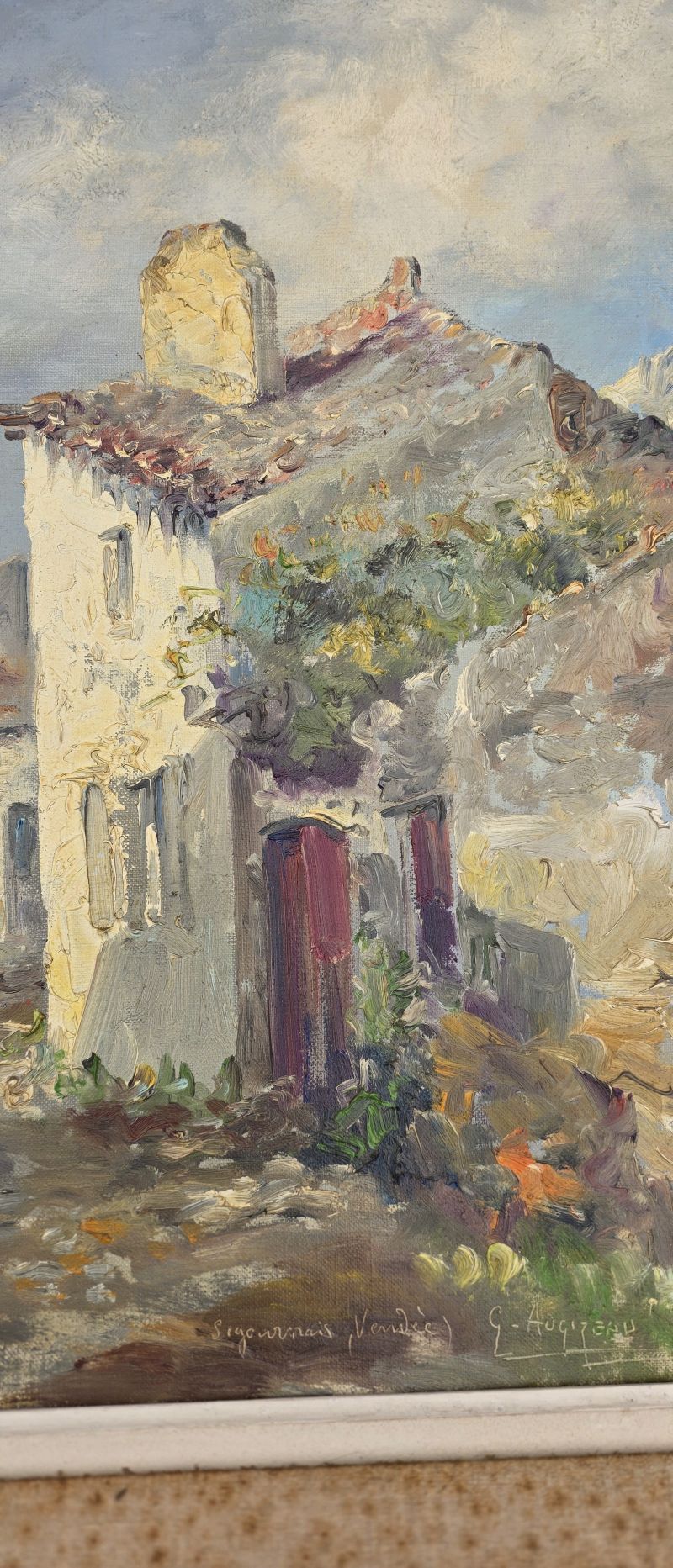 Grande huile sur toile intitulée « Sigournais – Vendée » signée en bas à droite de la main du peintre Augizeau Gabriel. Belle perspective pour cette peinture en relief représentant une vue du village de Sigournais. Vers 1950, elle est encadrée d’un cadre des mêmes années. Celui-ci présente des taches de mouillures mais est en très bon état comme la peinture.