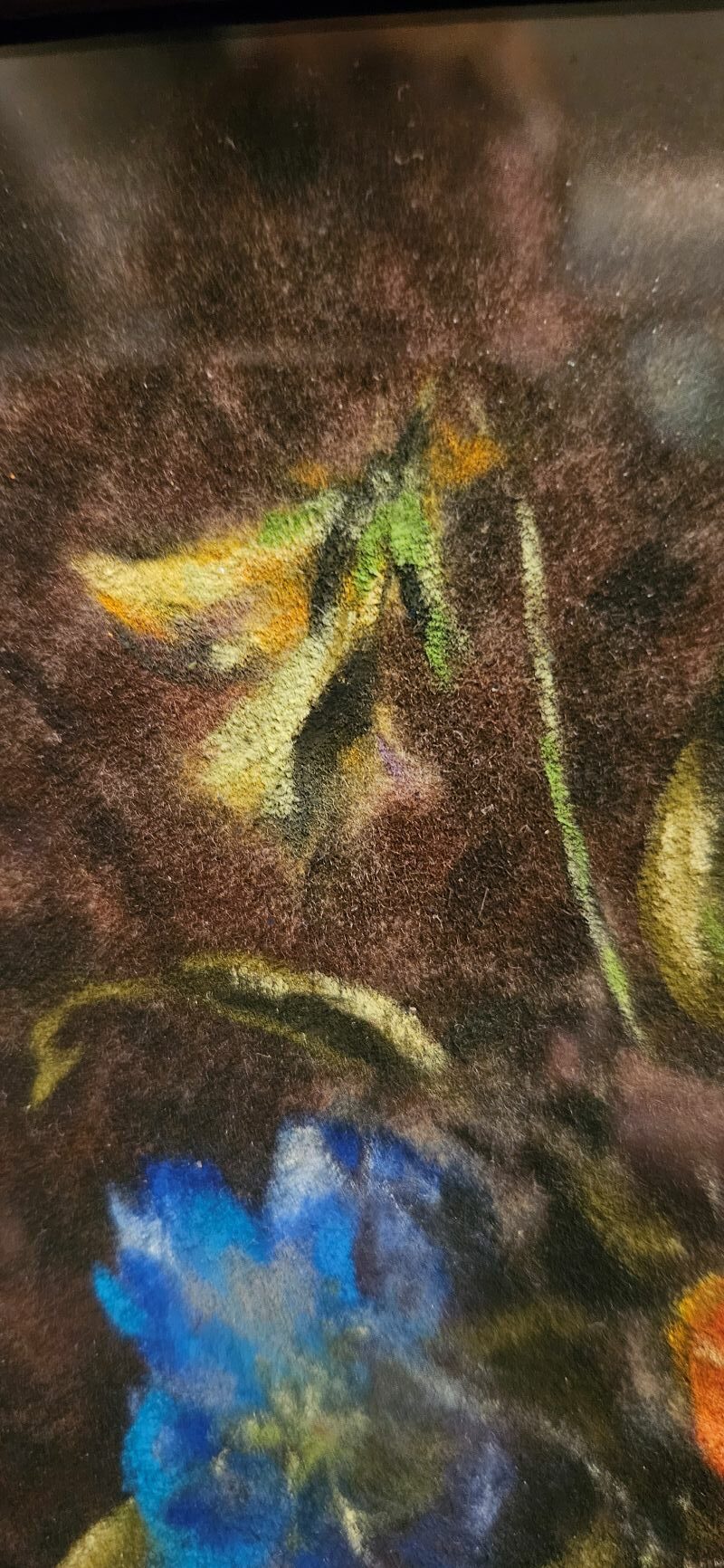 L’oeuvre a été réalisée au pastel, elle est en parfait état. Elle est protégée par un verre. Cadre en bois. Petit anneau au dos pour le suspendre.