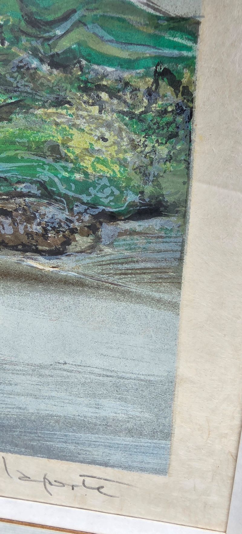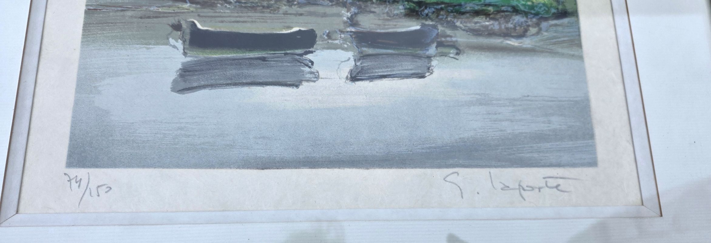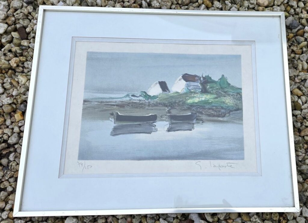 Georges LAPORTE (1926-2000)- lithographie sur papier Velin représentant des bateaux à marée basse. Elle est signée en bas à droite au crayon par la main de l’artiste et numérotée 74/150 en bas à gauche au crayon.Elle est encadrée et sous verre avec un passe partout. Parfait état