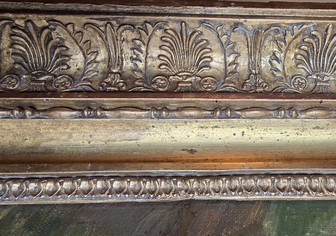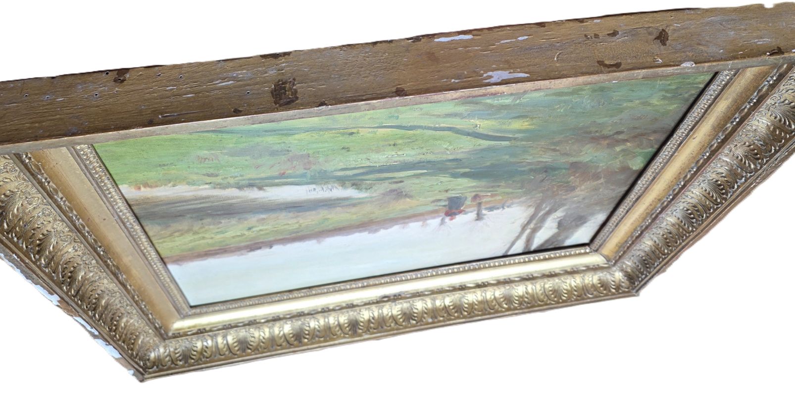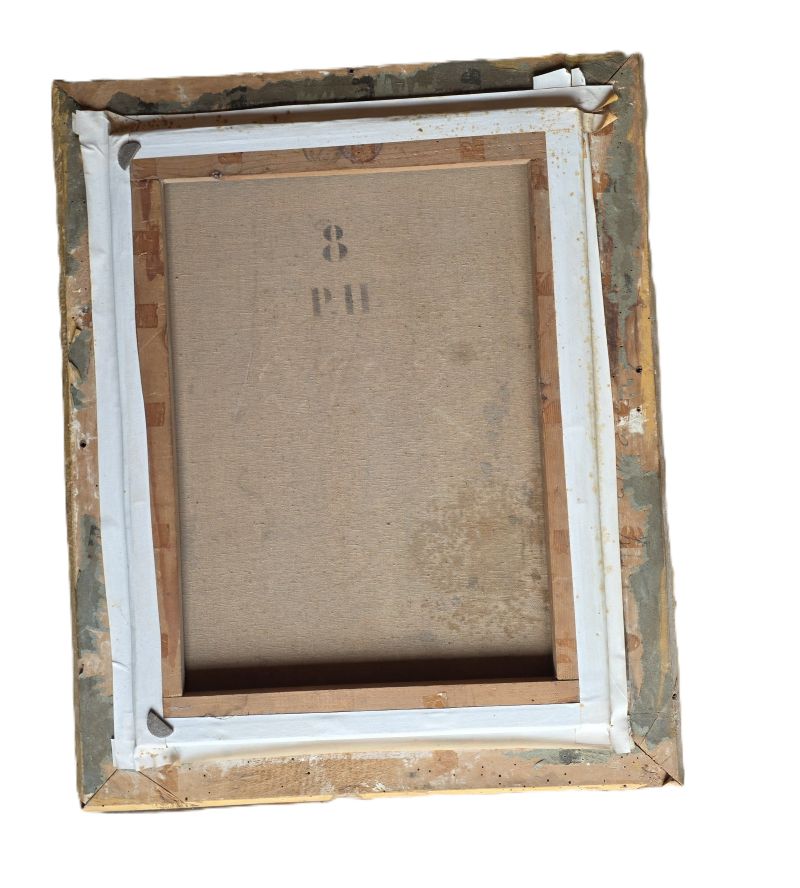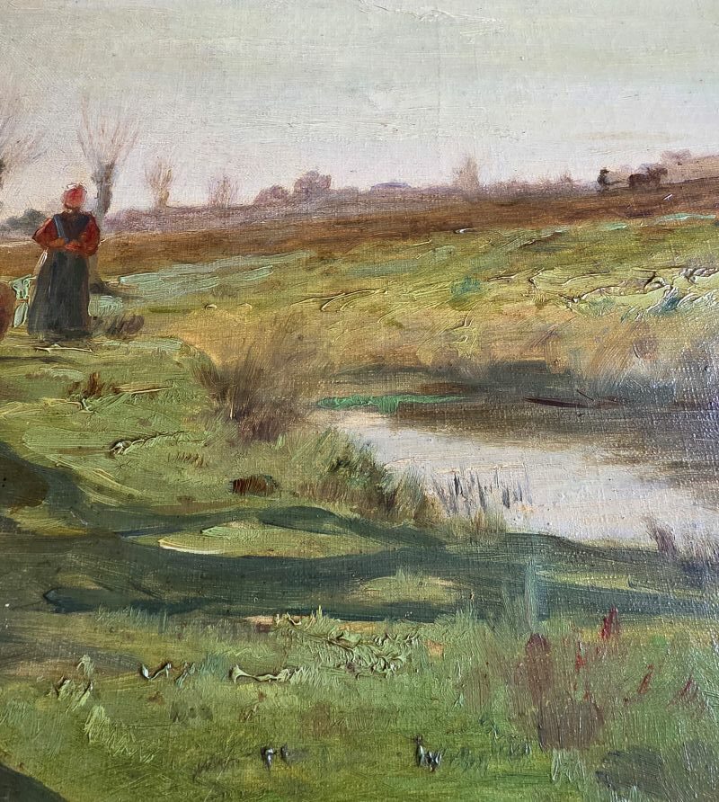 Ravissante huile sur toile au sujet reposant « Bocage » représentant une femme de dos regardant au loin, un homme labourer avec un cheval de trait. Belles couleurs vives. Peinture non signée. Elle est protégée d’un cadre ancien en stuc doré a décor de palmettes. Cadre avec petits manques.