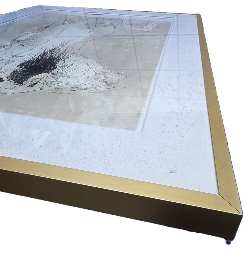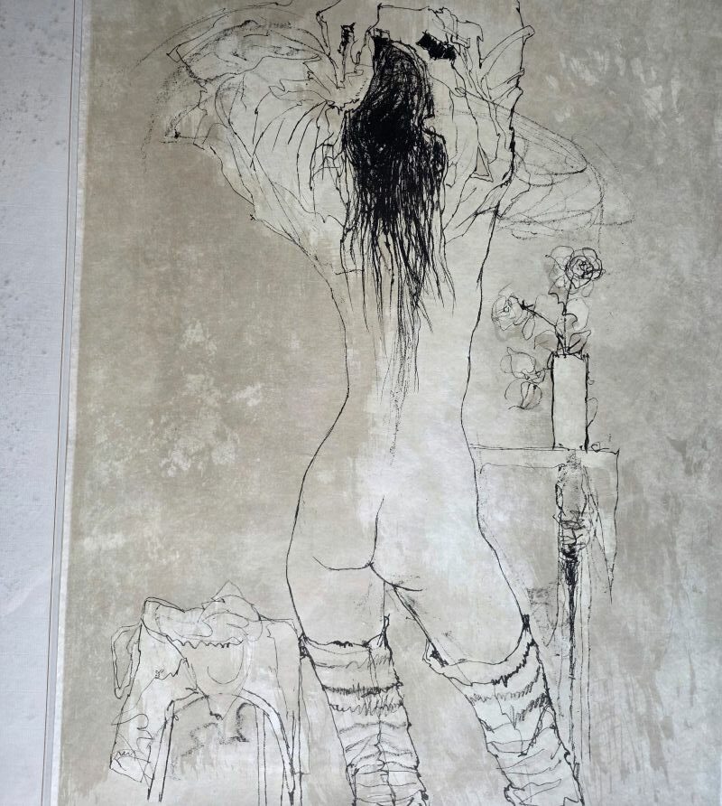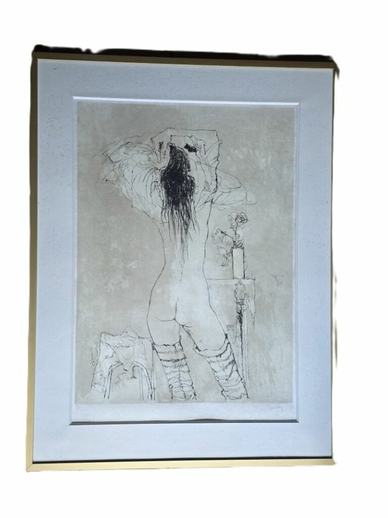 Jean Jansem (1920-2013) lithographie originale à l’encre noire sur papier Japon, intitulée « nu de dos à la rose ». Elle est signée au crayon par l’artiste en bas à droite et numérotée (III/L) en bas à gauche. Produite vers 1970, montée dans un cadre de la même époque en alu doré et protégée par un verre.