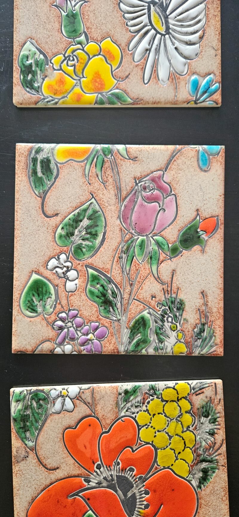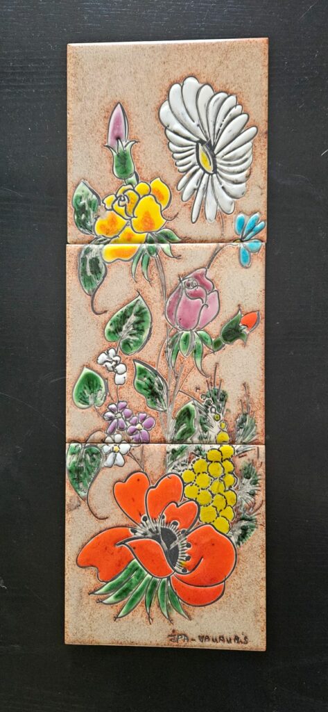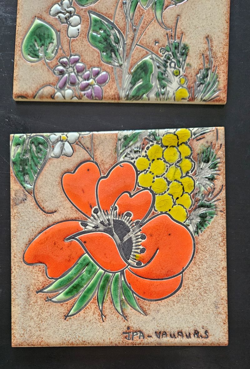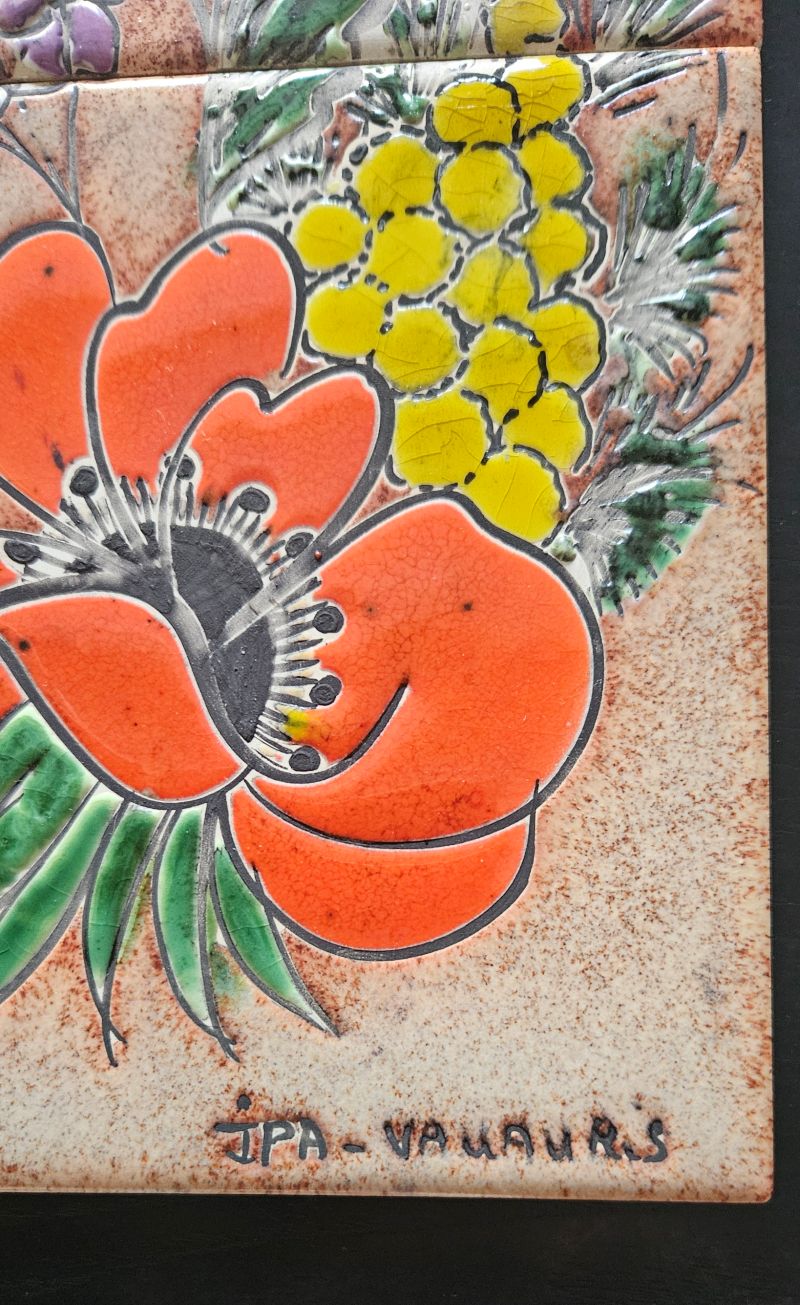 Très jolie frise composée de 3 carreaux de faïence émaillée à décor floral datant des années 1960. Elle est signée en bas à droite JPA pour Jean Paul ARNONE. Céramiste à Vallauris .