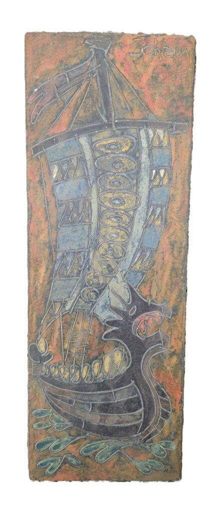JEHAN Christophe (1961)-grande plaque de bois panneau de particules agglomérées gravée et réhaussée de peinture. Elle représente un DRAKKAR peinte dans les tons chaleureux. Elle est signée en haut à droite JEHAN. Oeuvre très originale !