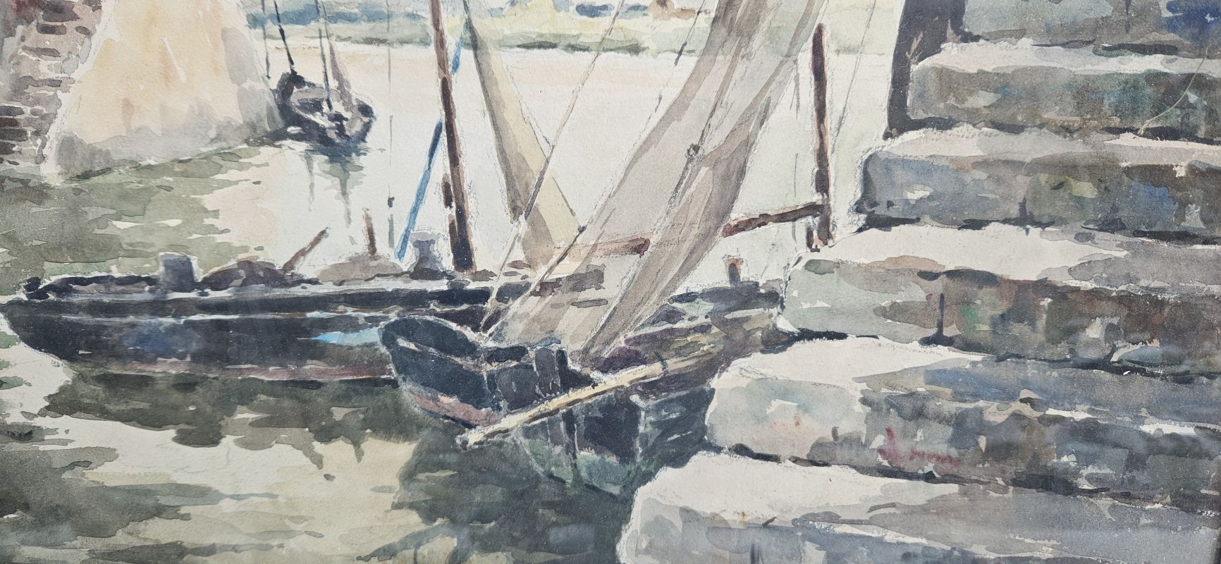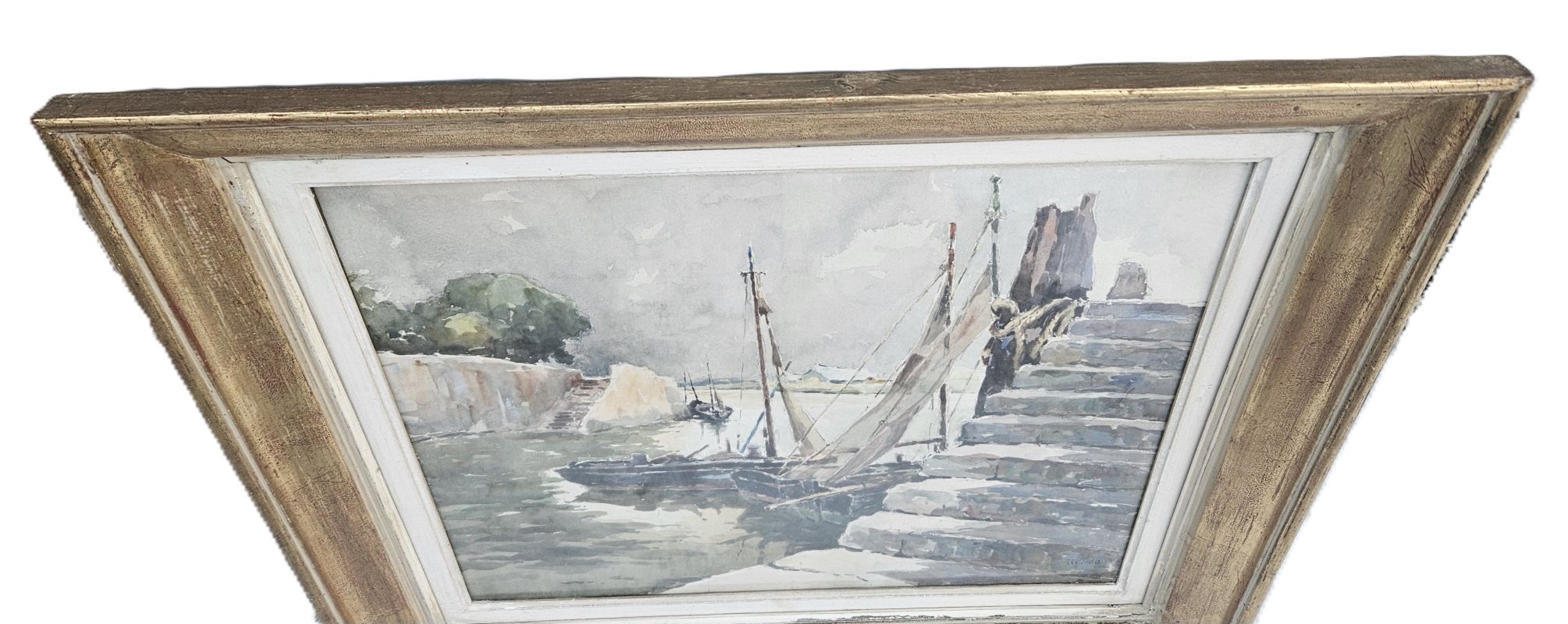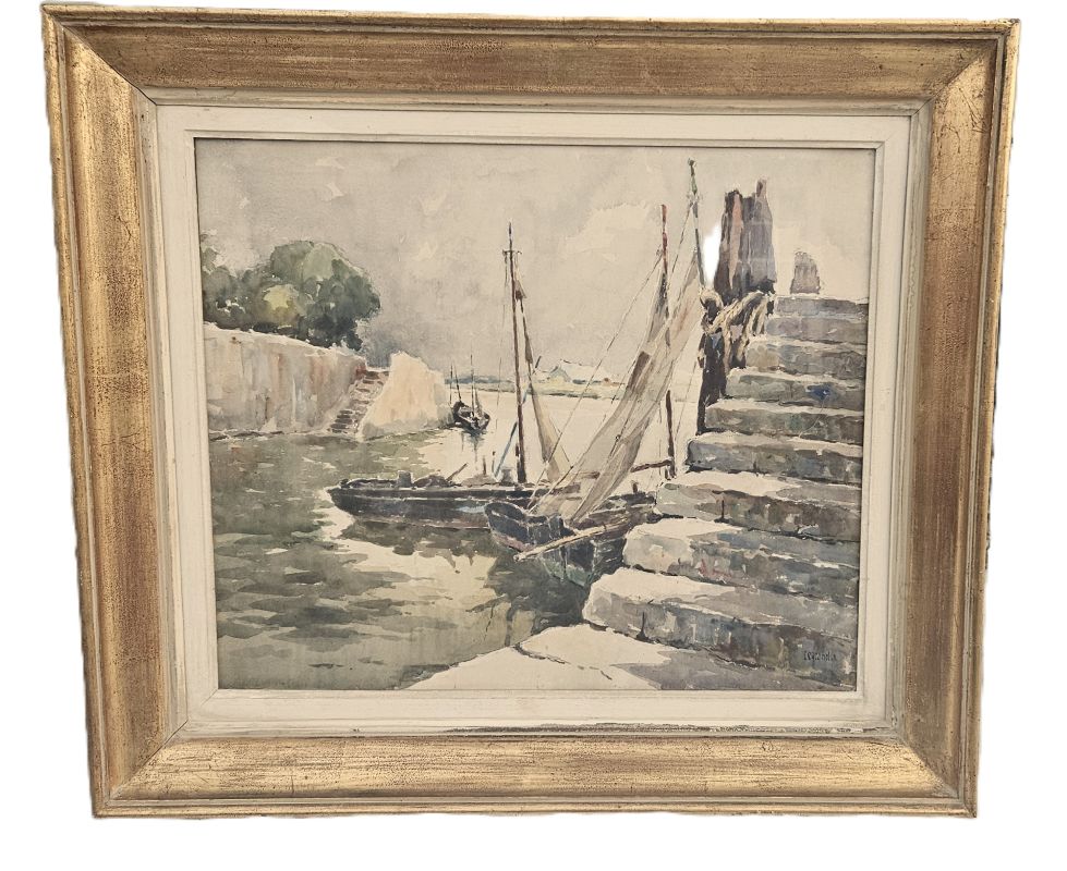 Grande aquarelle marine signée en bas à droite LEGRAND …. Il est noté au dos : Béziers le 5 décembre 1955 – en toute affection. Elle est protégée par un verre. Elle est entourée d’un simple cadre en bois doré avec quelques petits manques. Bon état.