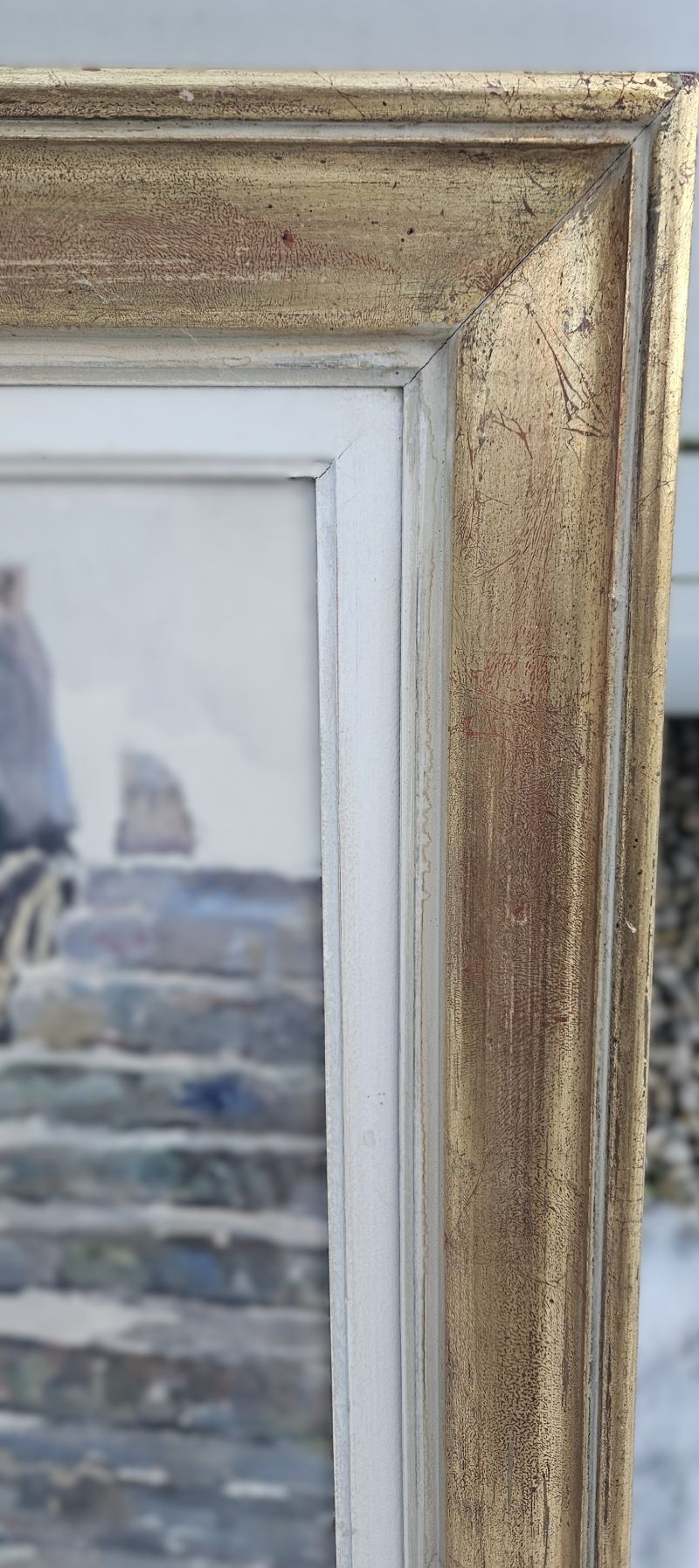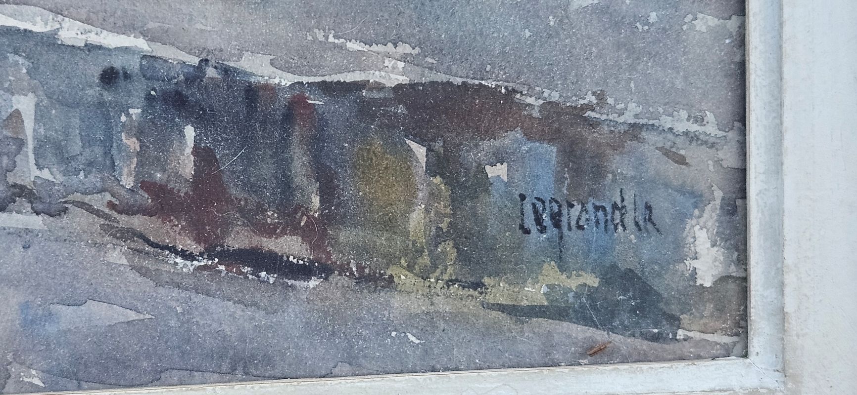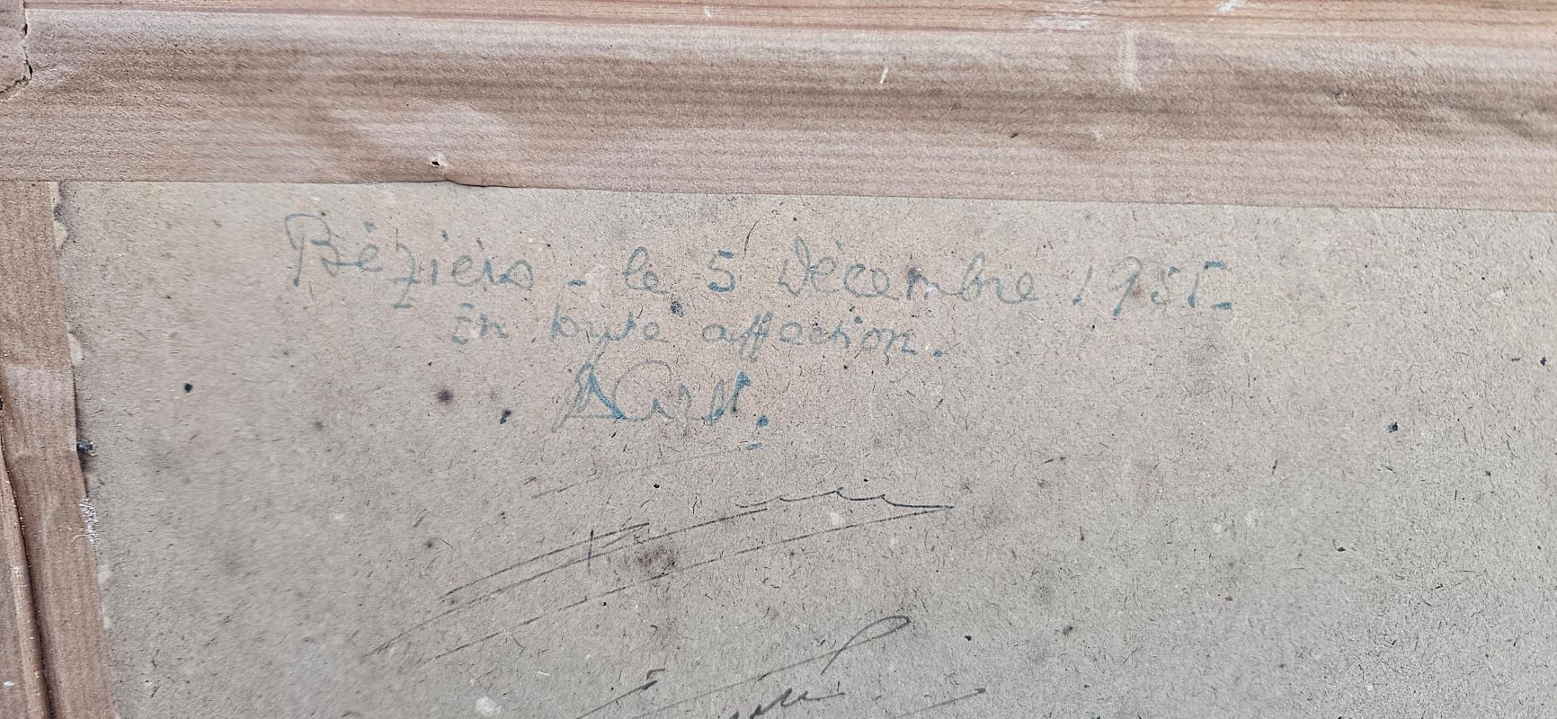 Grande aquarelle marine signée en bas à droite LEGRAND …. Il est noté au dos : Béziers le 5 décembre 1955 – en toute affection. Elle est protégée par un verre. Elle est entourée d’un simple cadre en bois doré avec quelques petits manques. Bon état.