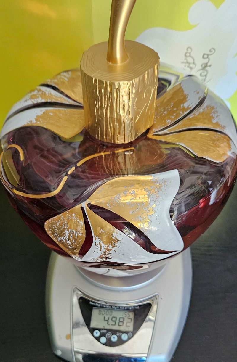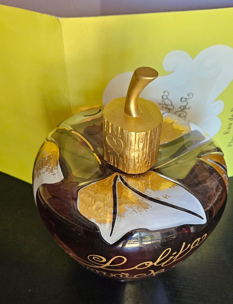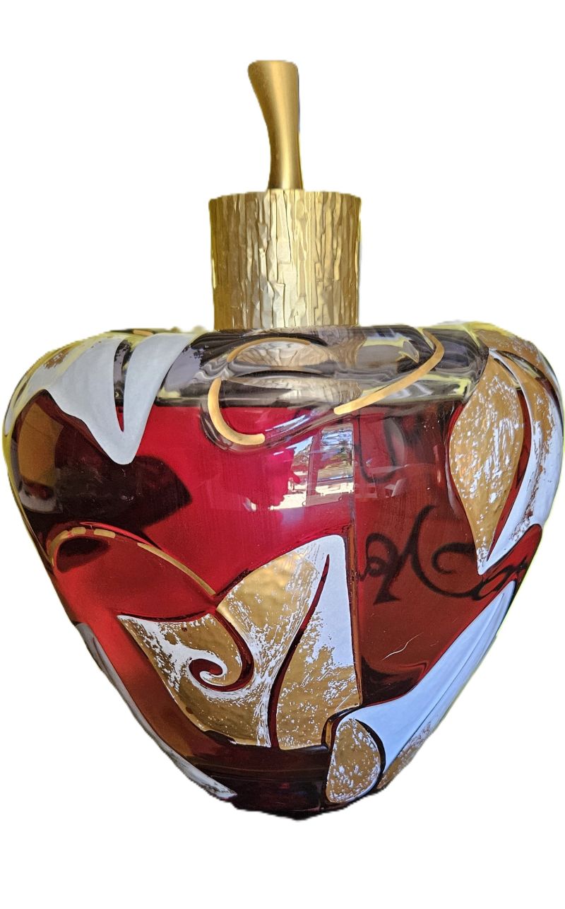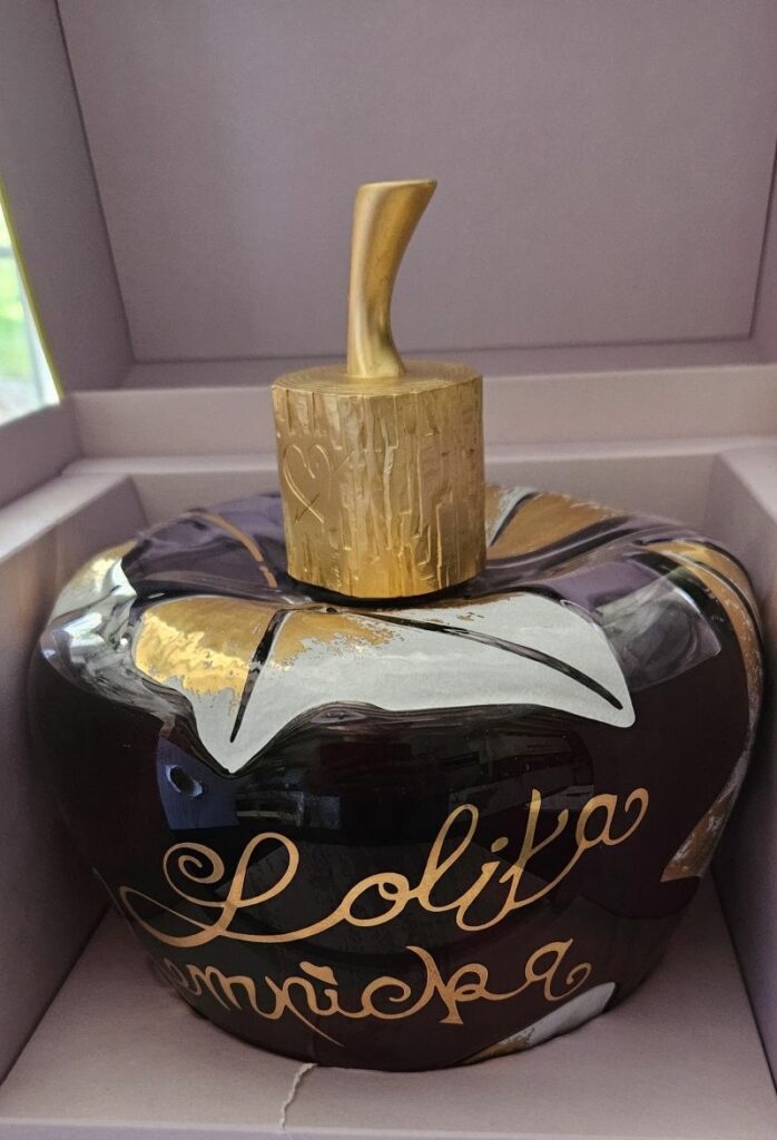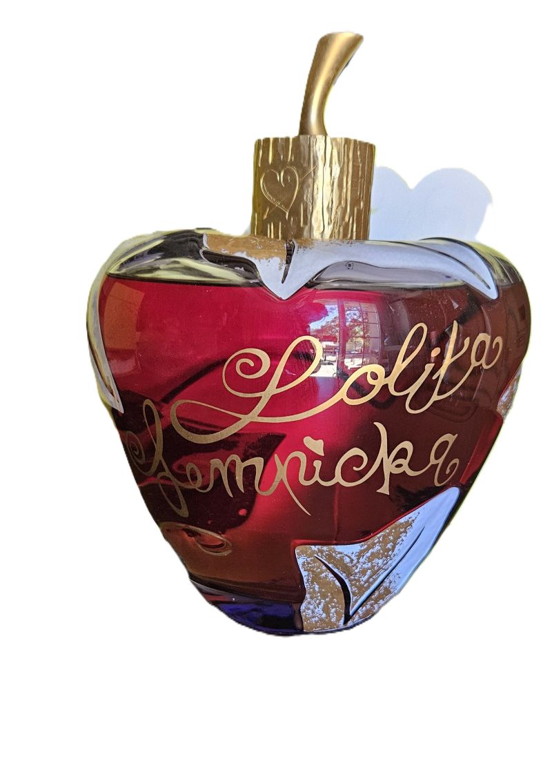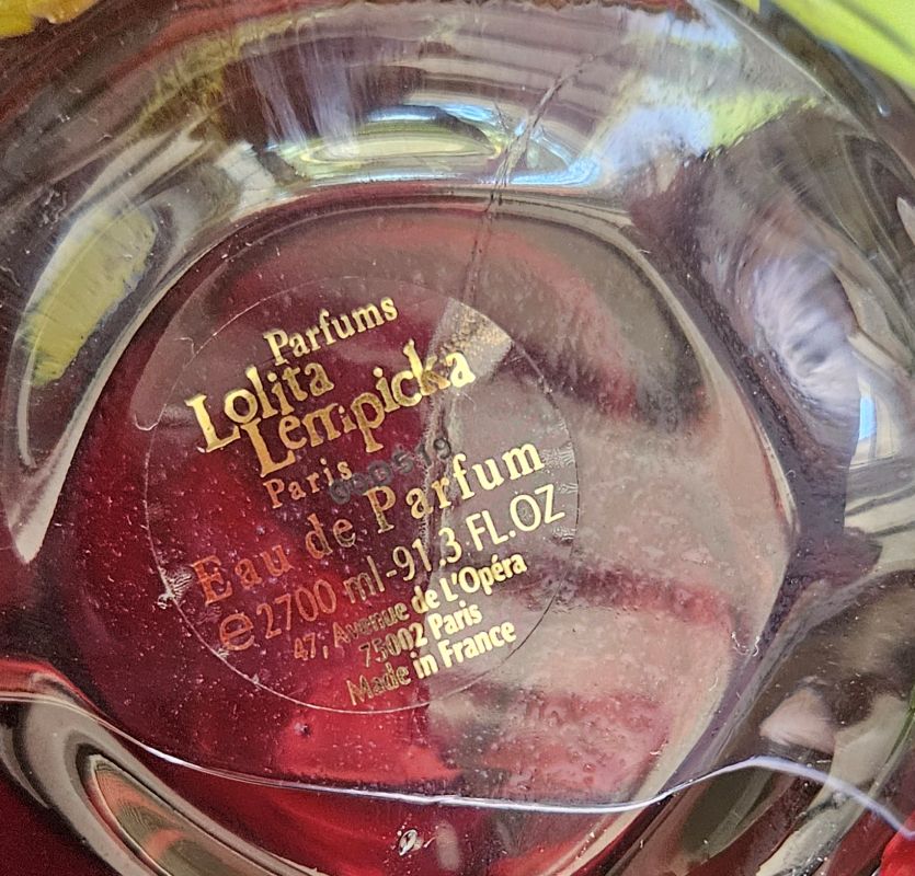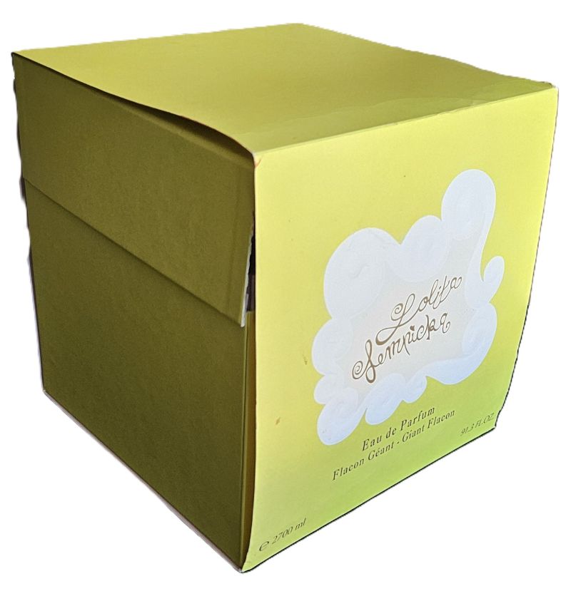 Original flacon de parfum géant factice « premier parfum » de Lolita Lempicka.Objet rare avec sa boîte de présentation d’origine. En très bon état avec son liquide coloré d’origine (qui n’est pas du parfum). La pomme contient environ 2,700 L. La boîte quant à elle, présente de petites déchirures sans gravité. Très bel objet de collection !