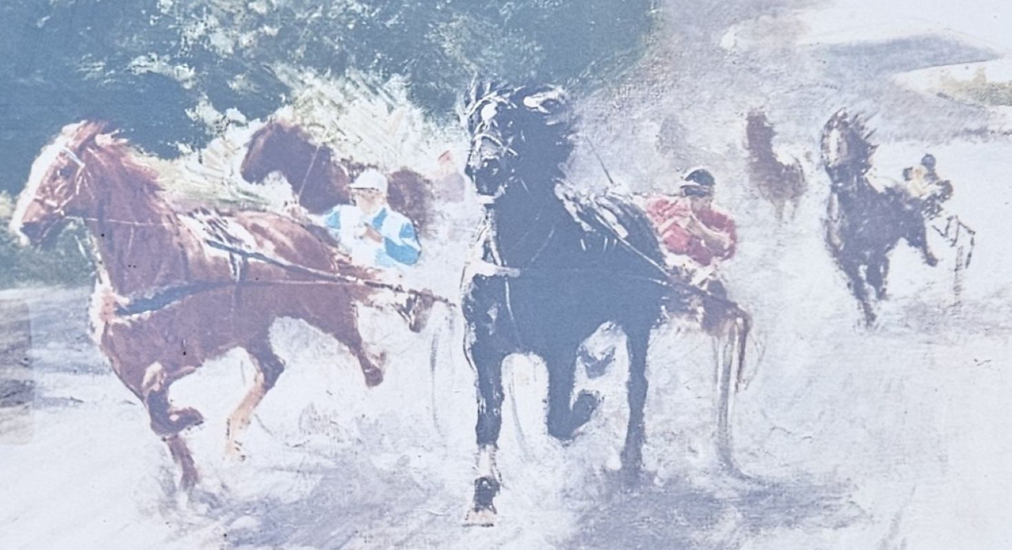 Paris – célèbre hippodrome, construit en 1863 et restauré/reconstruit en 1879 après la guerre franco-prussienne. En 1934, il était dédié aux courses de trot et de trot attelé comme le montre cette oeuvre. En 1920, le prix d’Amérique s’y est déroulé.