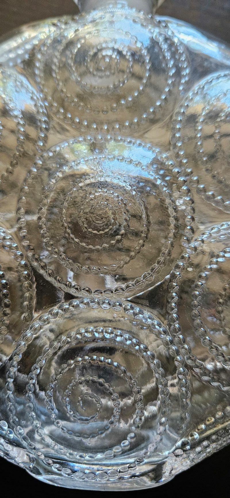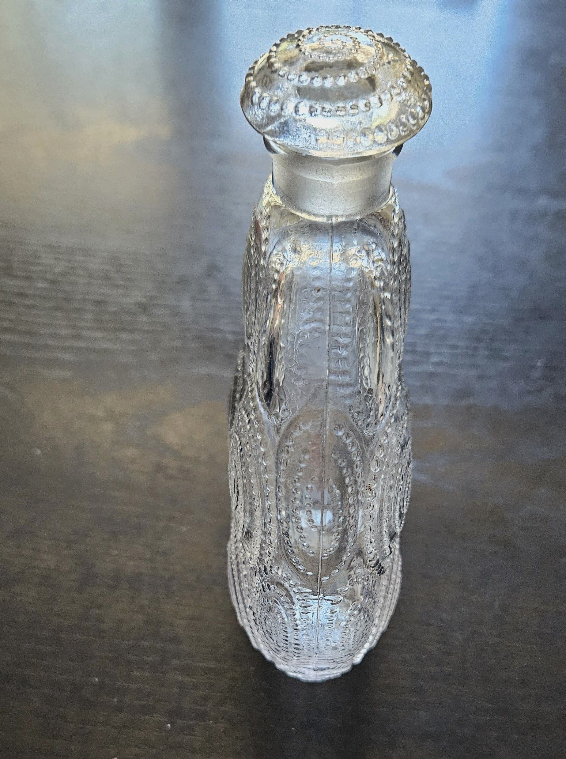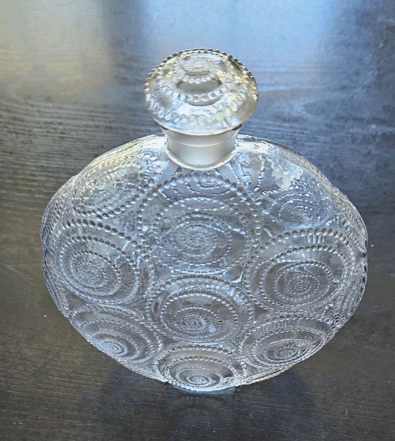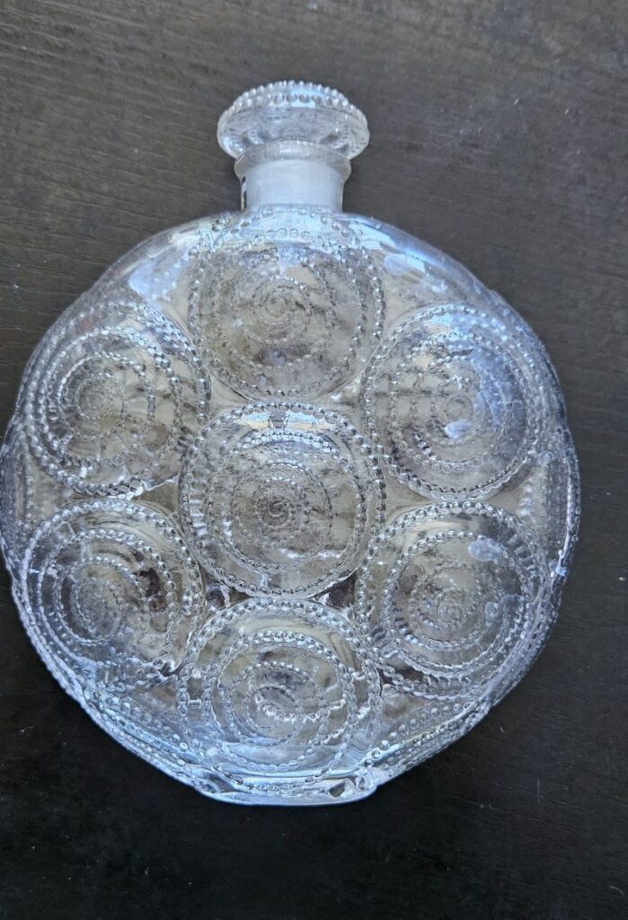 Créé et réalisé par René LALIQUE en 1924, flacon a parfum en verre transparent de forme circulaire au corps aplati, il est décoré en relief, de spirales perlées. Modèle » RELIEF » pour les parfums FORVIL; en très bon état avec quelques traces à l’intérieur du flacon. Signature moulée sur le fond.