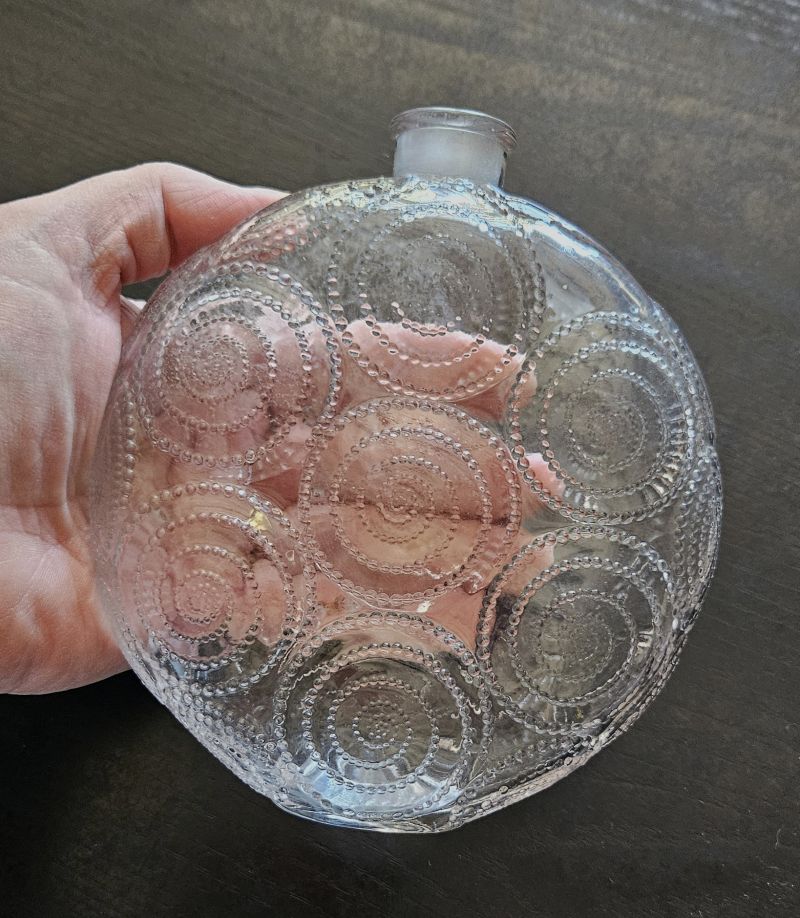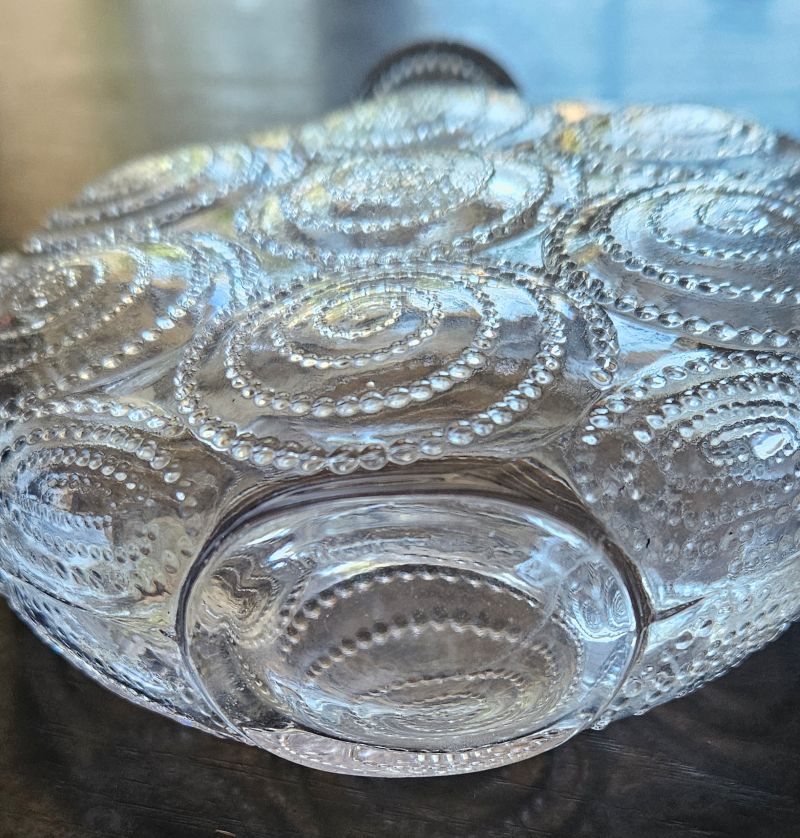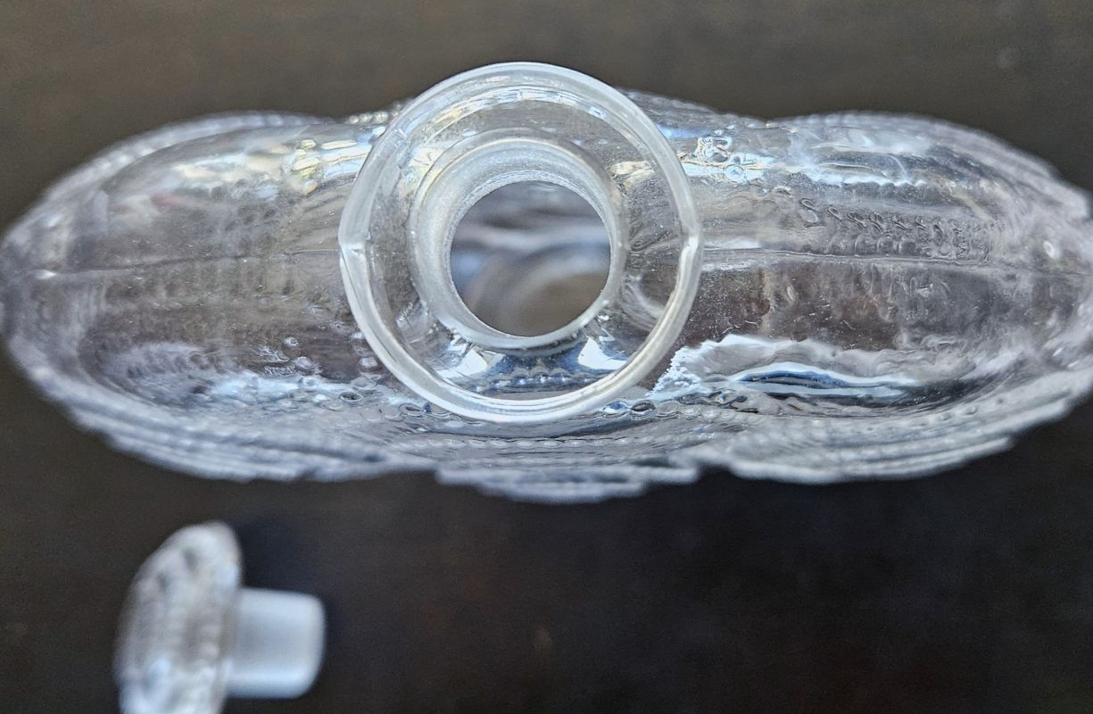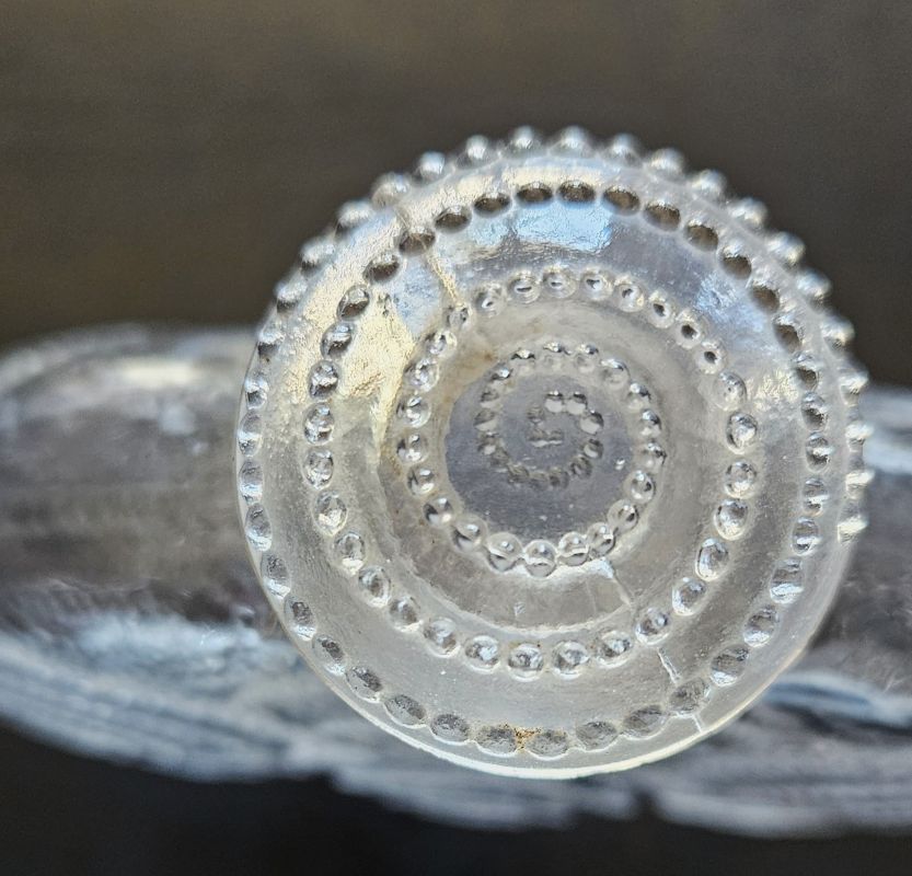 Créé et réalisé par René LALIQUE en 1924, flacon a parfum en verre transparent de forme circulaire au corps aplati, il est décoré en relief, de spirales perlées. Modèle » RELIEF » pour les parfums FORVIL; en très bon état avec quelques traces à l’intérieur du flacon. Signature moulée sur le fond.