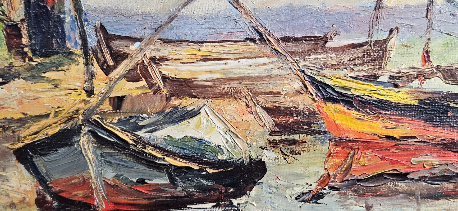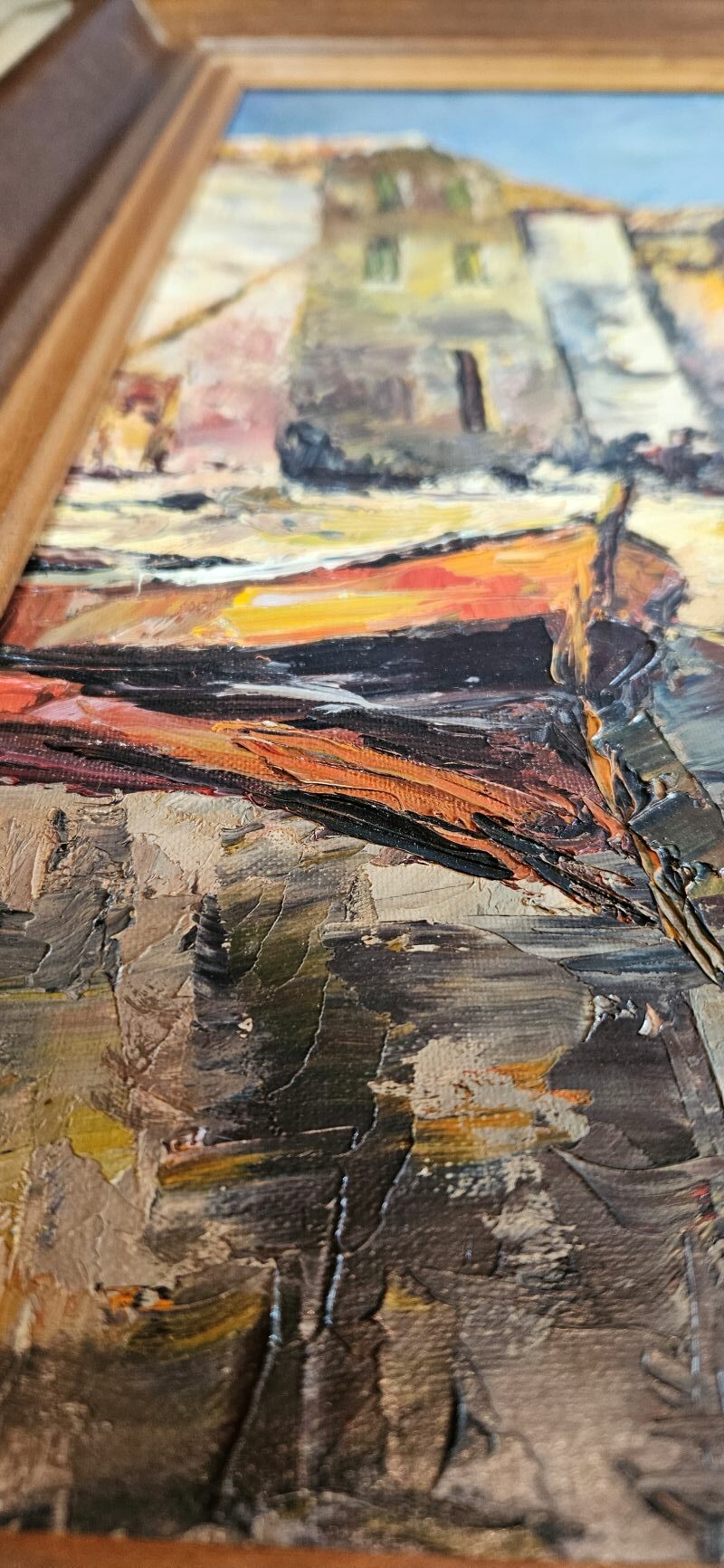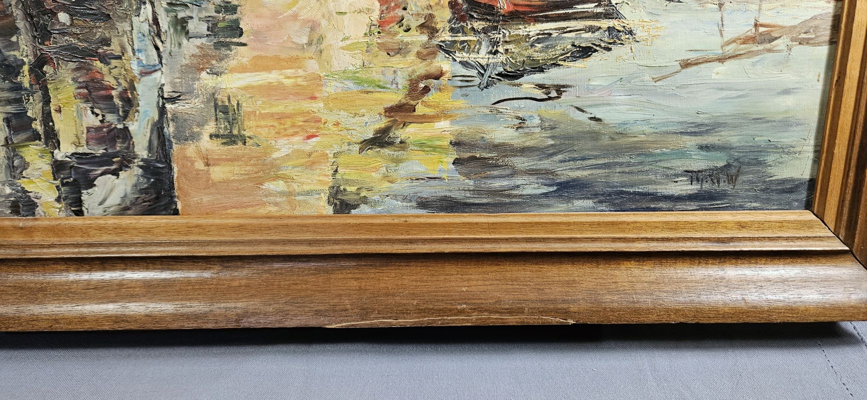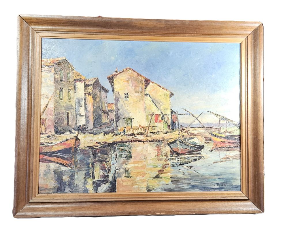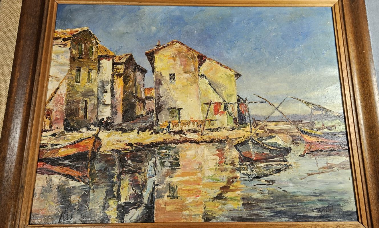 Grande huile sur toile représentant « le port de Martigues » Provence signée en bas à droite Th. H.W. Couleurs chaleureuses de la Provence. Matière plus épaisse sur certains sujets. Petit enfoncement de la toile en partie haute peu visible. Cadre en bois naturel avec de petits accidents. Vers 1950