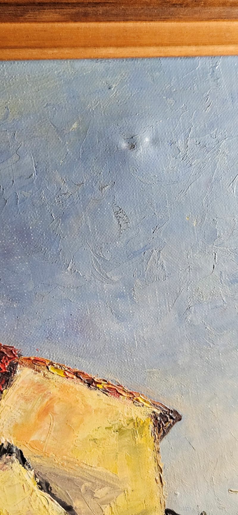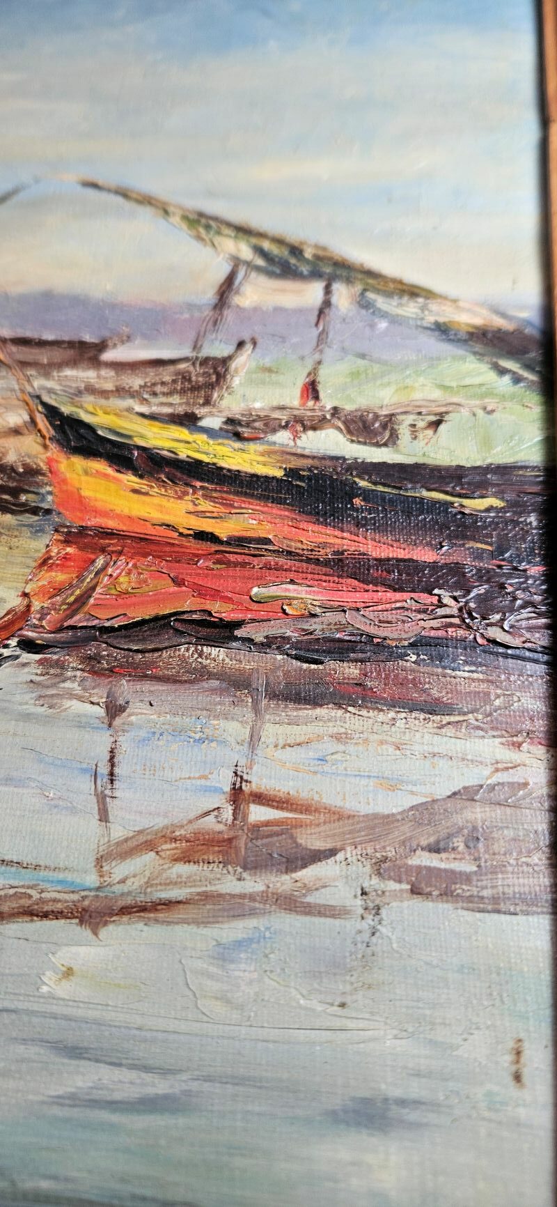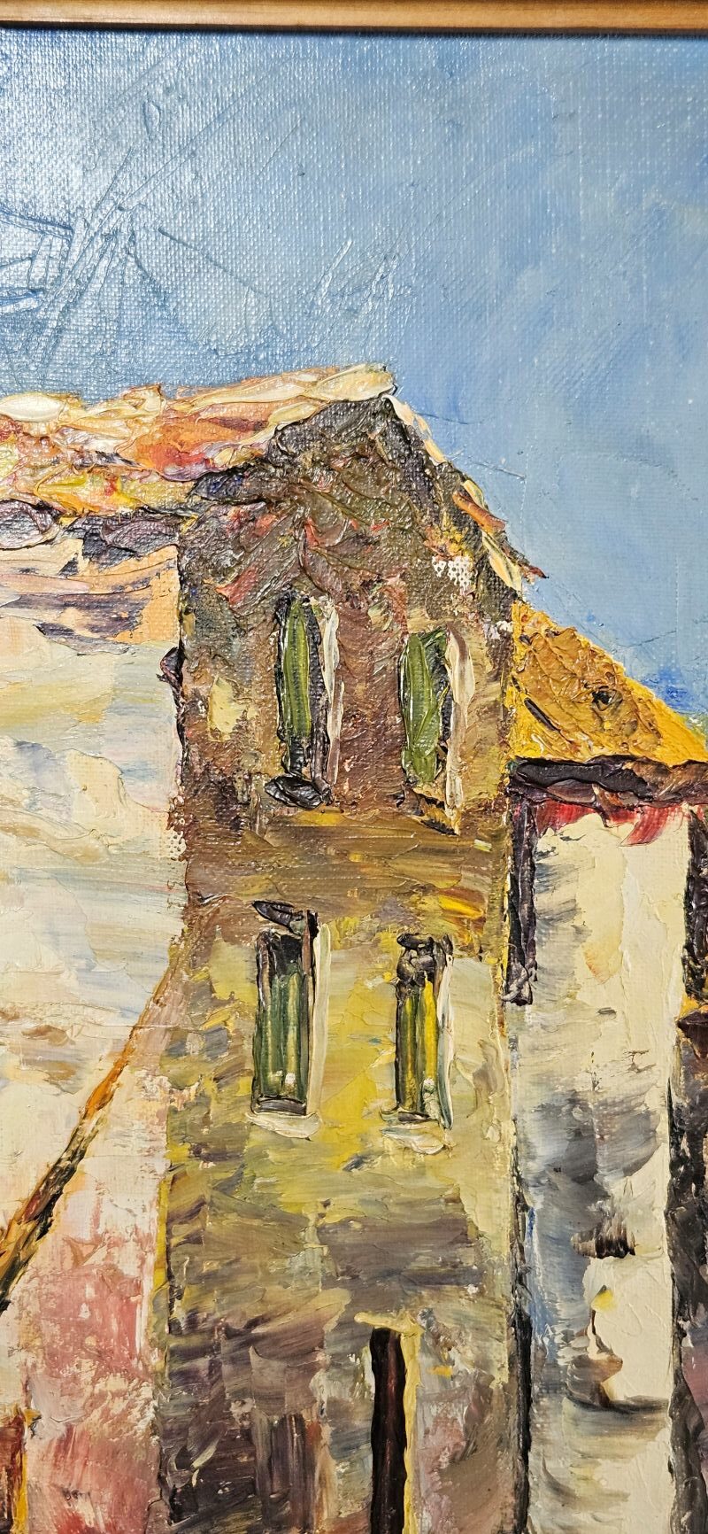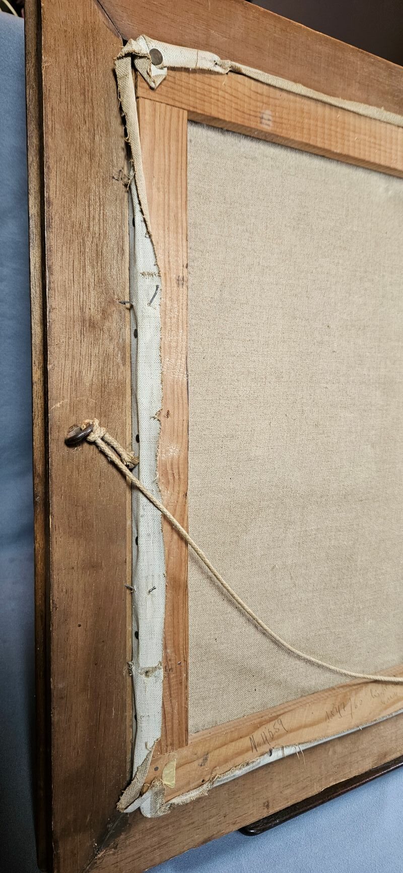 Grande huile sur toile représentant « le port de Martigues » Provence signée en bas à droite Th. H.W. Couleurs chaleureuses de la Provence. Matière plus épaisse sur certains sujets. Petit enfoncement de la toile en partie haute peu visible. Cadre en bois naturel avec de petits accidents. Vers 1950
