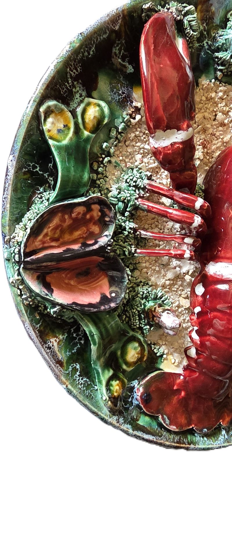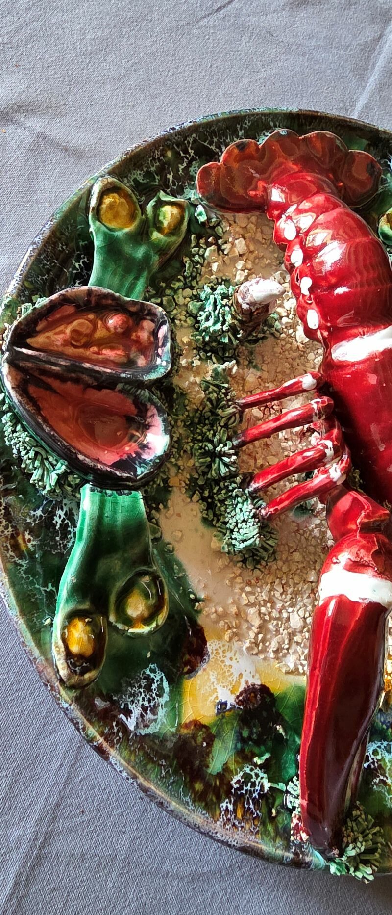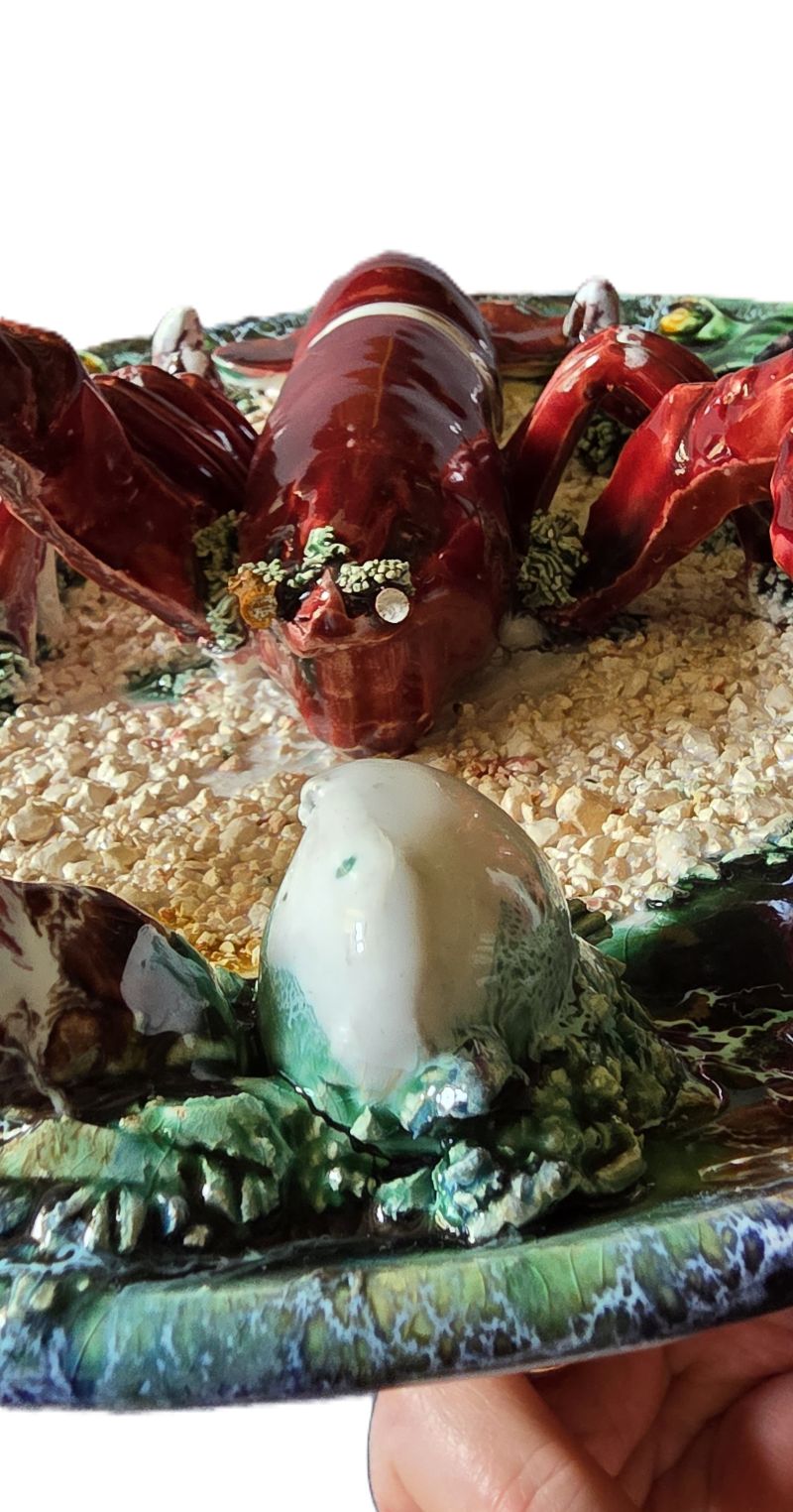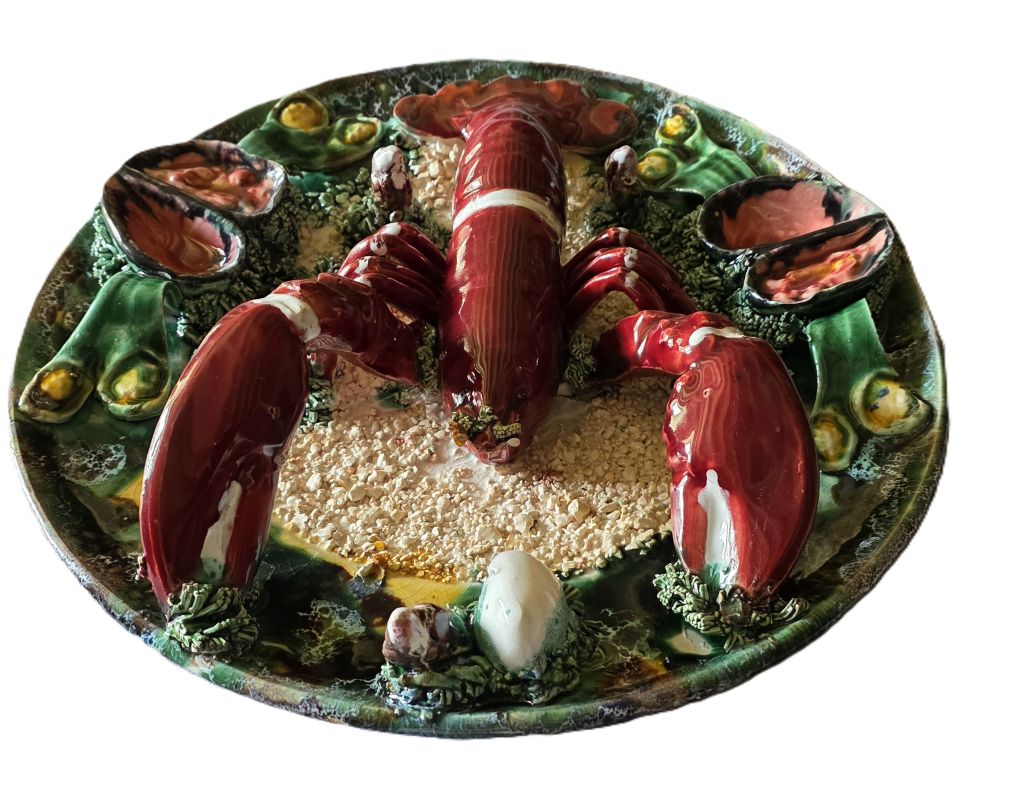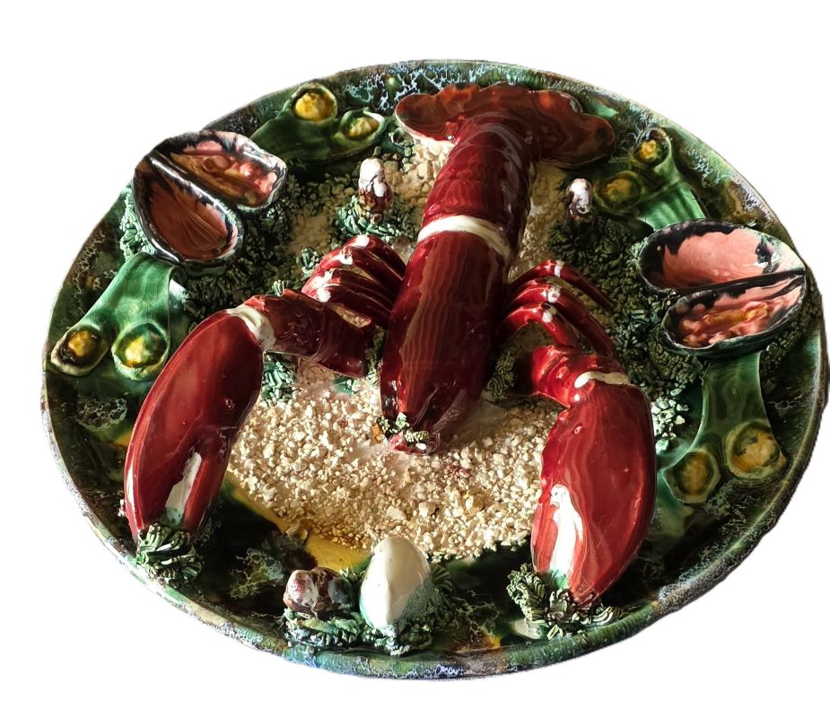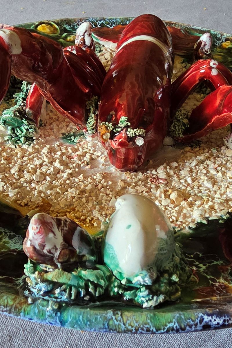 Original et vintage a souhait, grand plat majolique en faïence à décor en trompe l’oeil d’un homard, mollusques et coquillages sur fond sablonneux. Couleurs très vives et sujet très réaliste. Vers 1950. Pas de marque. Bon état avec un manque : une antenne est cassée. Ce type de création, très en vogue dans les années 1950, correspond à la découverte de la Côte d’Azur par le grand public grâce, notamment aux acteurs de cinéma et du milieu de l’art.